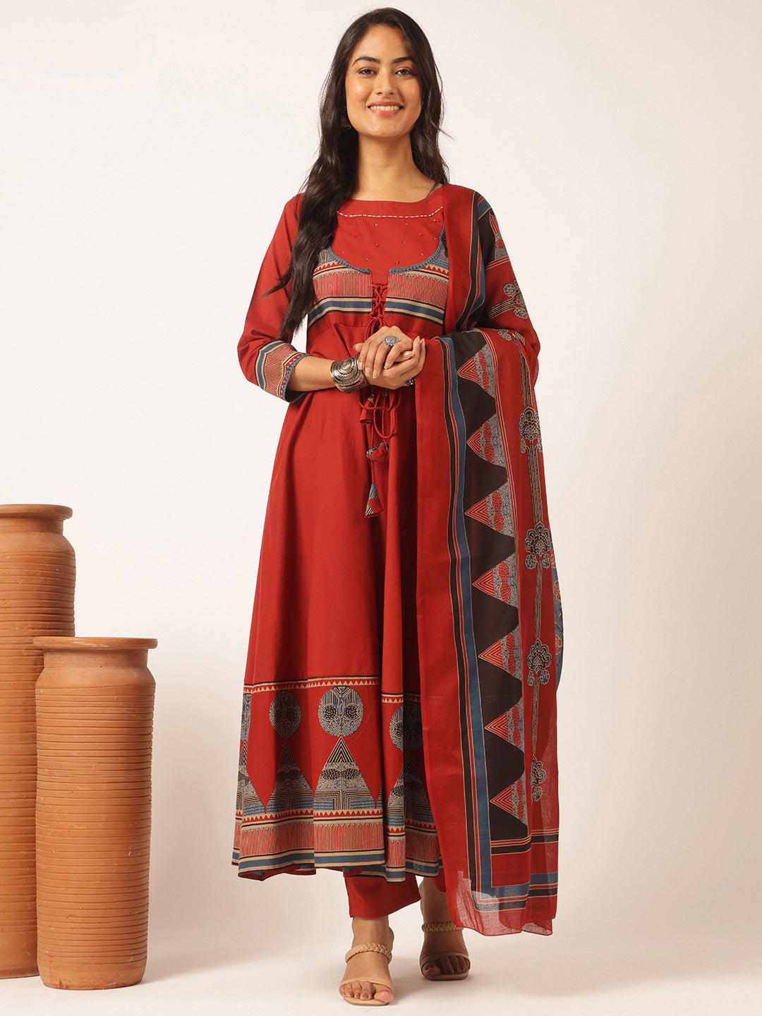 Get geometrically stylish in our Maroon Cotton Anarkali Kurta Set! Made from soft, breathable cotton, this set features a playful geometric print that adds a pop of personality to your wardrobe. Perfect for any occasion, this kurta set is a must-have for any fashion-forward individual. (Warning: wearing this may cause repeated compliments!)