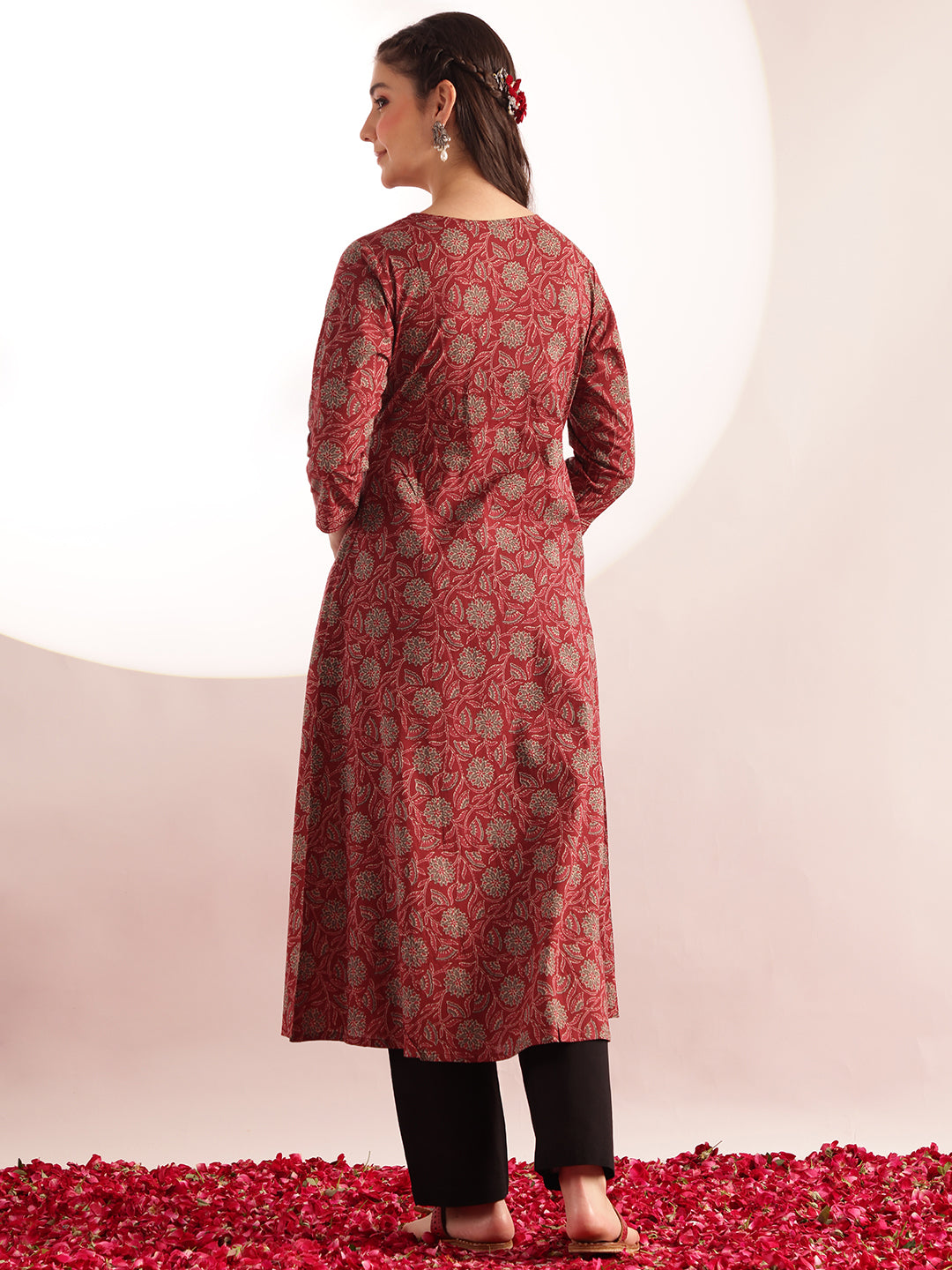 Maroon Floral Print Fit & Flare Cotton Kurta