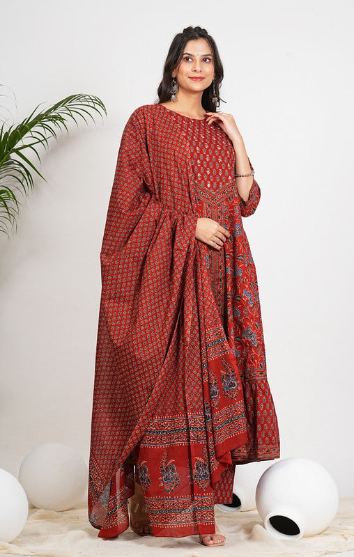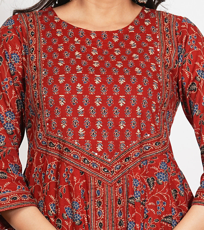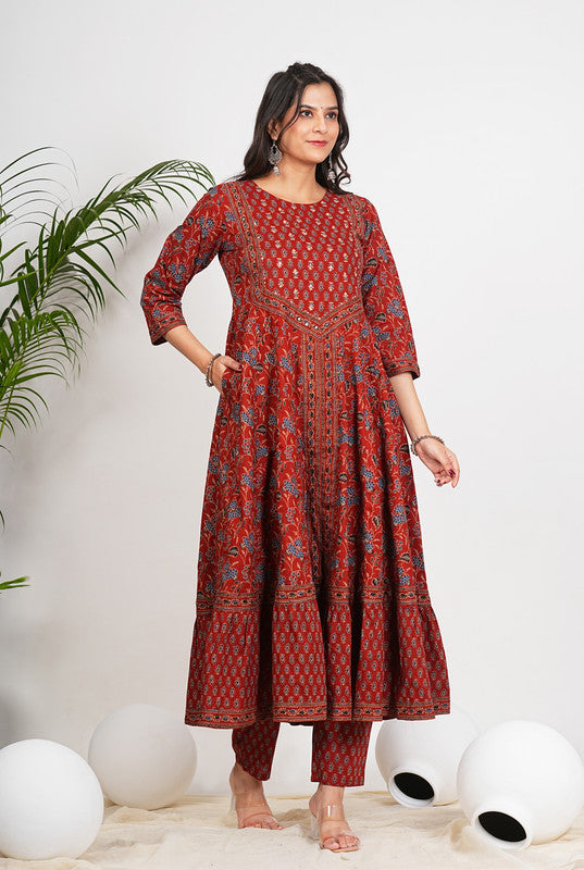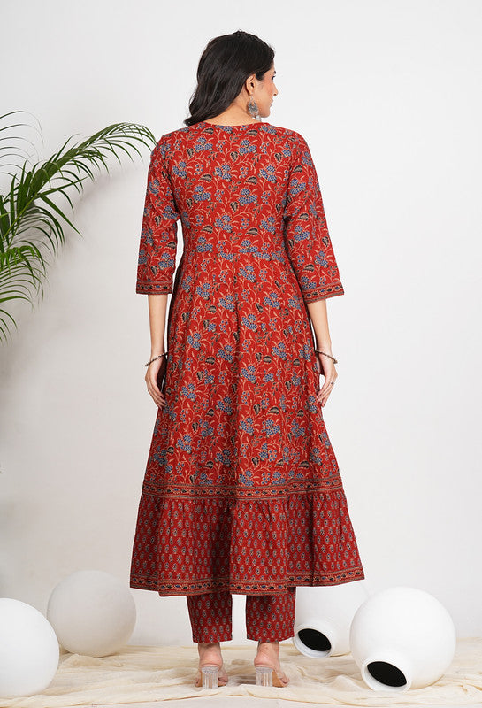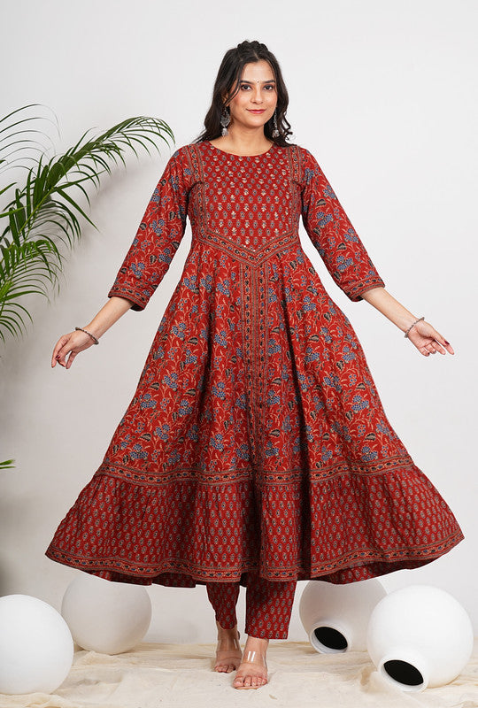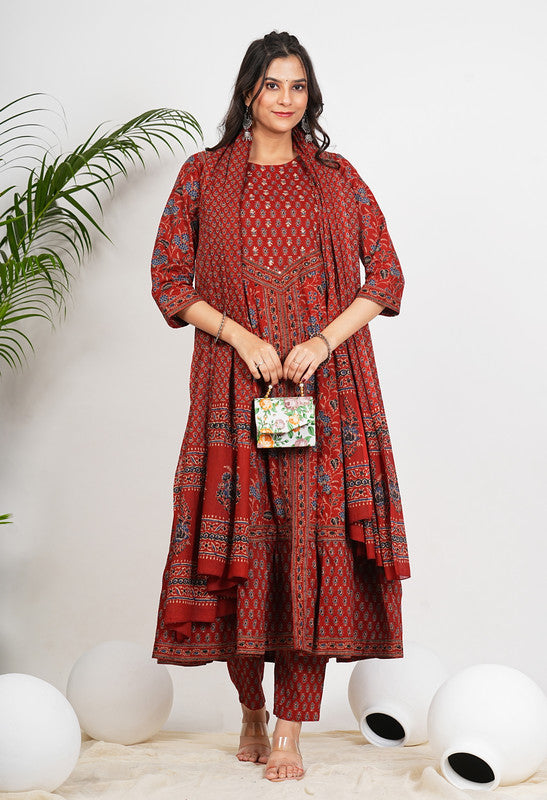 Maroon Floral Print With Ruffled Anarkali Cotton Stitched Kurta Set