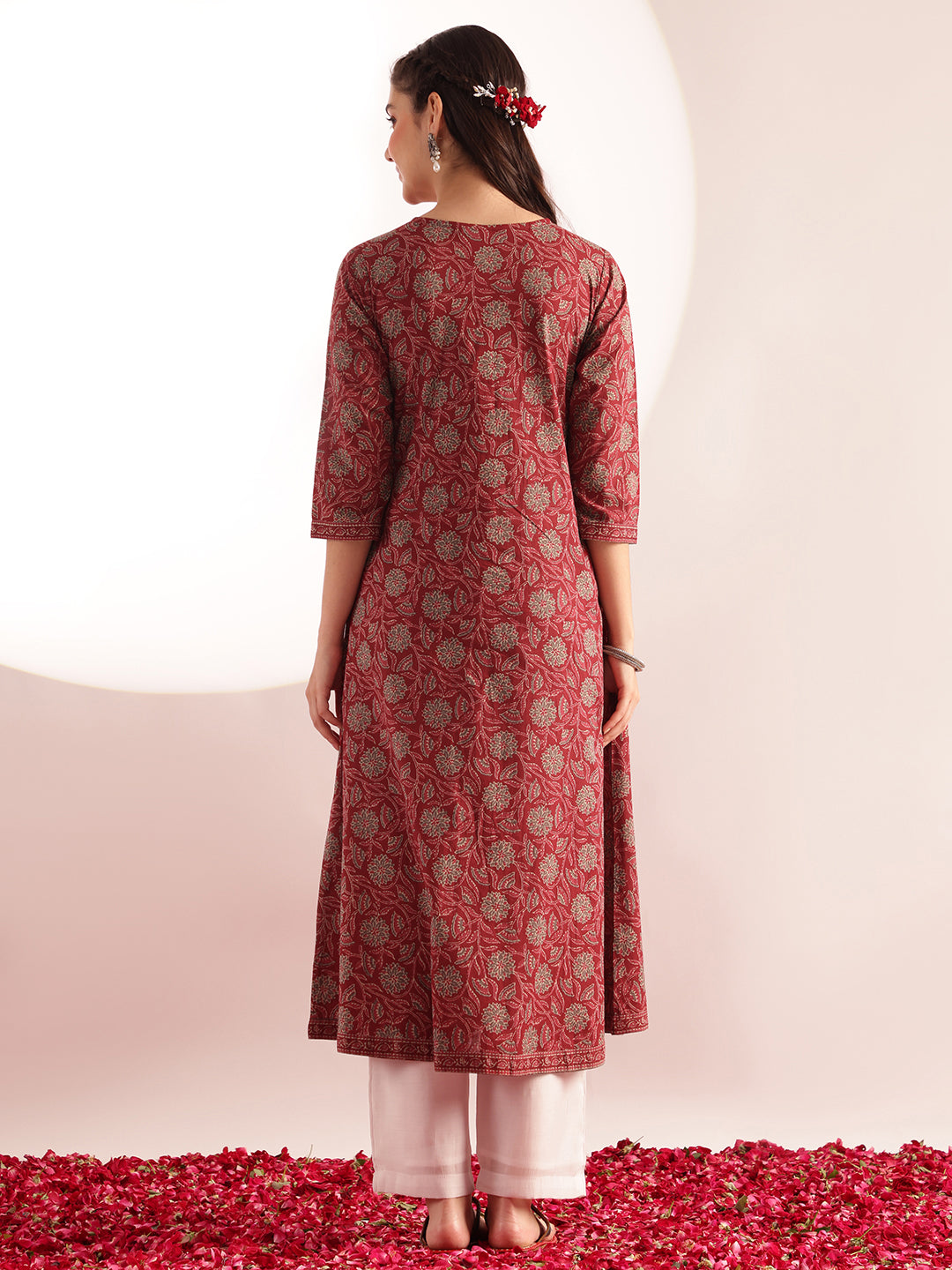 Experience comfort and style with this Maroon Floral Printed A-Line Cotton Kurta. Crafted from breathable cotton, it ensures all-day comfort while the A-line silhouette flatters various body shapes. The delicate floral print adds a subtle elegance, making it perfect for both casual and semi-formal occasions. Ideal for warm weather, this kurta combines traditional charm with modern ease.