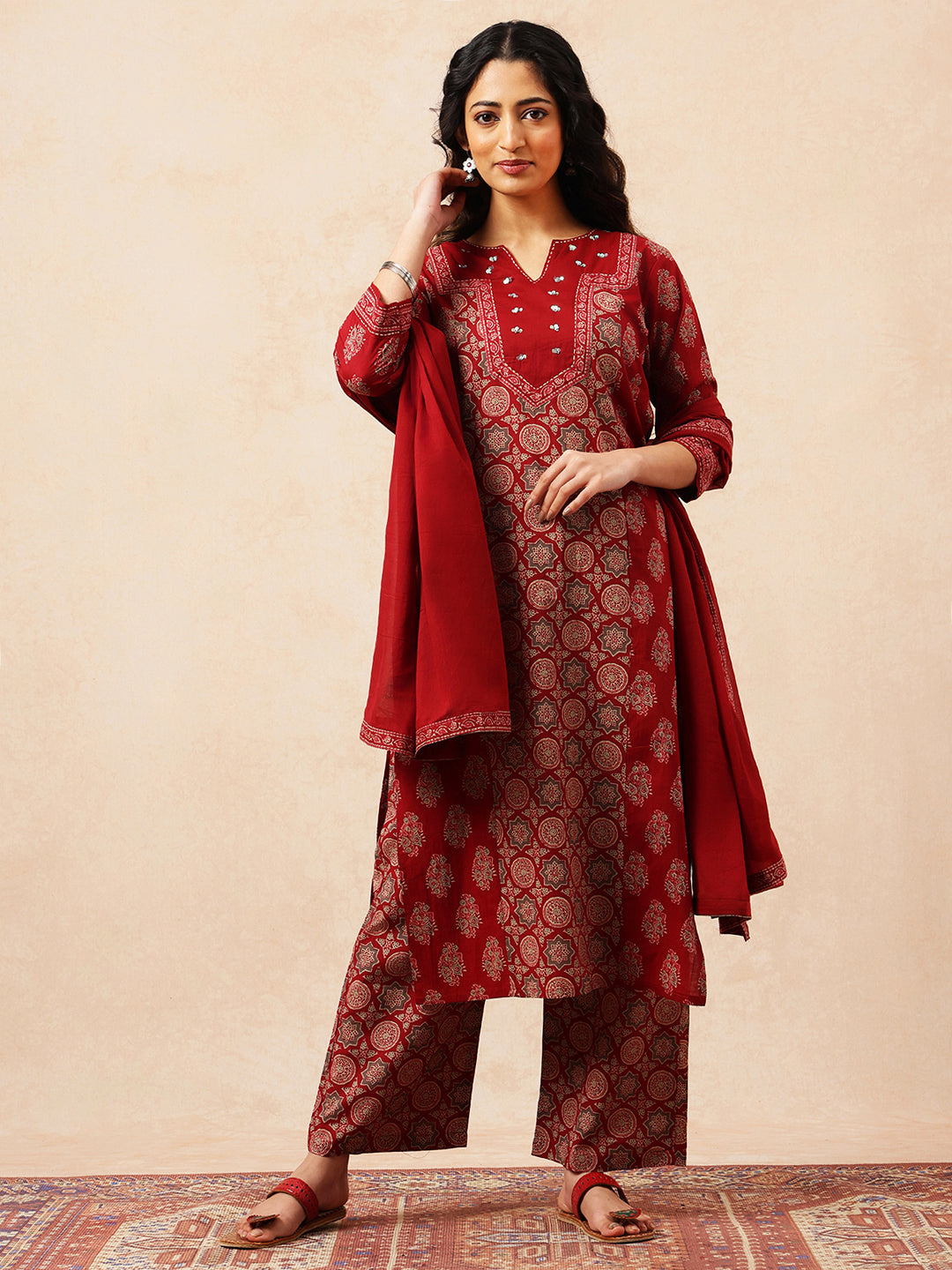 Invest in this distinguished maroon kurta set, engineered for those who appreciate quality and cultural authenticity. Constructed from pure cotton, this three-piece collection delivers a geometrically embellished straight kurta, coordinating palazzo bottoms, and a complementary dupatta. The fabric's natural fiber composition provides exceptional breathability and skin-friendly comfort, making it suitable for extended wear. Expert tailoring ensures precise seams and a flattering silhouette that maintains its integrity through repeated wear and washing. The versatile maroon shade transitions seamlessly across occasions—from festive celebrations to formal events and refined everyday styling. This ensemble represents a thoughtful wardrobe investment, combining heritage aesthetics with contemporary construction standards for the discerning individual seeking enduring style and substance.
