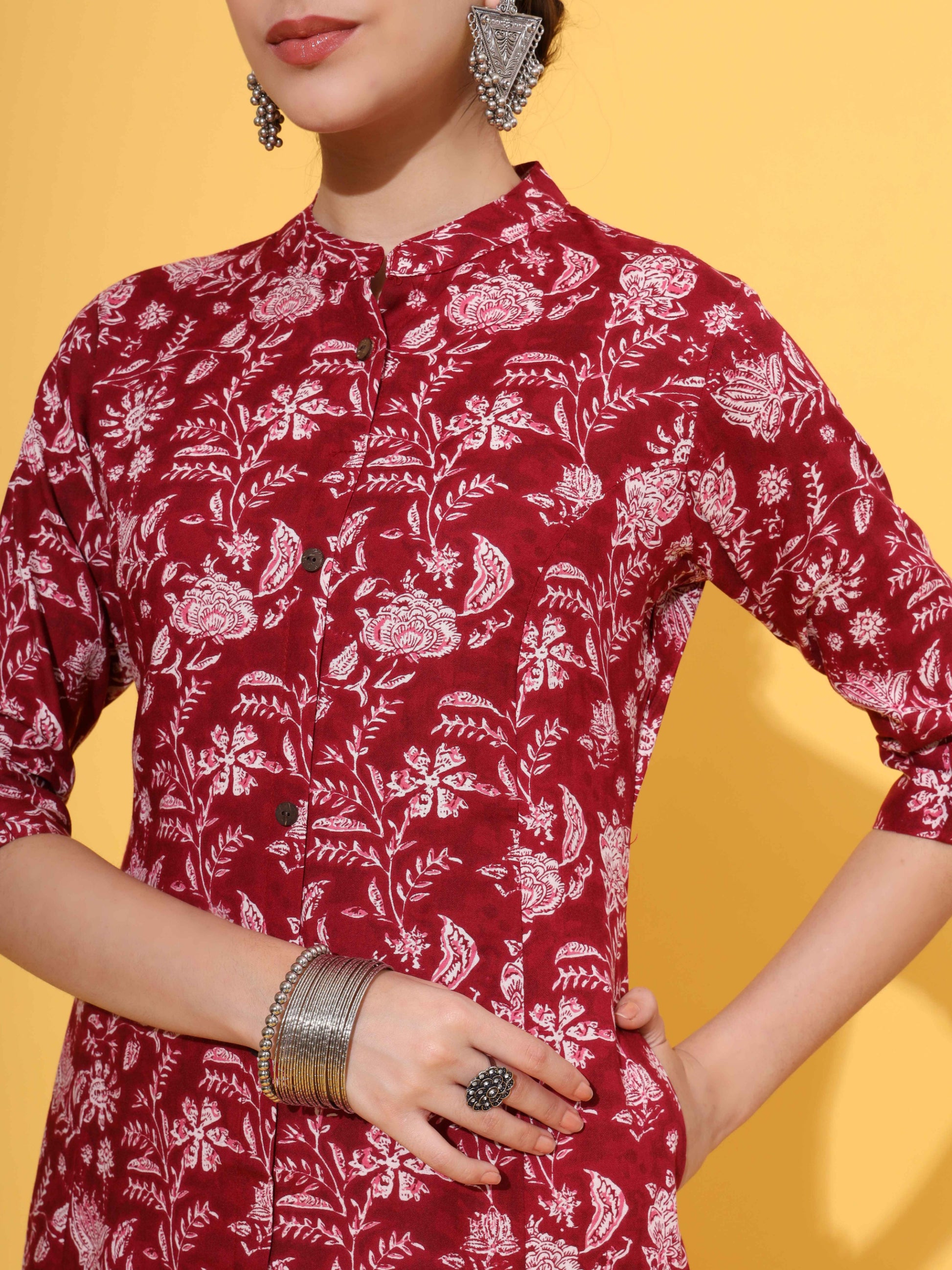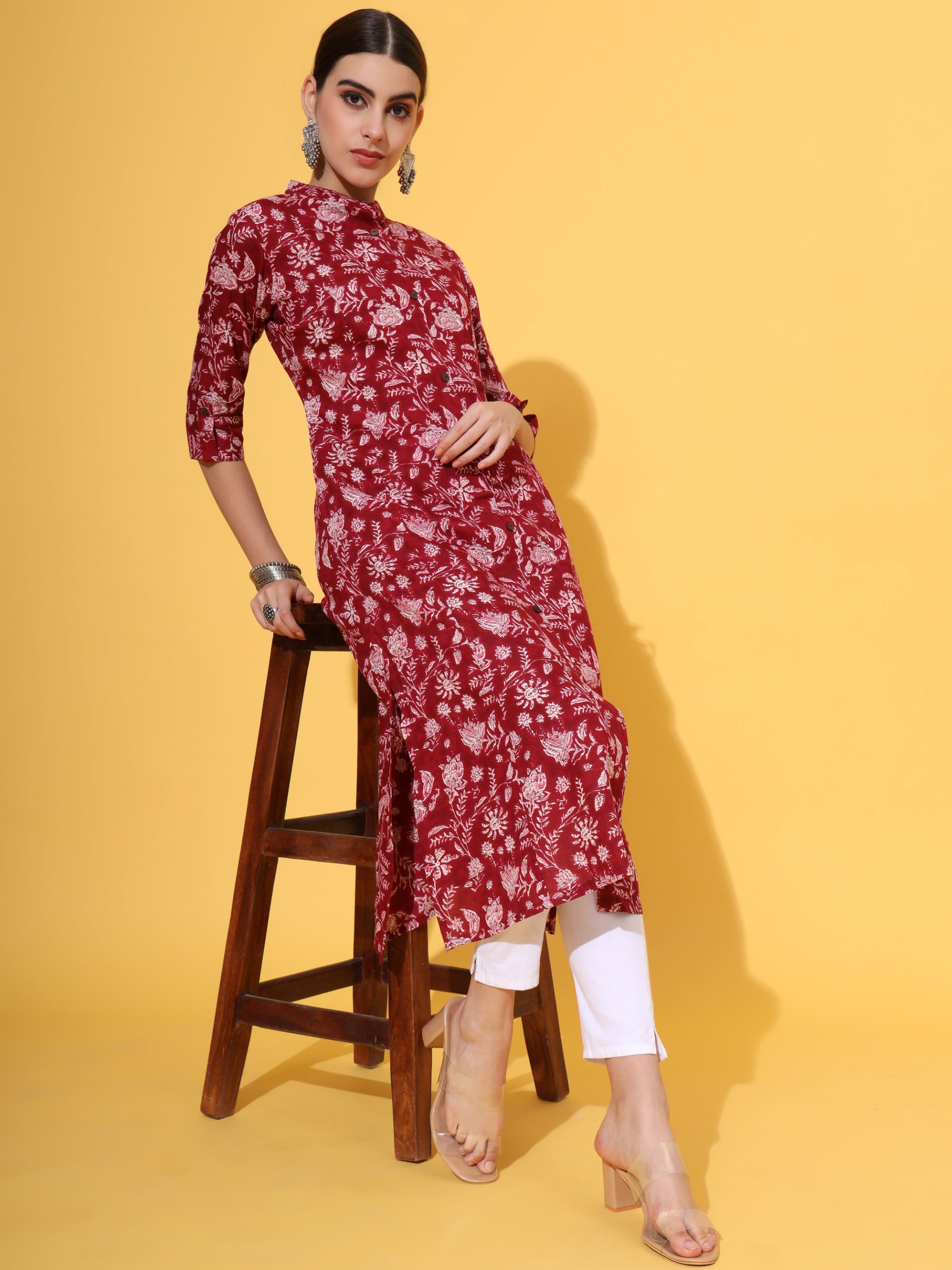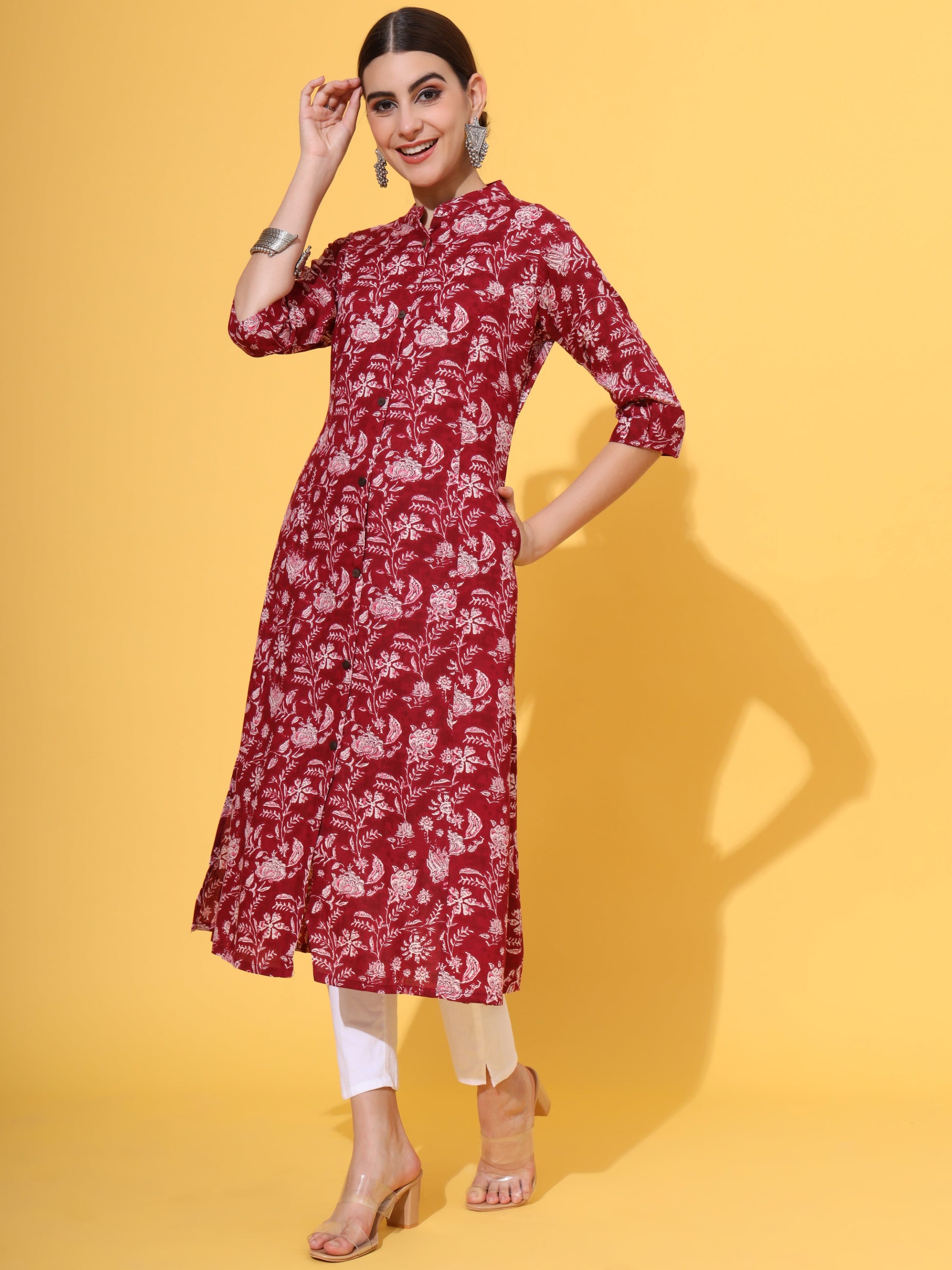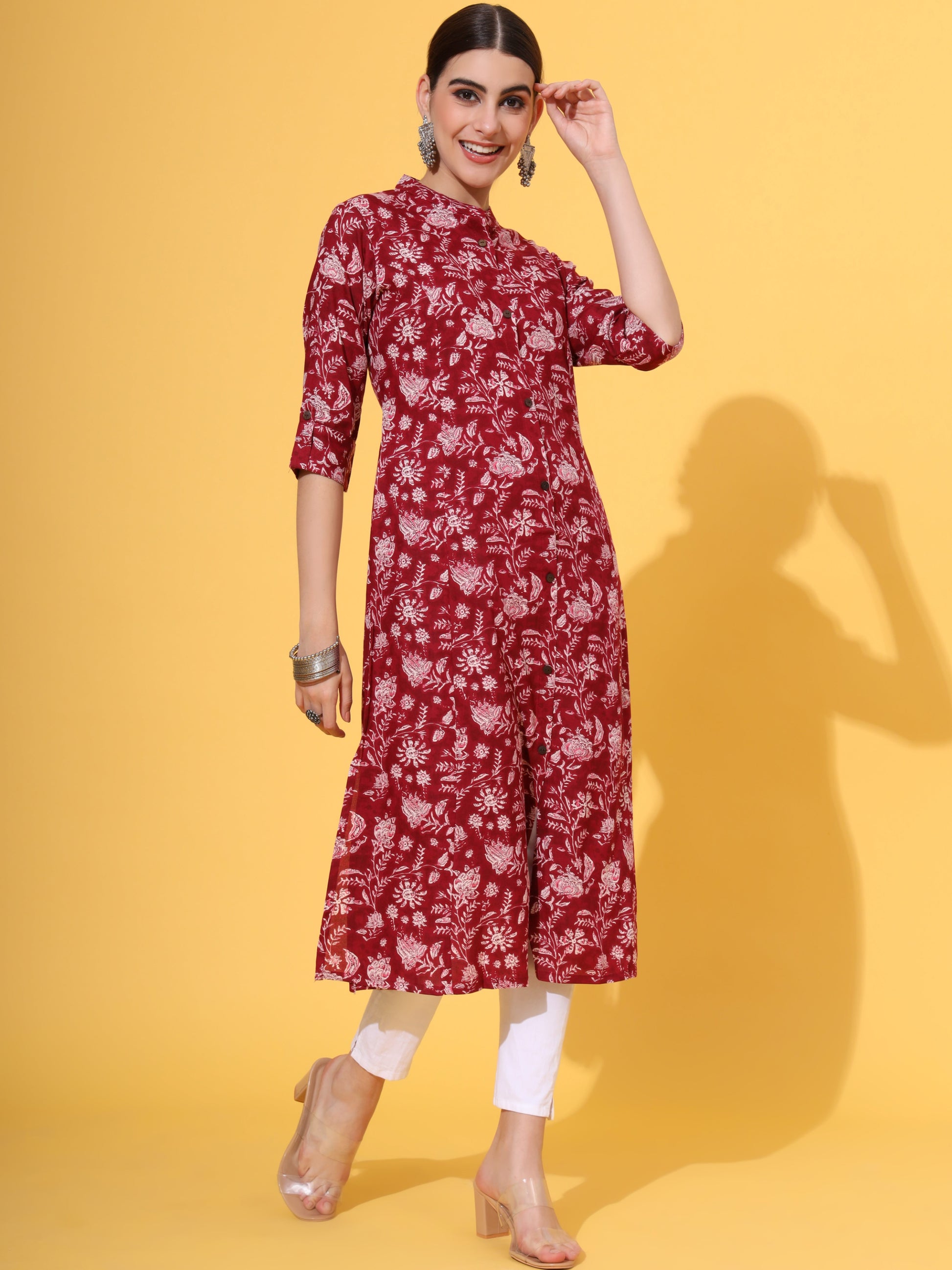 Look your best in this Maroon Rayon A-Line Kurta. Crafted from fabric which is lightweight and airy, this Kurta features an A-Line silhouette, floral print and buttons that add a touch of elegance. Perfect for casual wear!