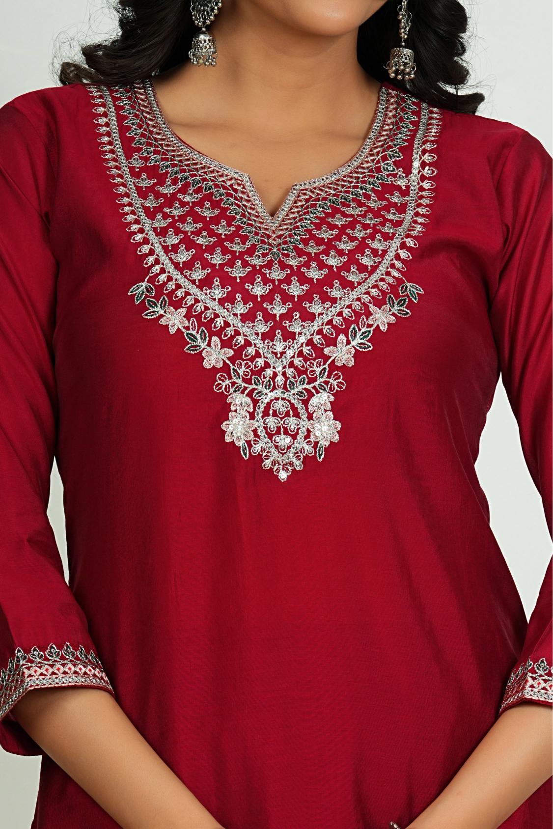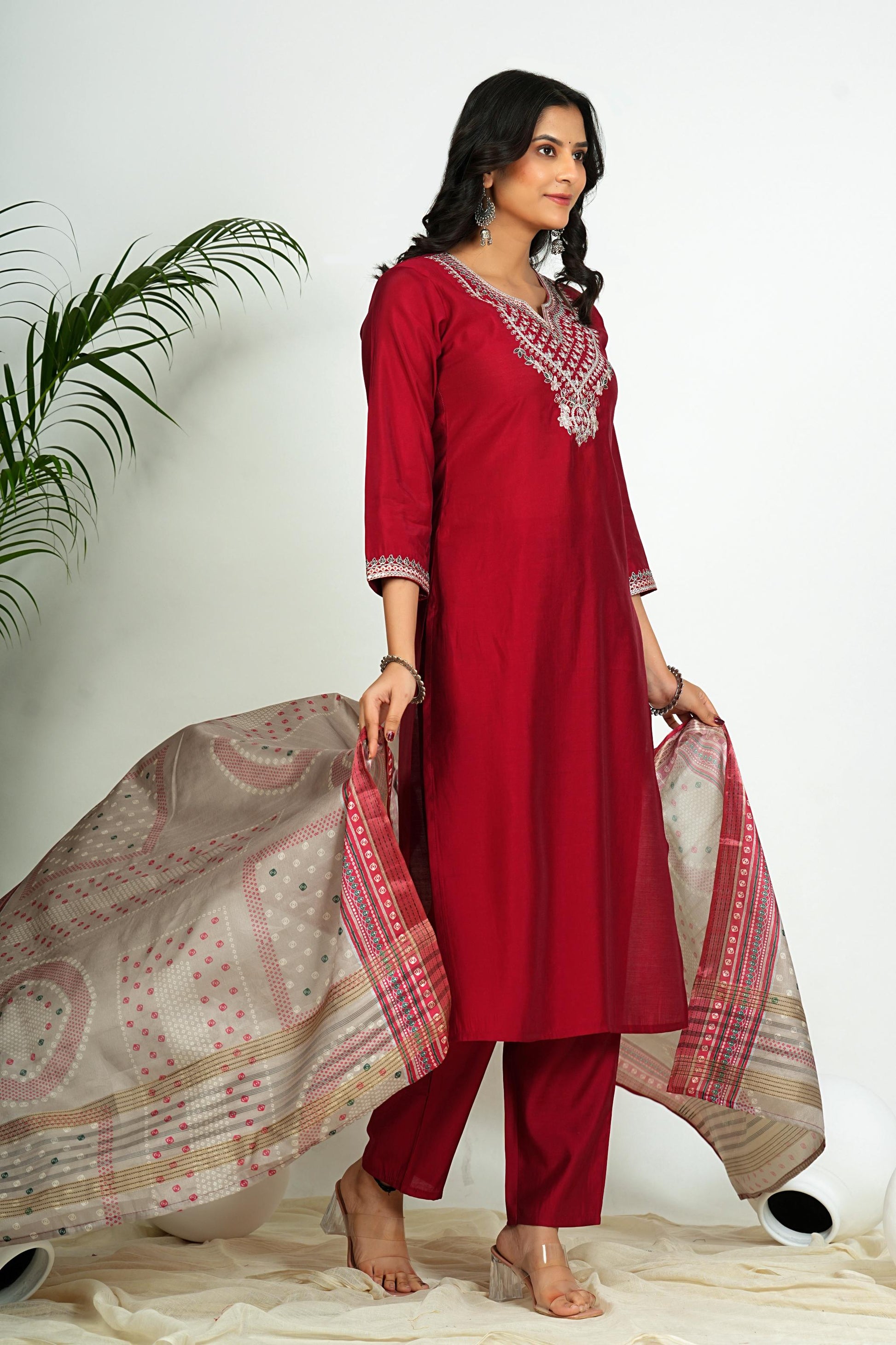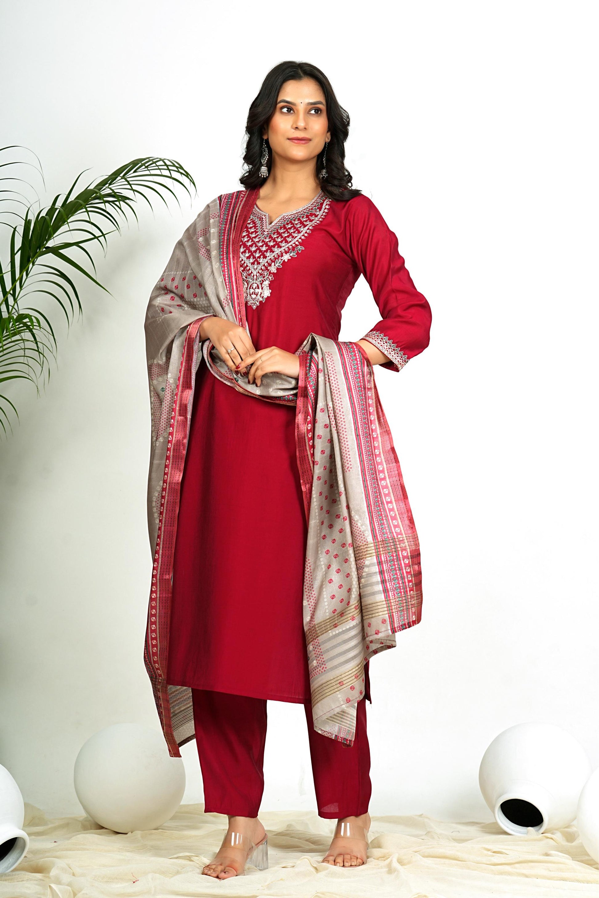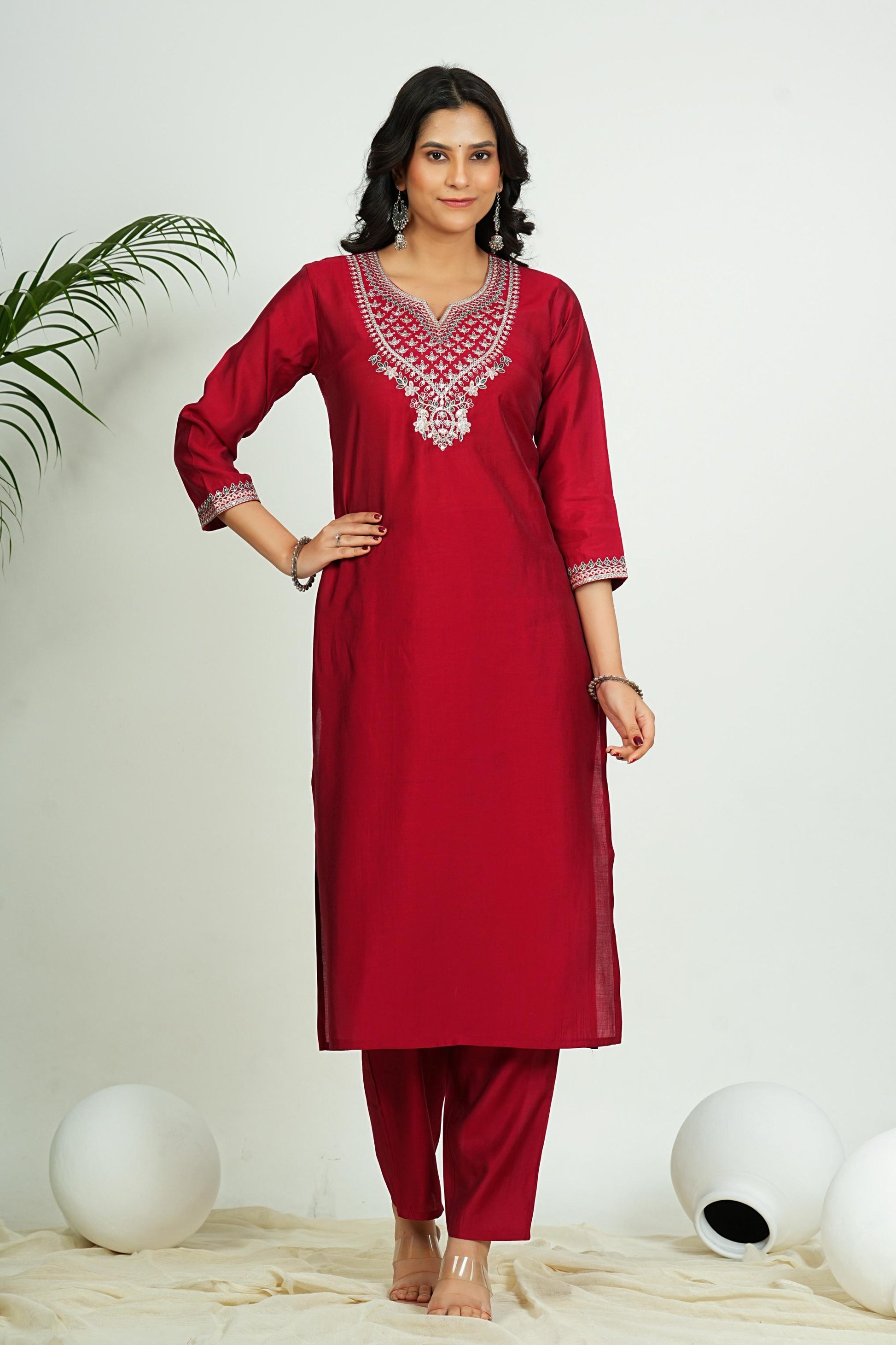 Maroon Solid With Zari Work Straight Roman Silk Kurta Set