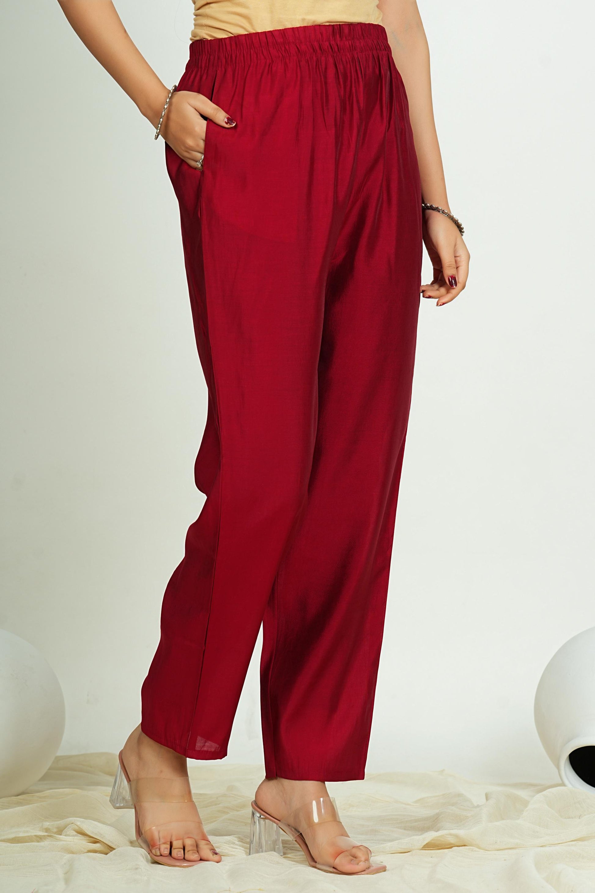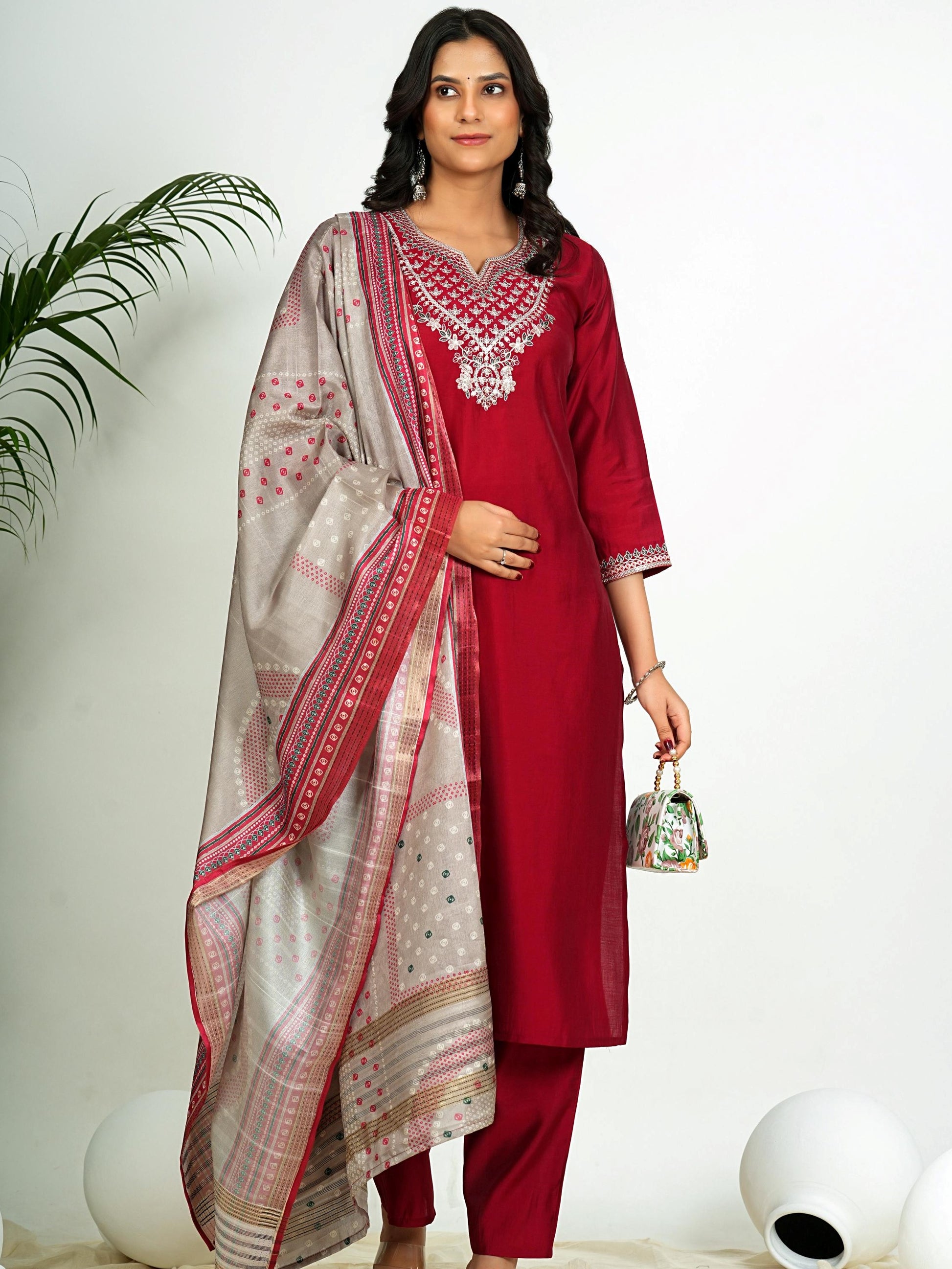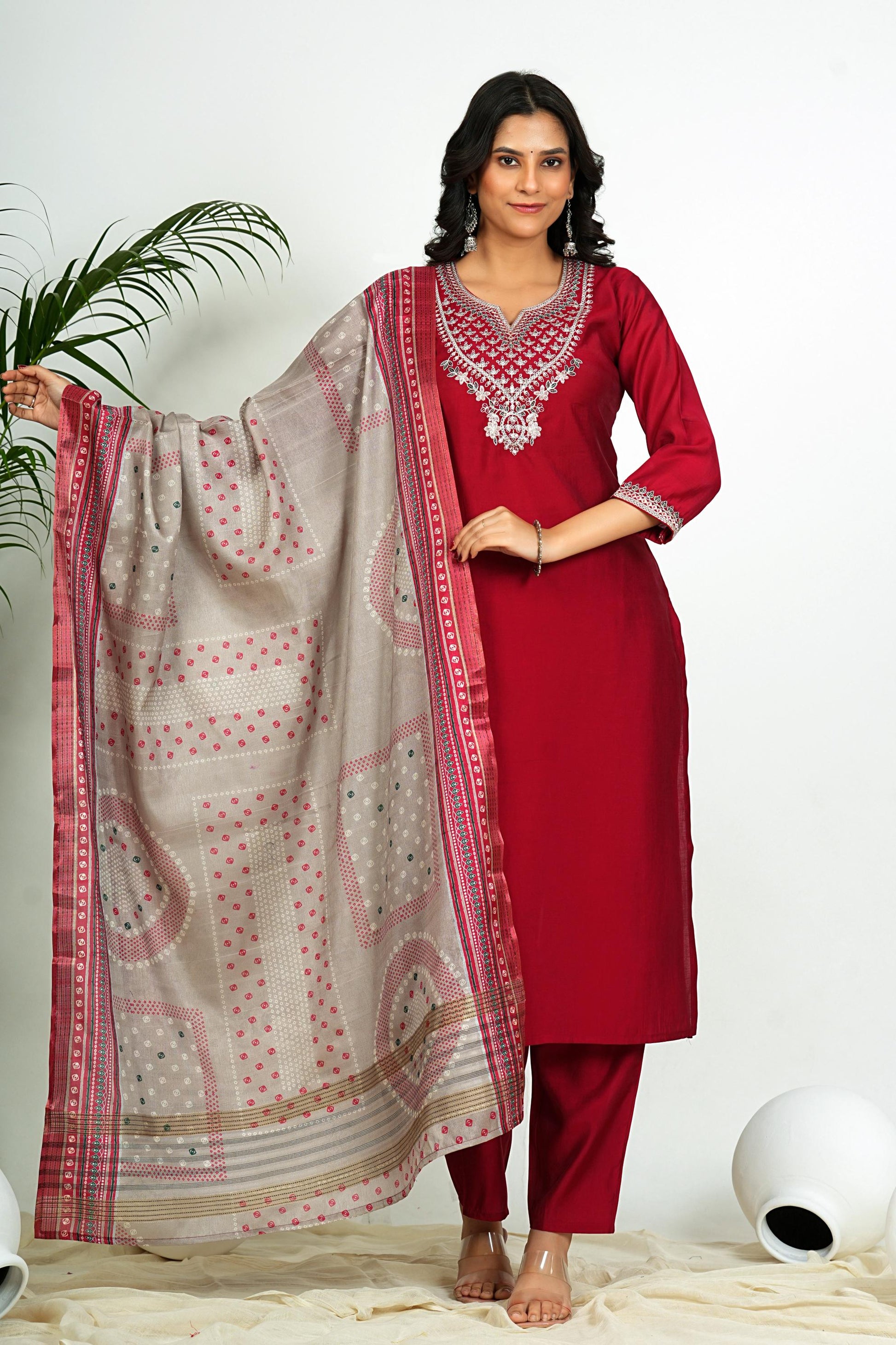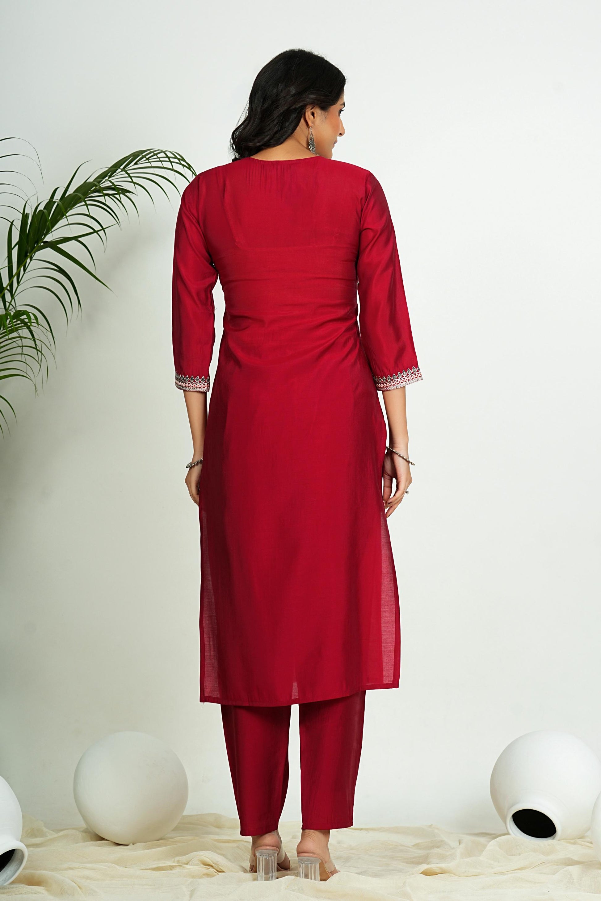 Maroon Solid With Zari Work Straight Roman Silk Kurta Set