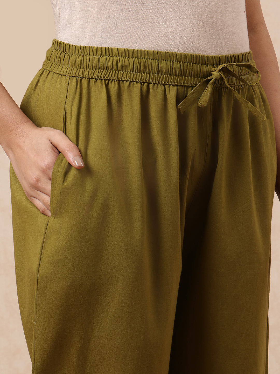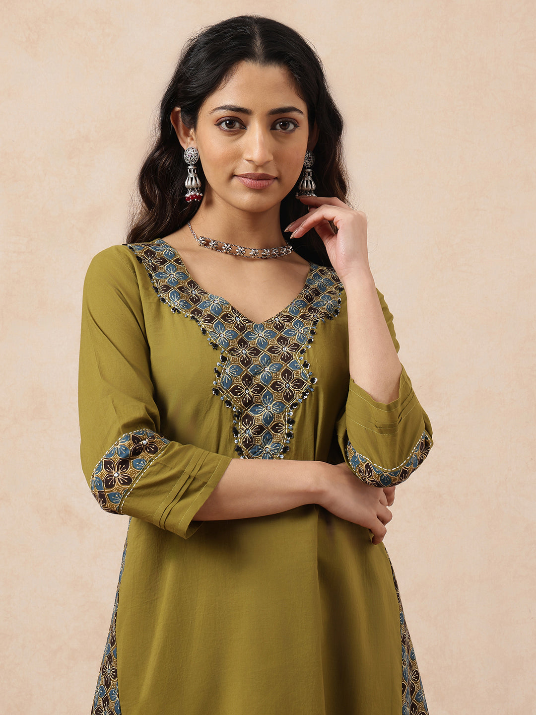 Experience the elegance of traditional Indian fashion with this meticulously crafted three-piece kurta set. The A-line silhouette in rich mehendi green is elevated by a striking teal yoke design that adds visual interest and sophistication. Made from breathable cotton fabric, this pre-stitched kurta provides comfort without compromising on style. The accompanying straight-cut pants offer a polished finish, while the coordinating dupatta enhances versatility for various styling options. Ideal for weddings, festivals, and special occasions, this ensemble reflects authentic craftsmanship and contemporary sensibilities. The harmonious color combination and detailed embellishment work make it a standout choice for discerning wearers seeking quality ethnic wear.