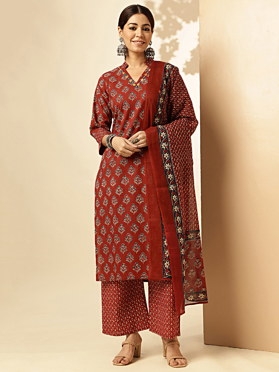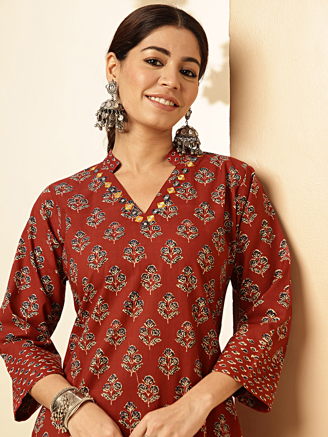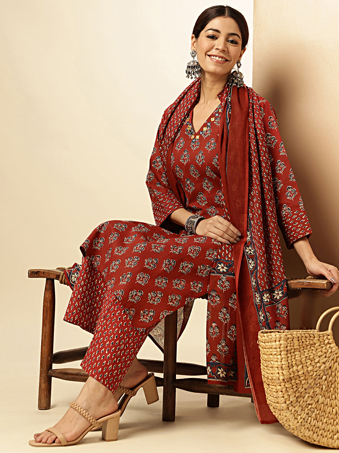 Maroon Floral Printed Straight Cotton Stitched Kurta Set