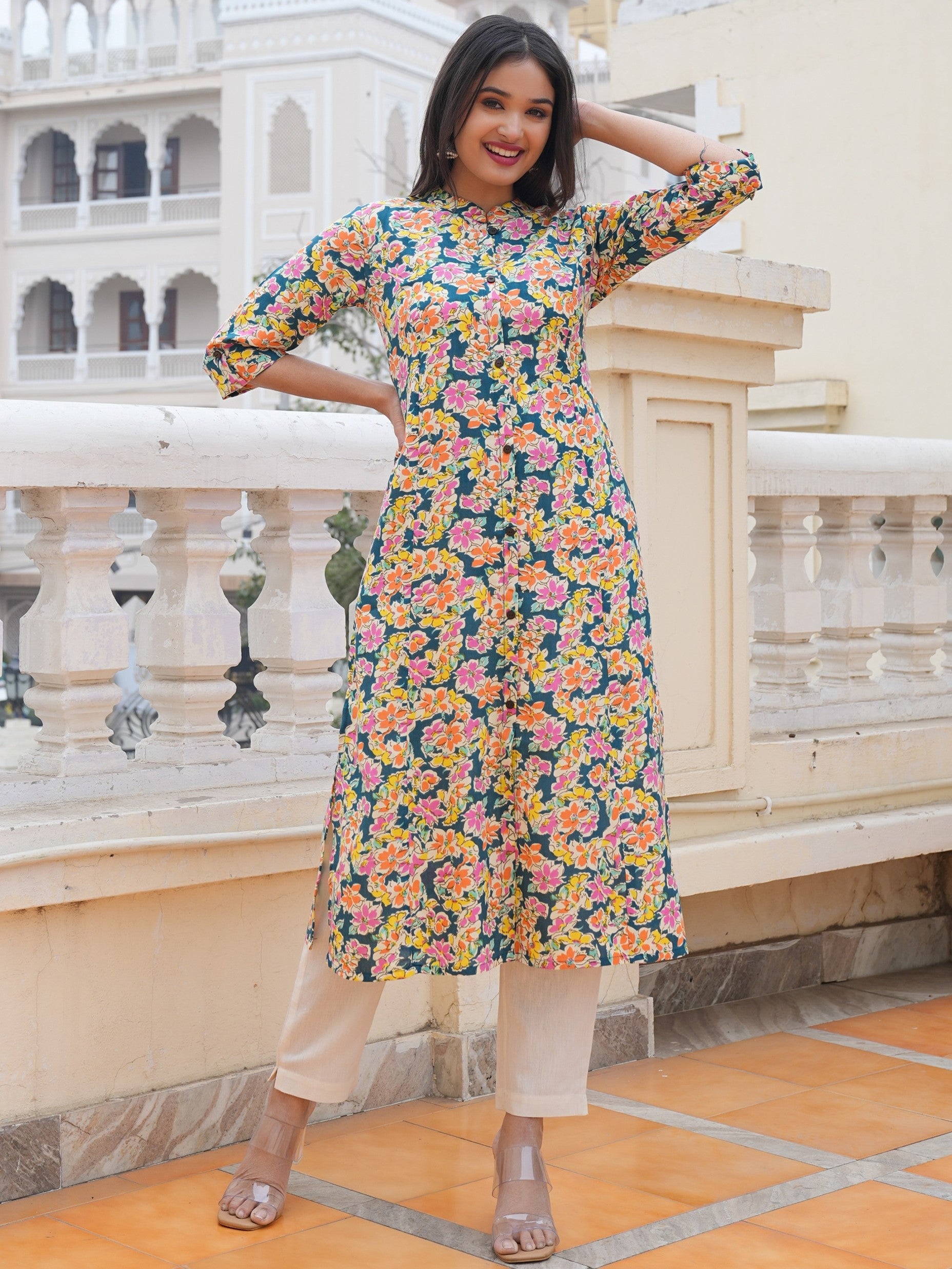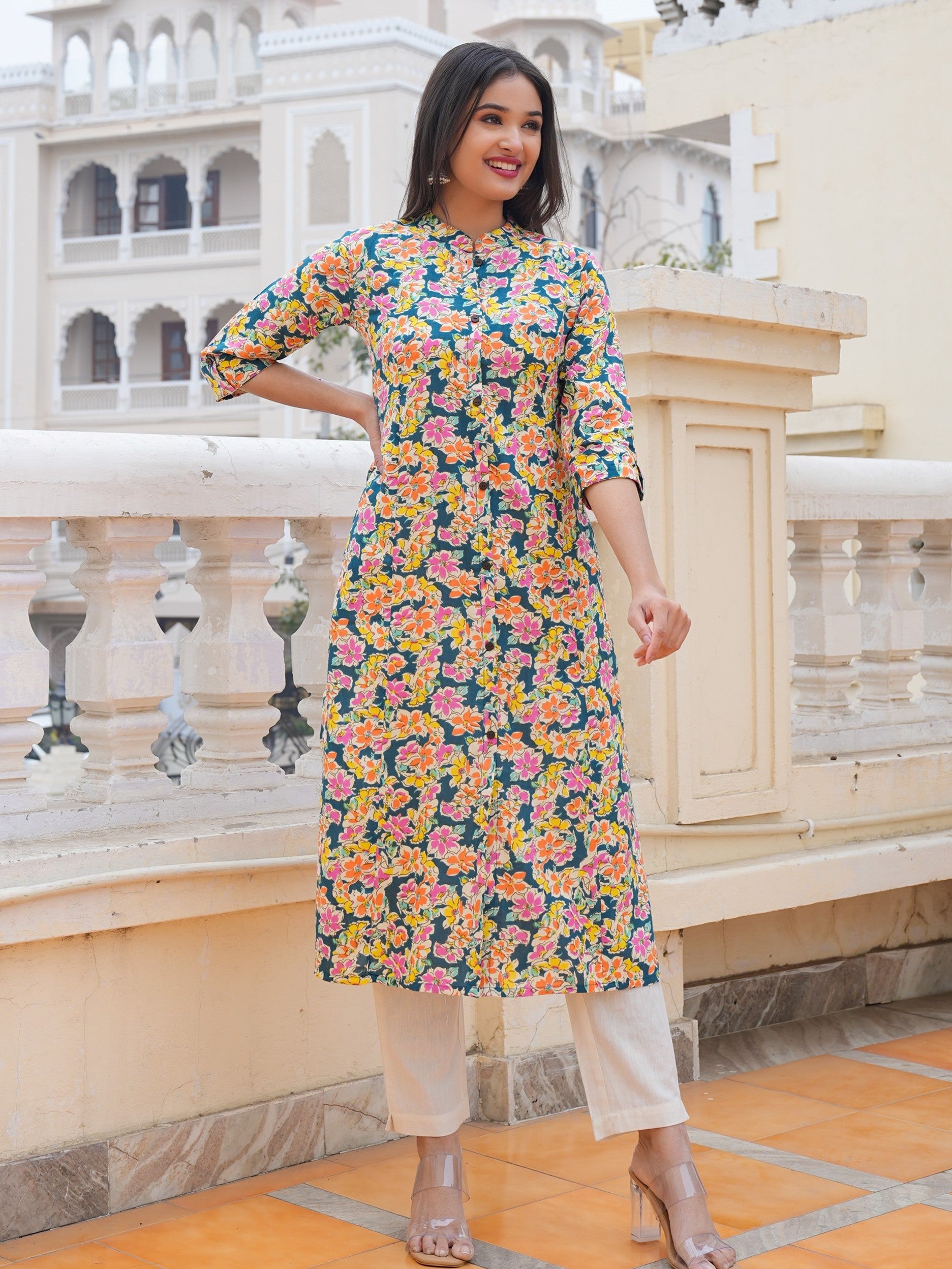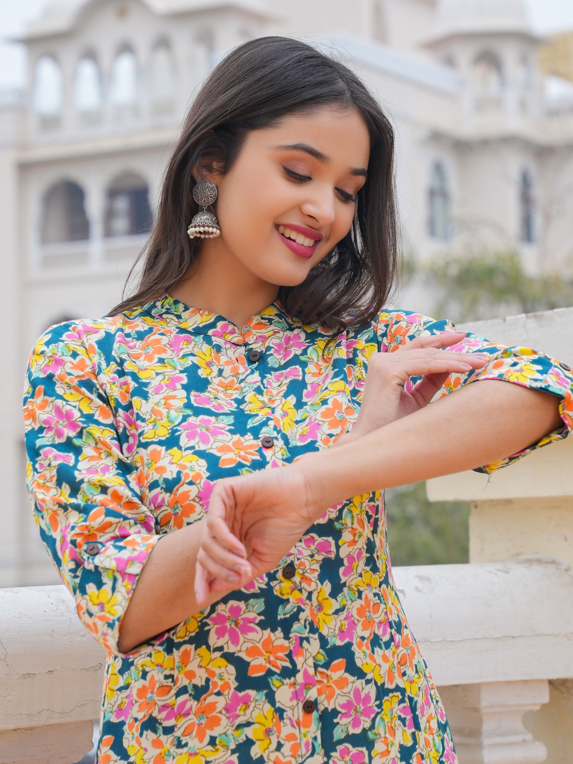 "Add a pop of color to your wardrobe with our Multicolor Floral Print Cotton Kurta! Made from soft cotton, this kurta features a vibrant floral print that will make you stand out. Perfect for a playful and stylish look. (Colorful, comfy, and quirky! Limited stock, so grab yours now!)"