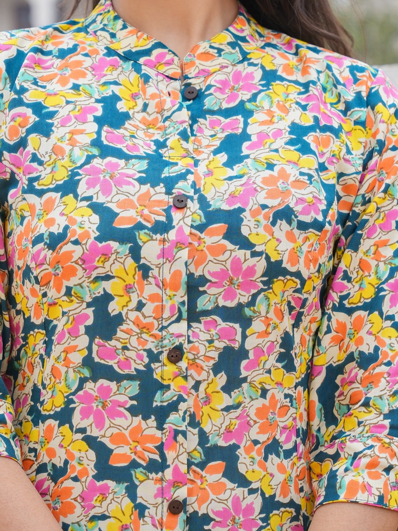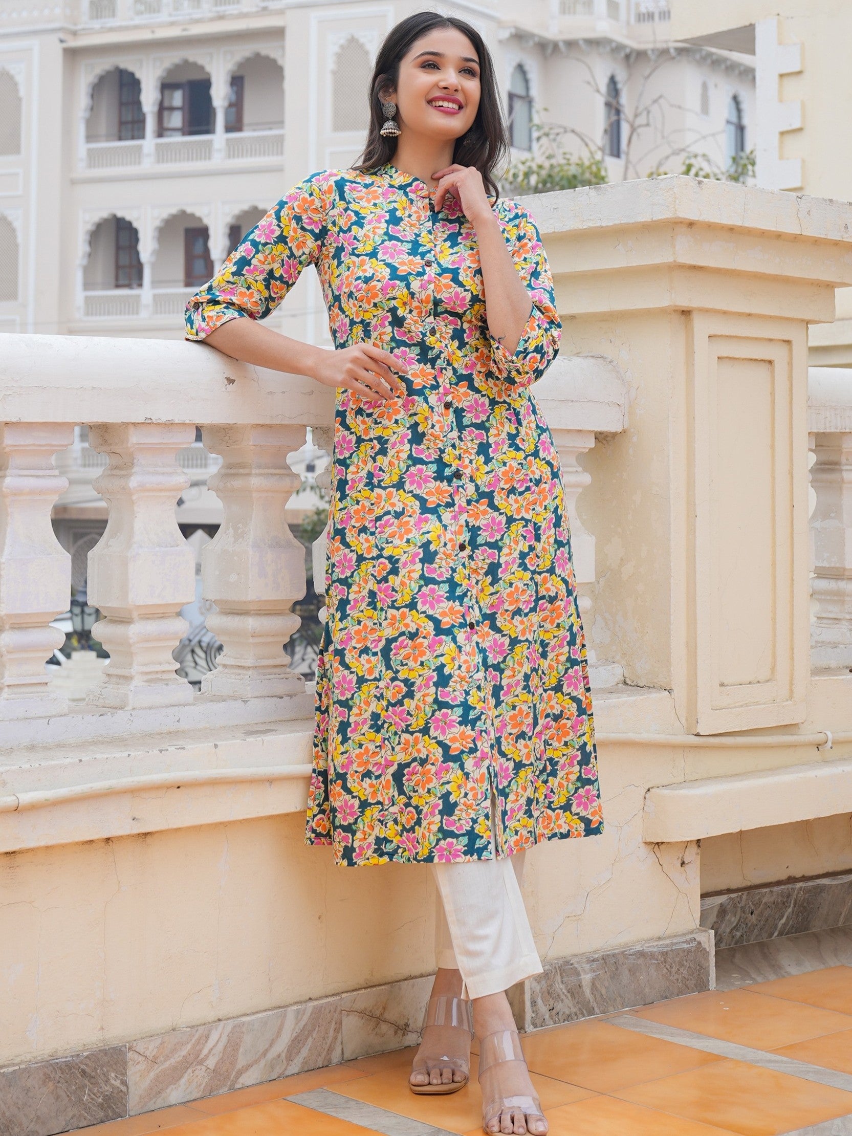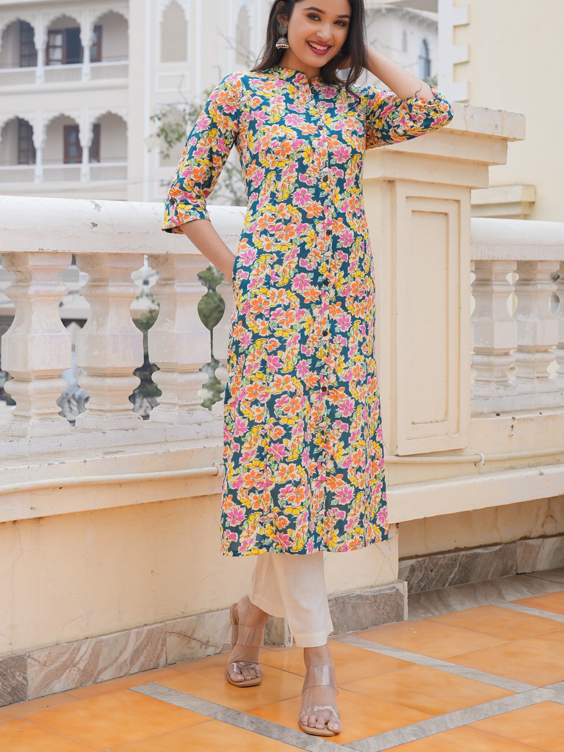 "Add a pop of color to your wardrobe with our Multicolor Floral Print Cotton Kurta! Made from soft cotton, this kurta features a vibrant floral print that will make you stand out. Perfect for a playful and stylish look. (Colorful, comfy, and quirky! Limited stock, so grab yours now!)"