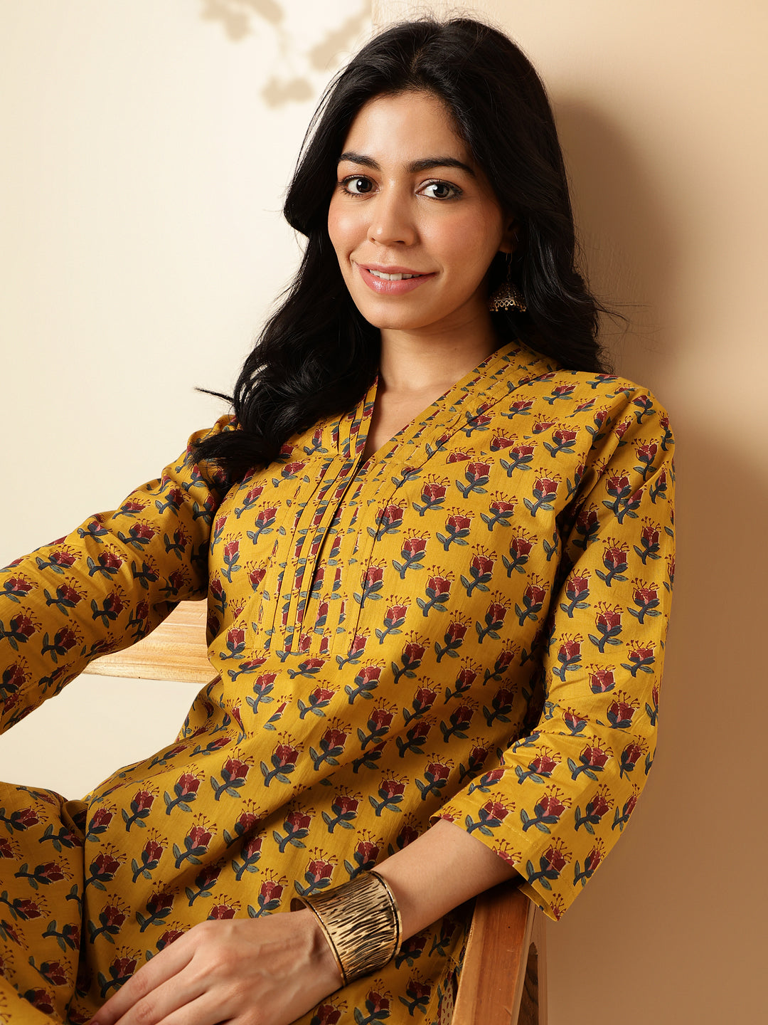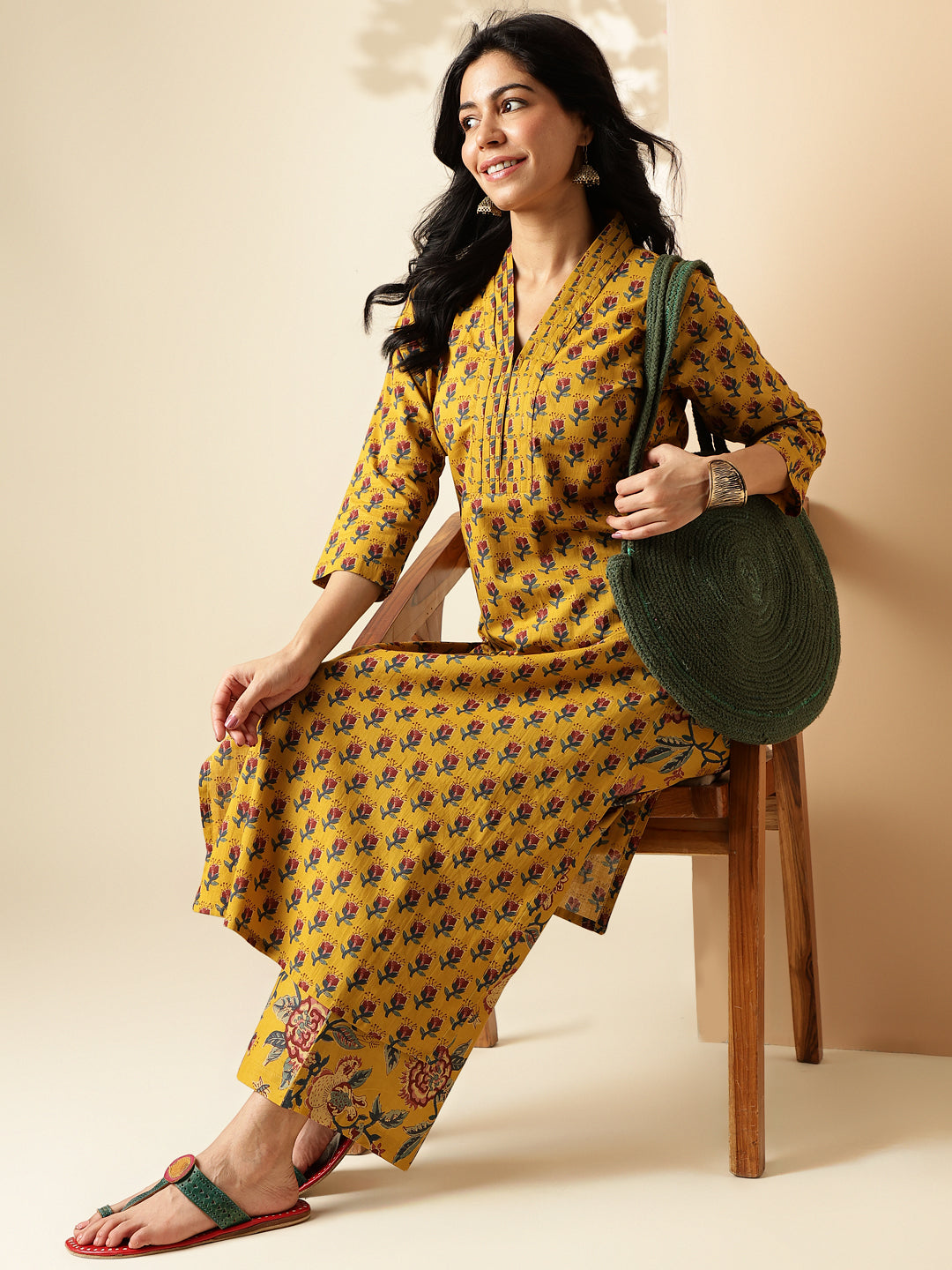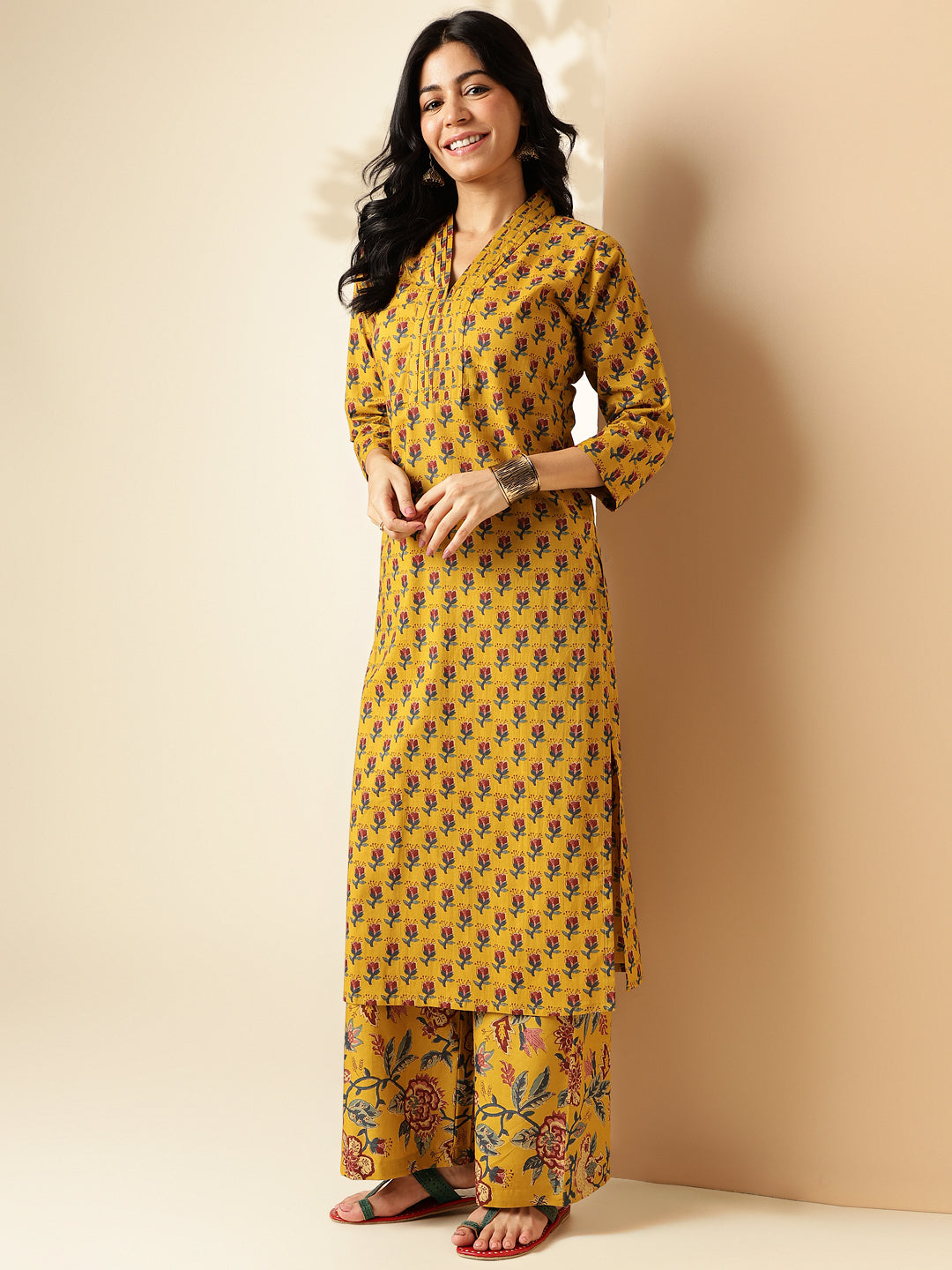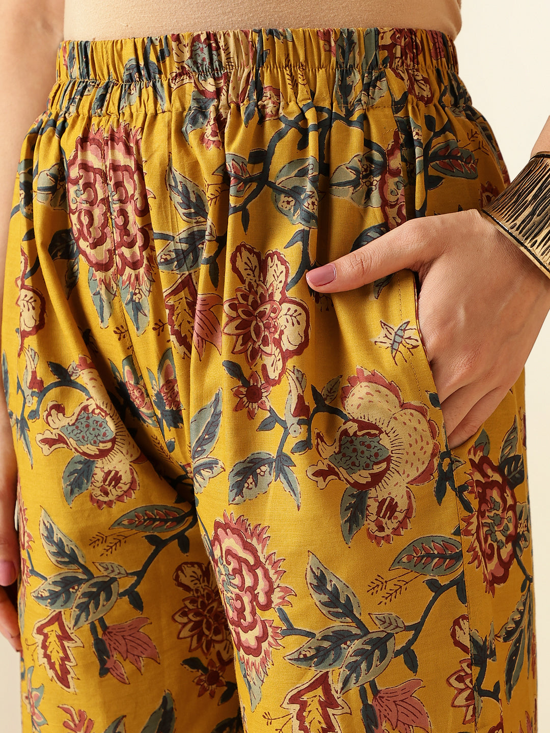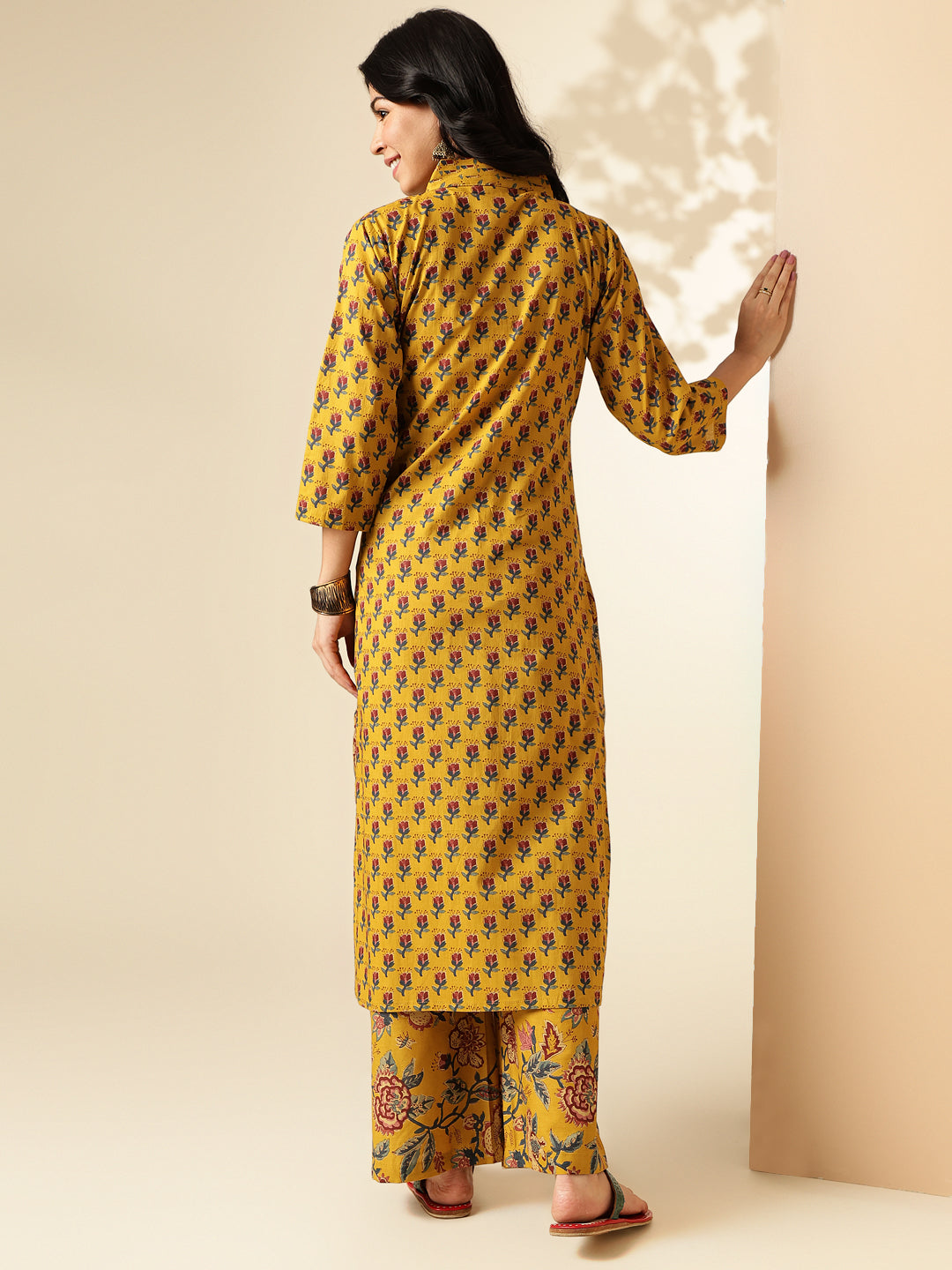 Mustard Floral Printed Straight Cotton Kurta With Palazzo