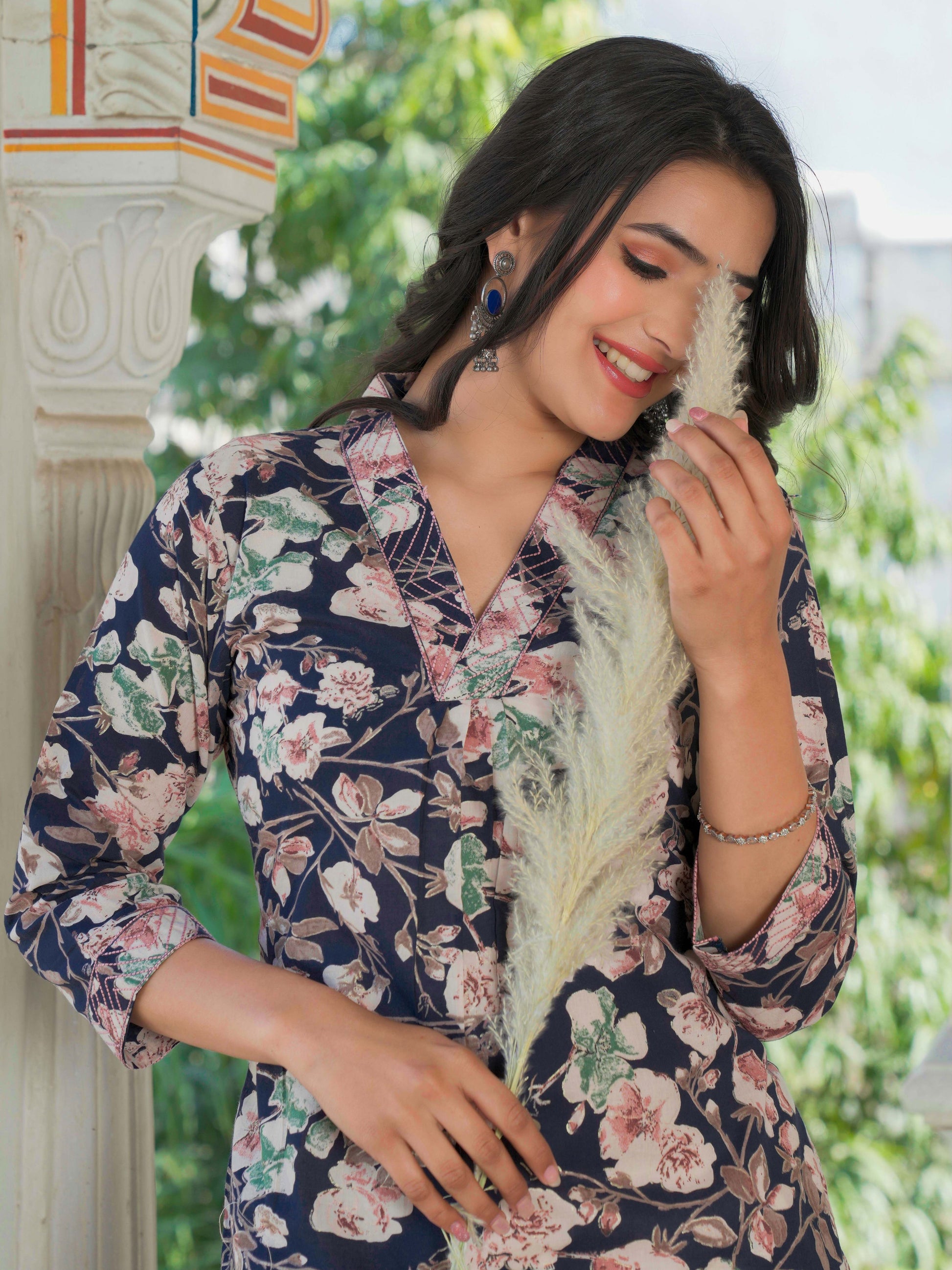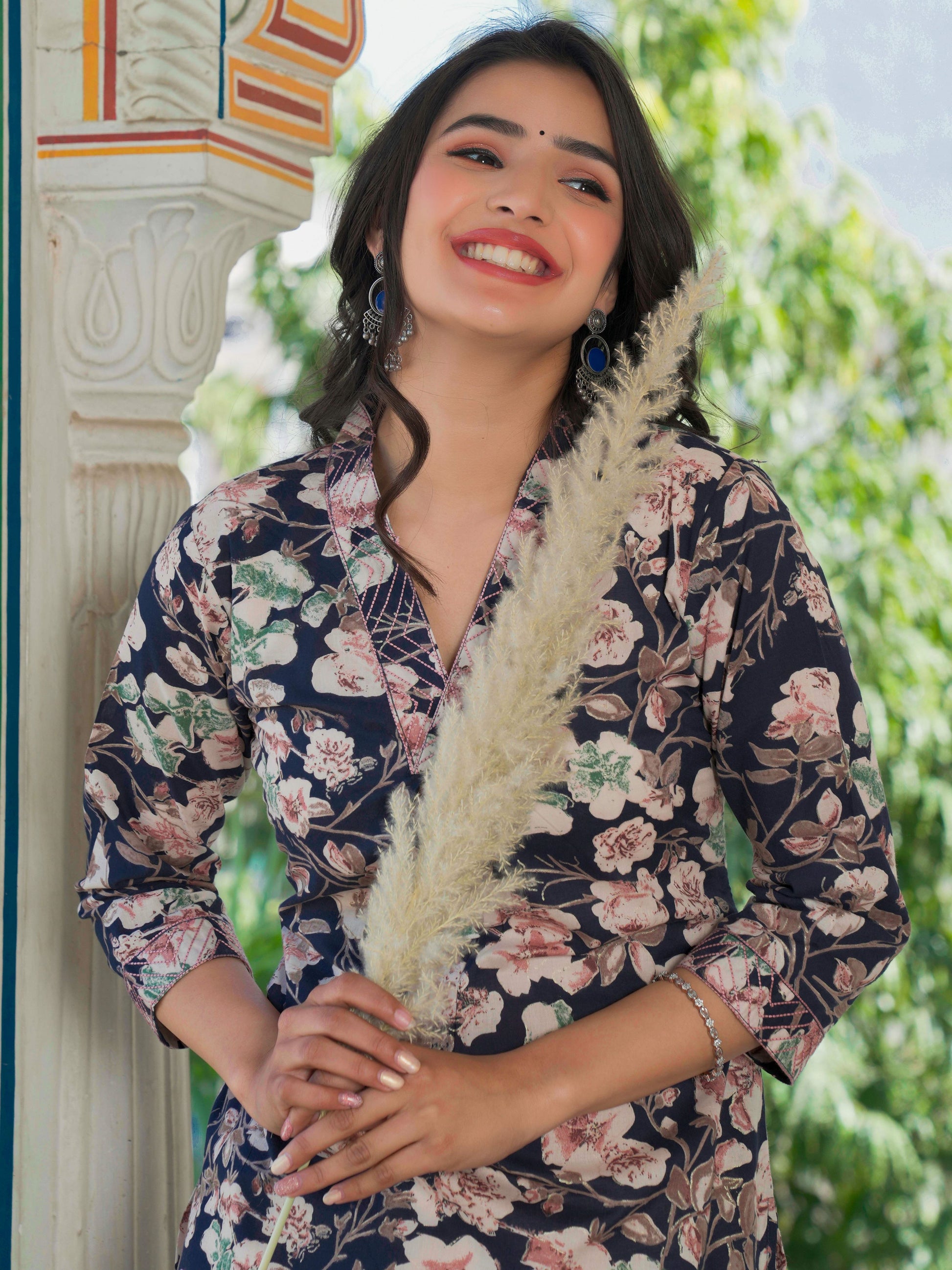 This kurta features a bold navy blue color with a straight cut and vibrant floral print, perfect for adding a playful touch to any outfit. Made from soft and breathable cotton, it offers both comfort and style. The perfect choice for those who love to make a statement with their fashion.