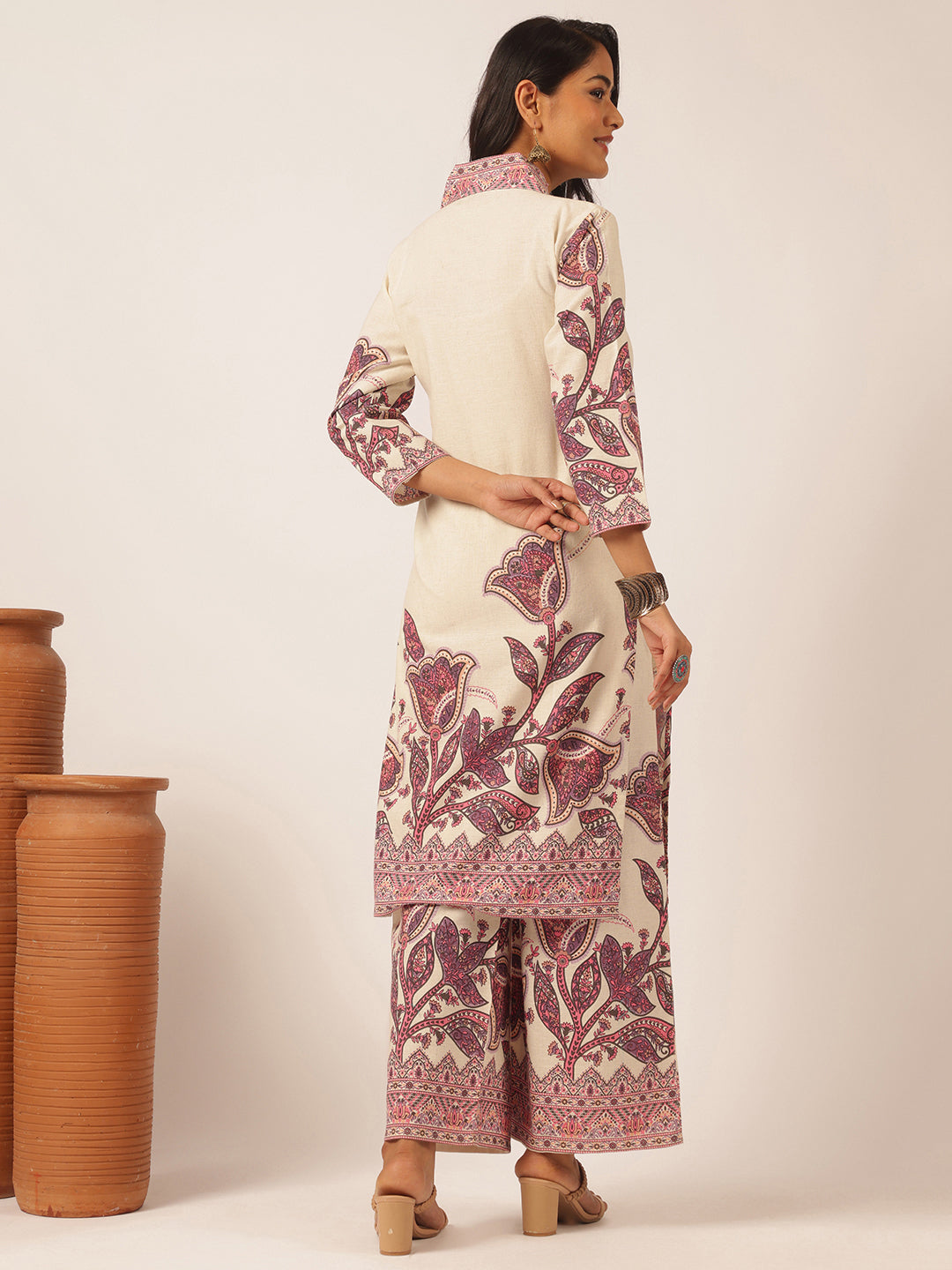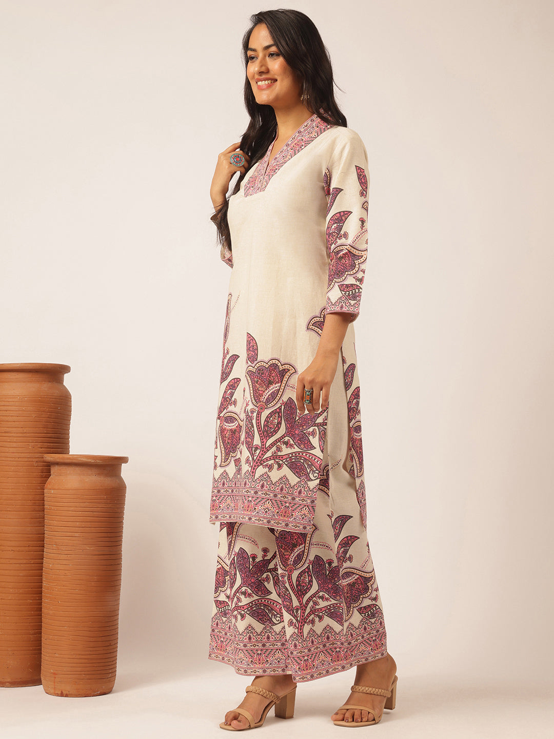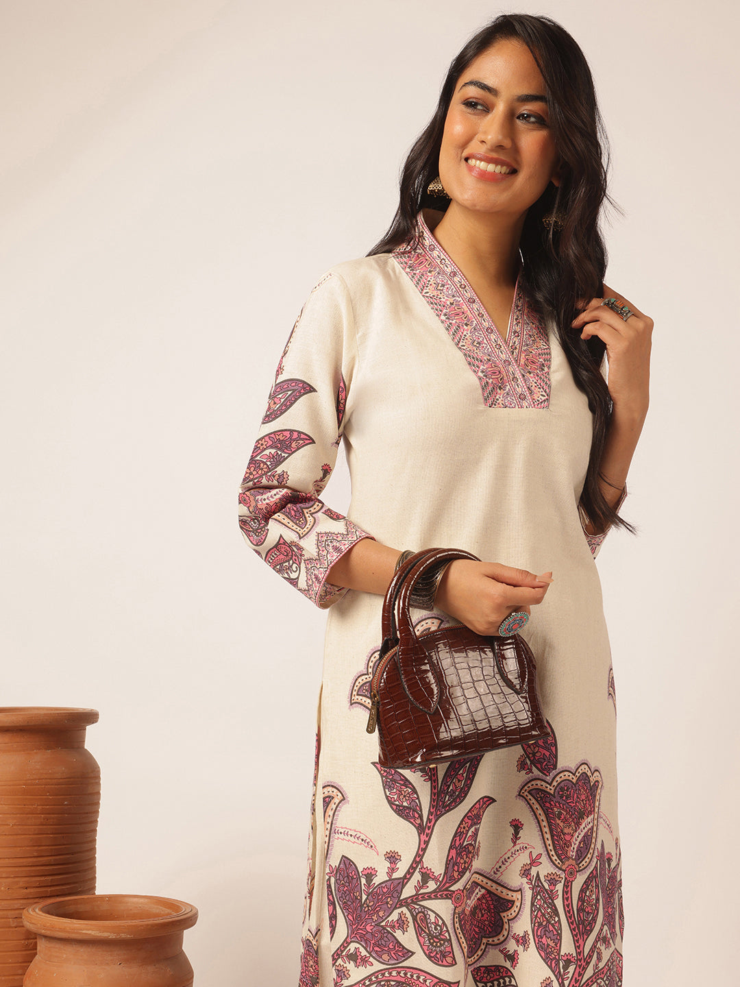 Off-white Cotton flex Floral Printed Straight Kurta Set