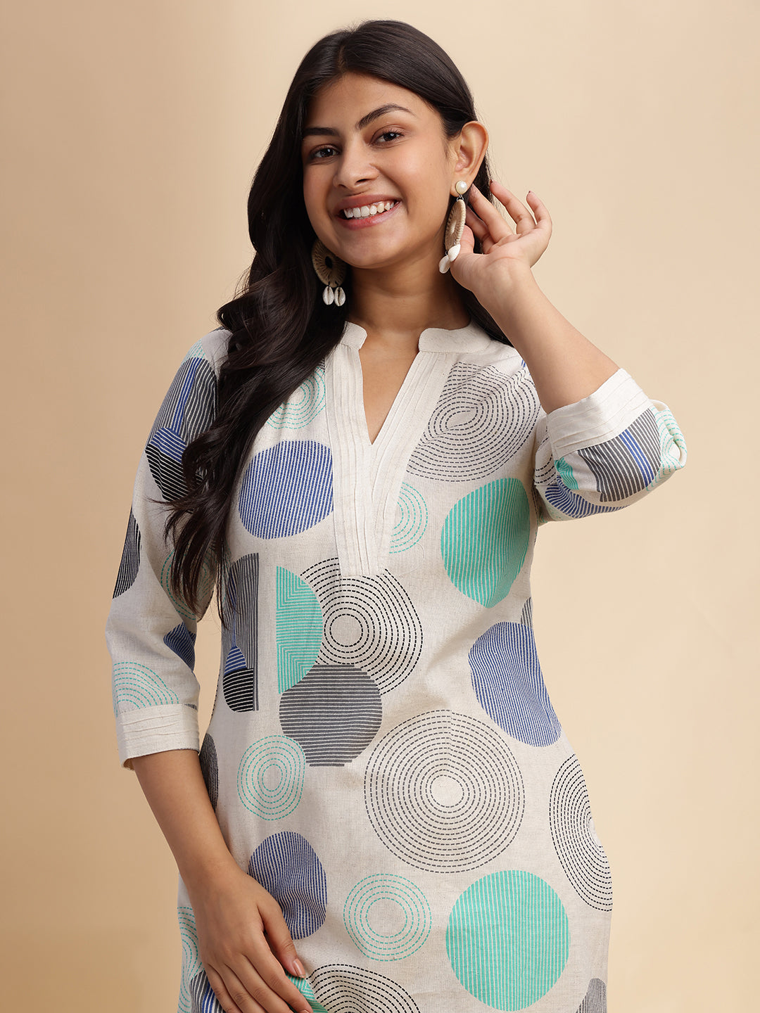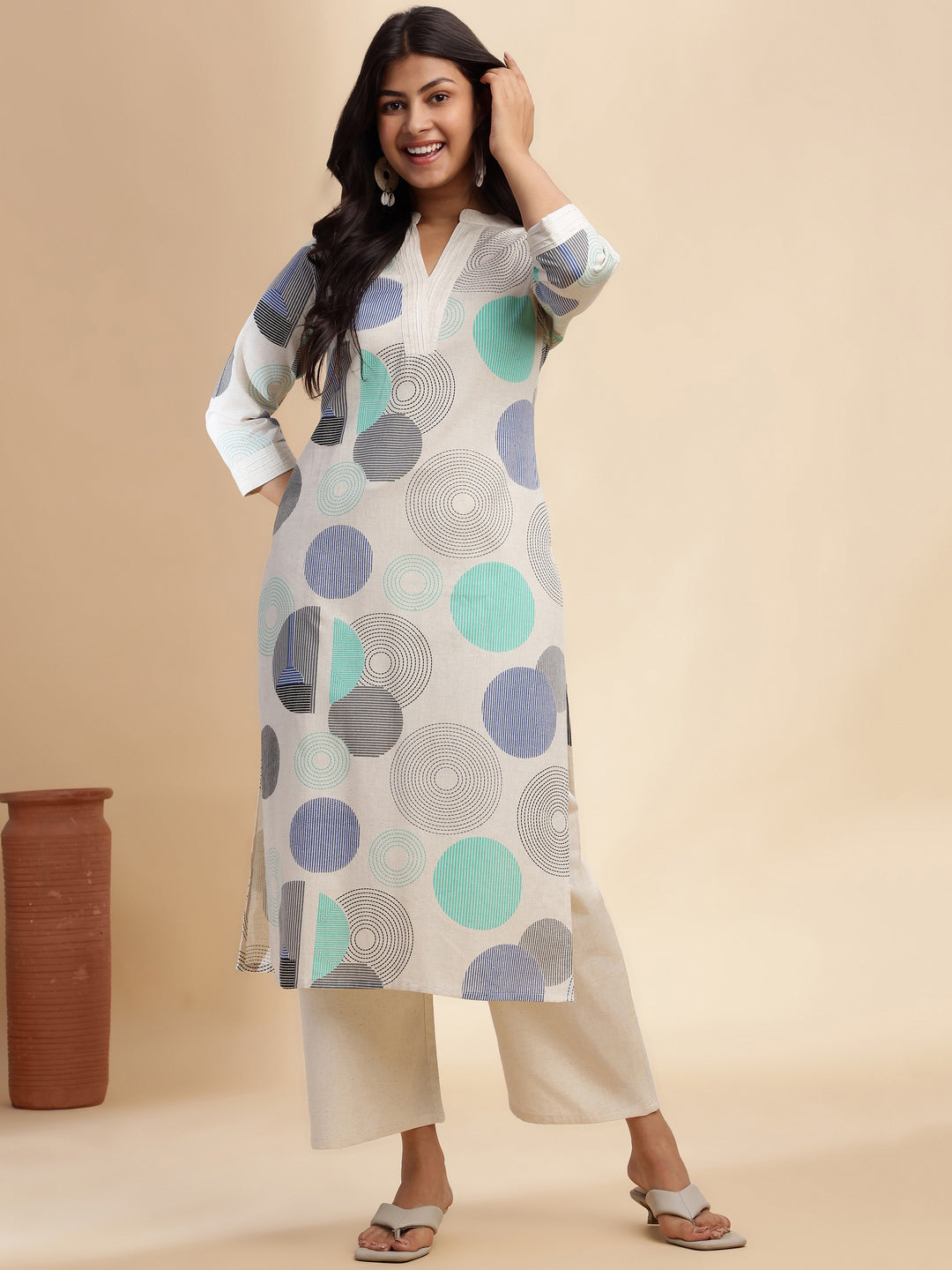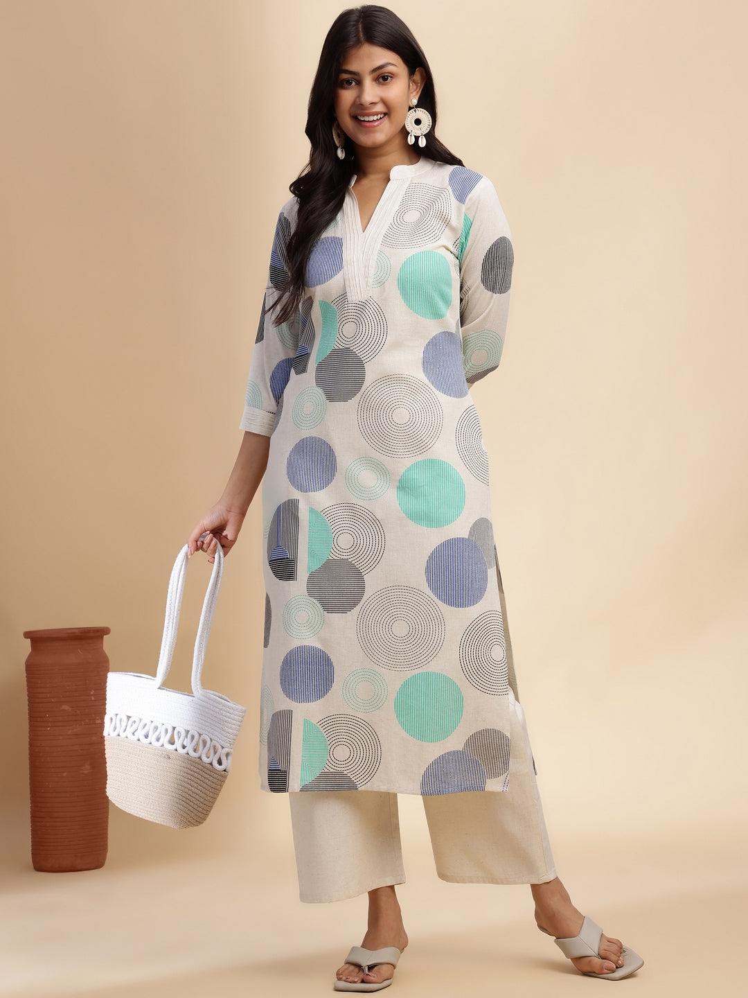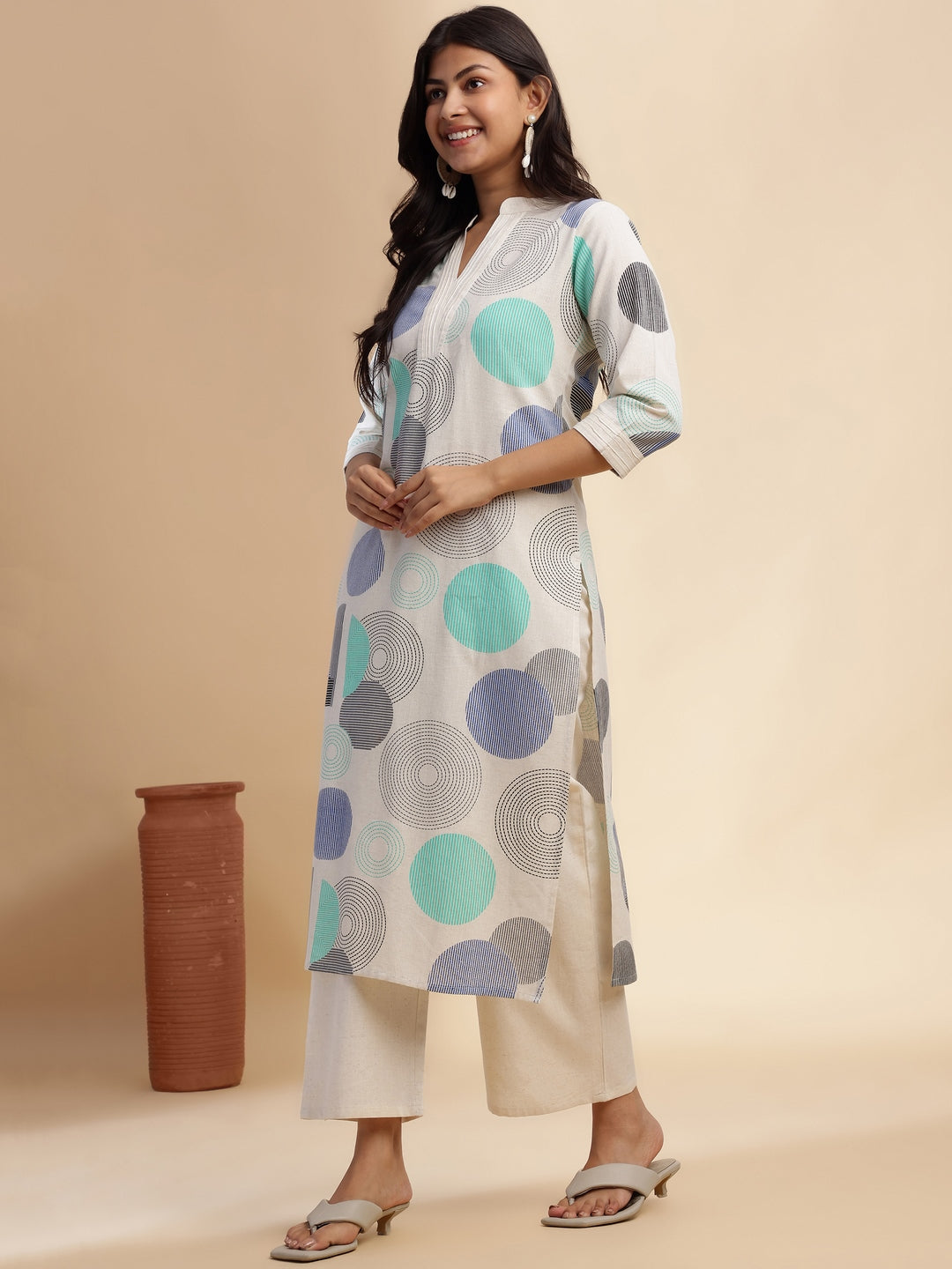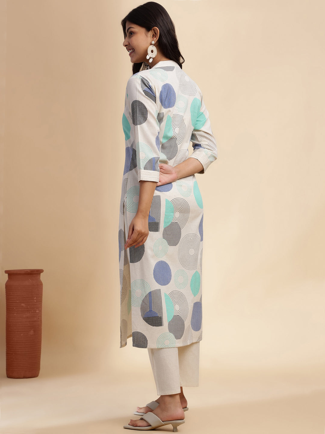 Off White Geometric Print Straight Cotton Flex Stitched Kurta Set