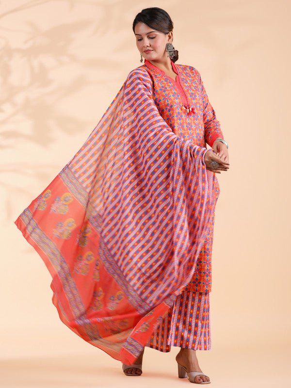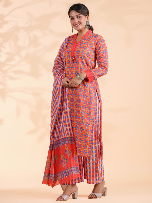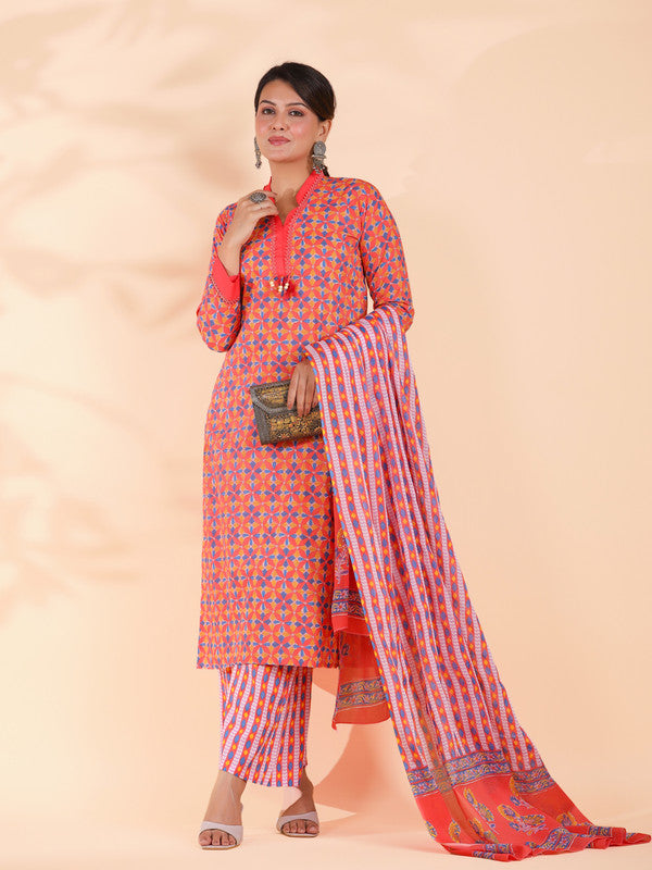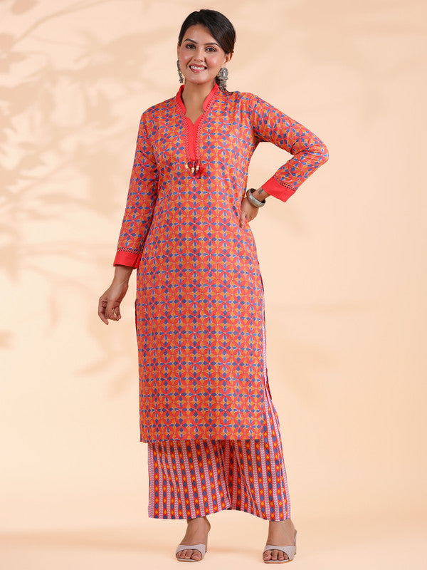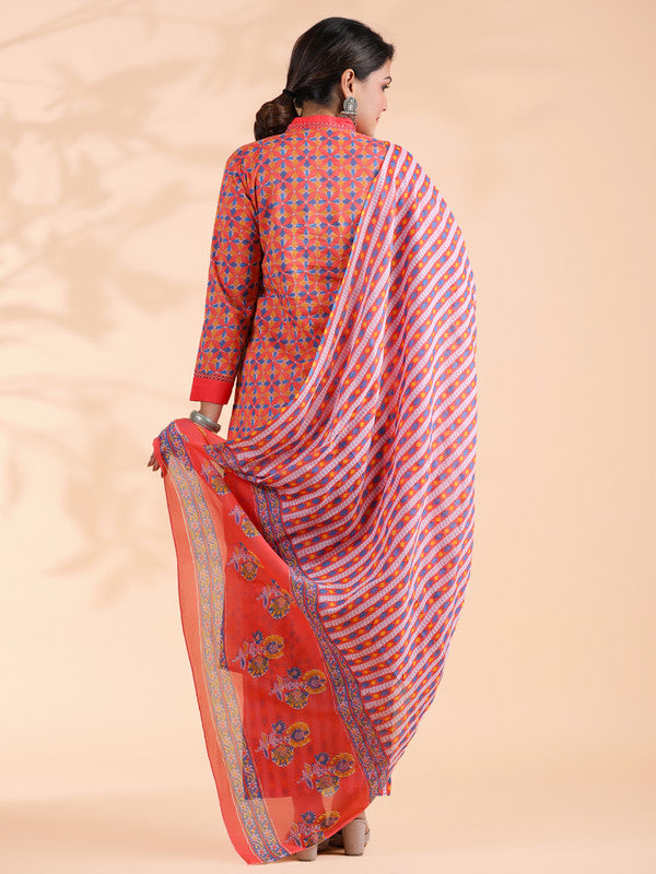 Orange Colorblock Print Straight Cotton Stitched Kurta Set
