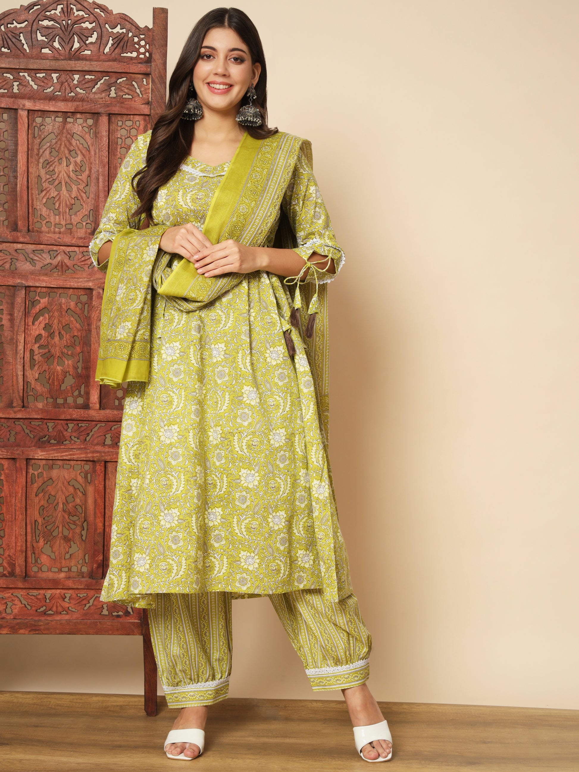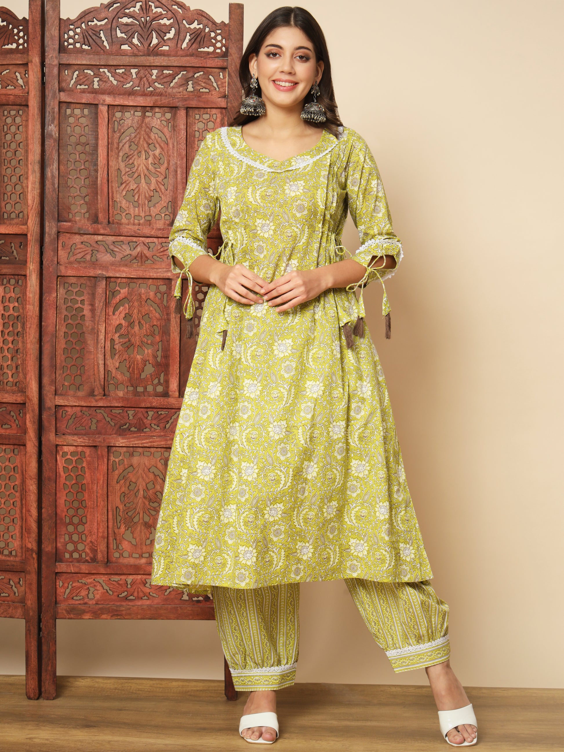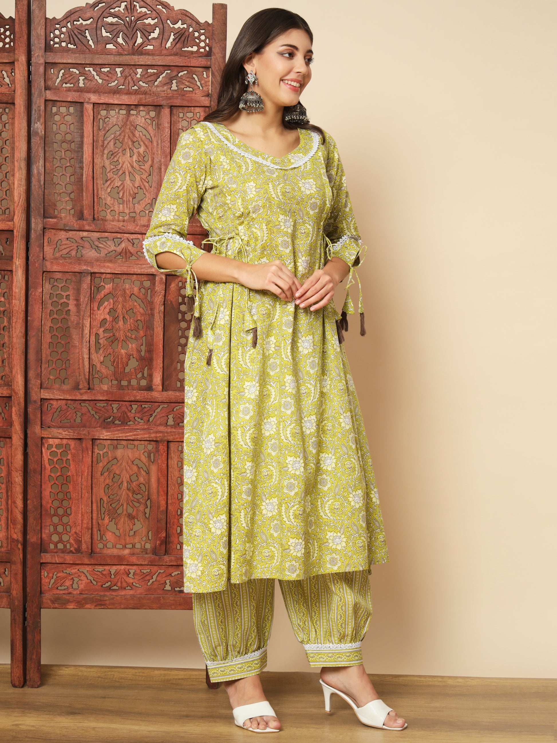 Stand out at your next party in this parrot-green cotton A-Line Kurta set! Embellished with floral prints, dori tassels, and elegant lace work, this special Afghani-style piece is perfect for any festive occasion. So go ahead, dress to impress!