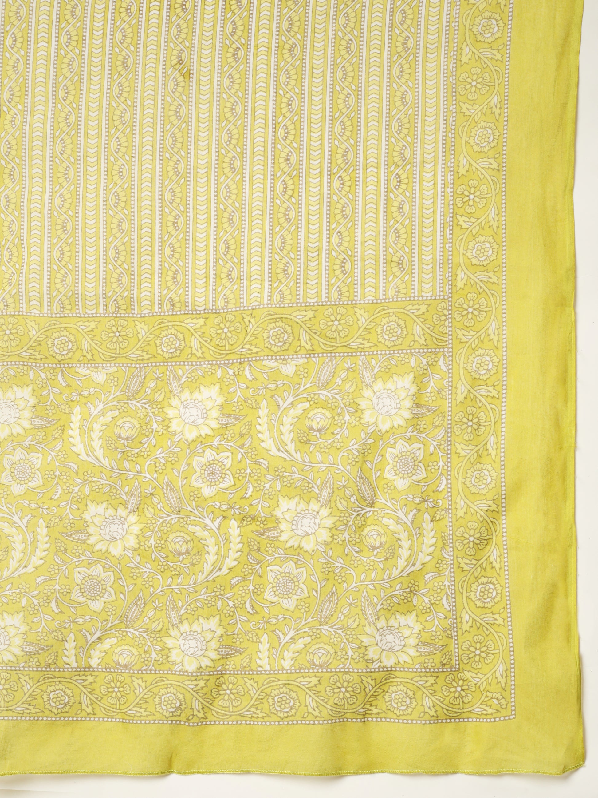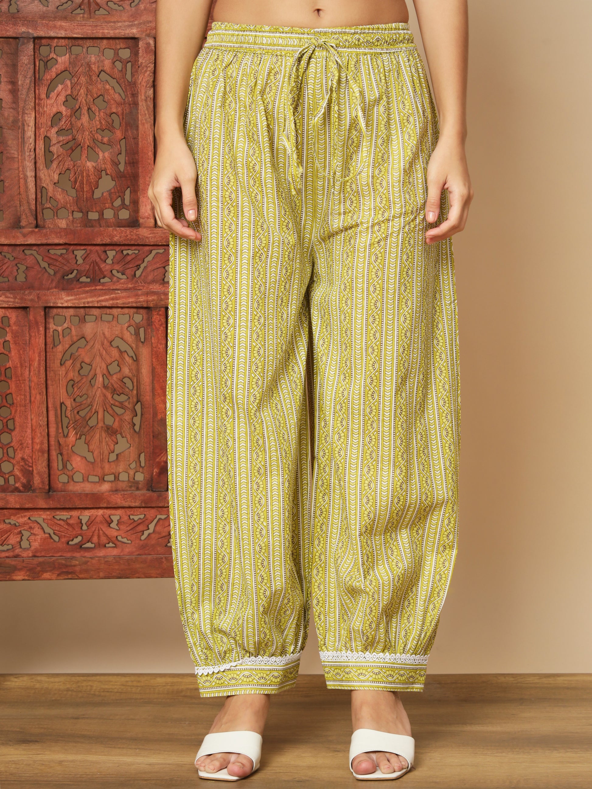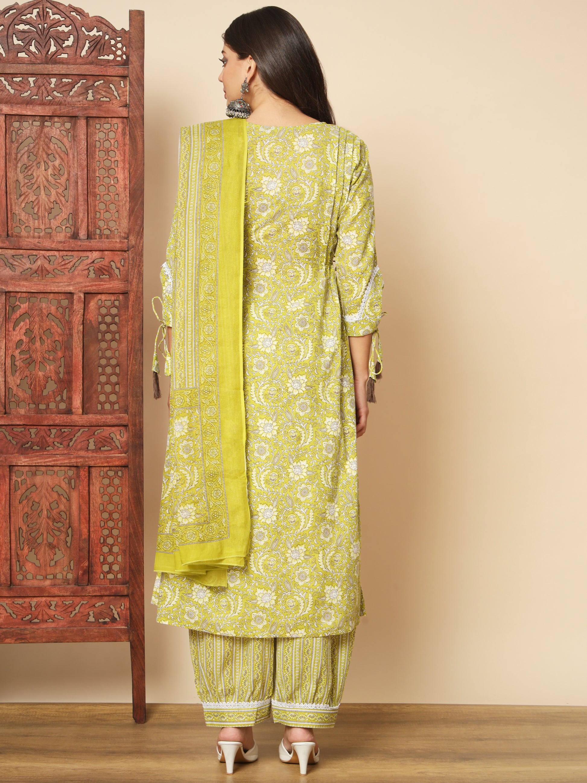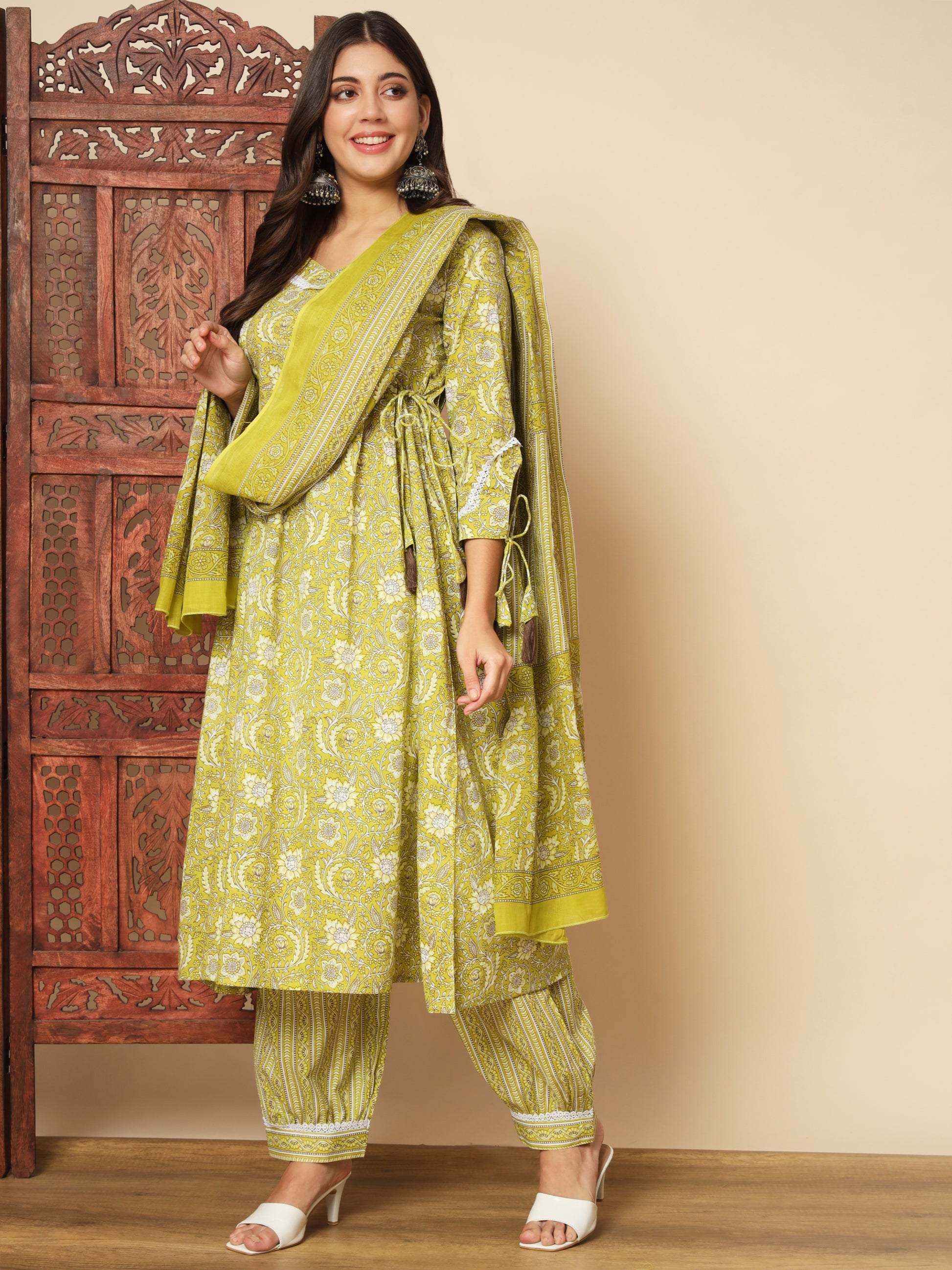 Stand out at your next party in this parrot-green cotton A-Line Kurta set! Embellished with floral prints, dori tassels, and elegant lace work, this special Afghani-style piece is perfect for any festive occasion. So go ahead, dress to impress!