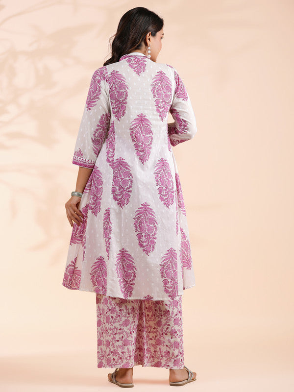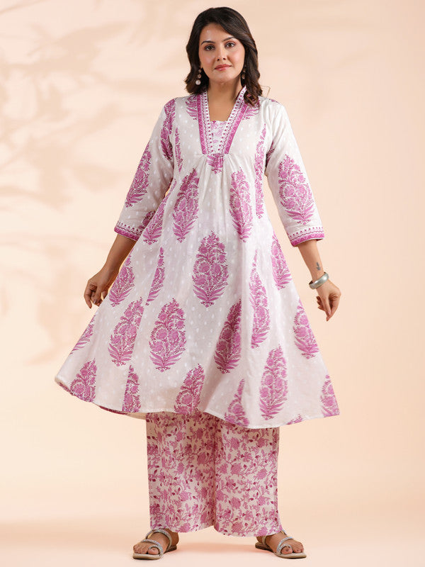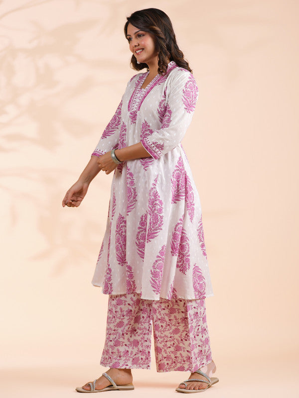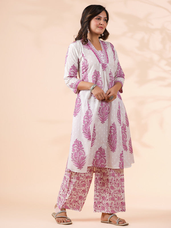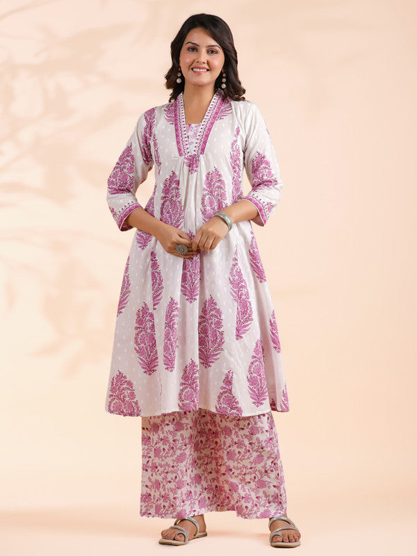 Pink Floral Print A-Line Cotton Stitched Kurta With Palazzo
