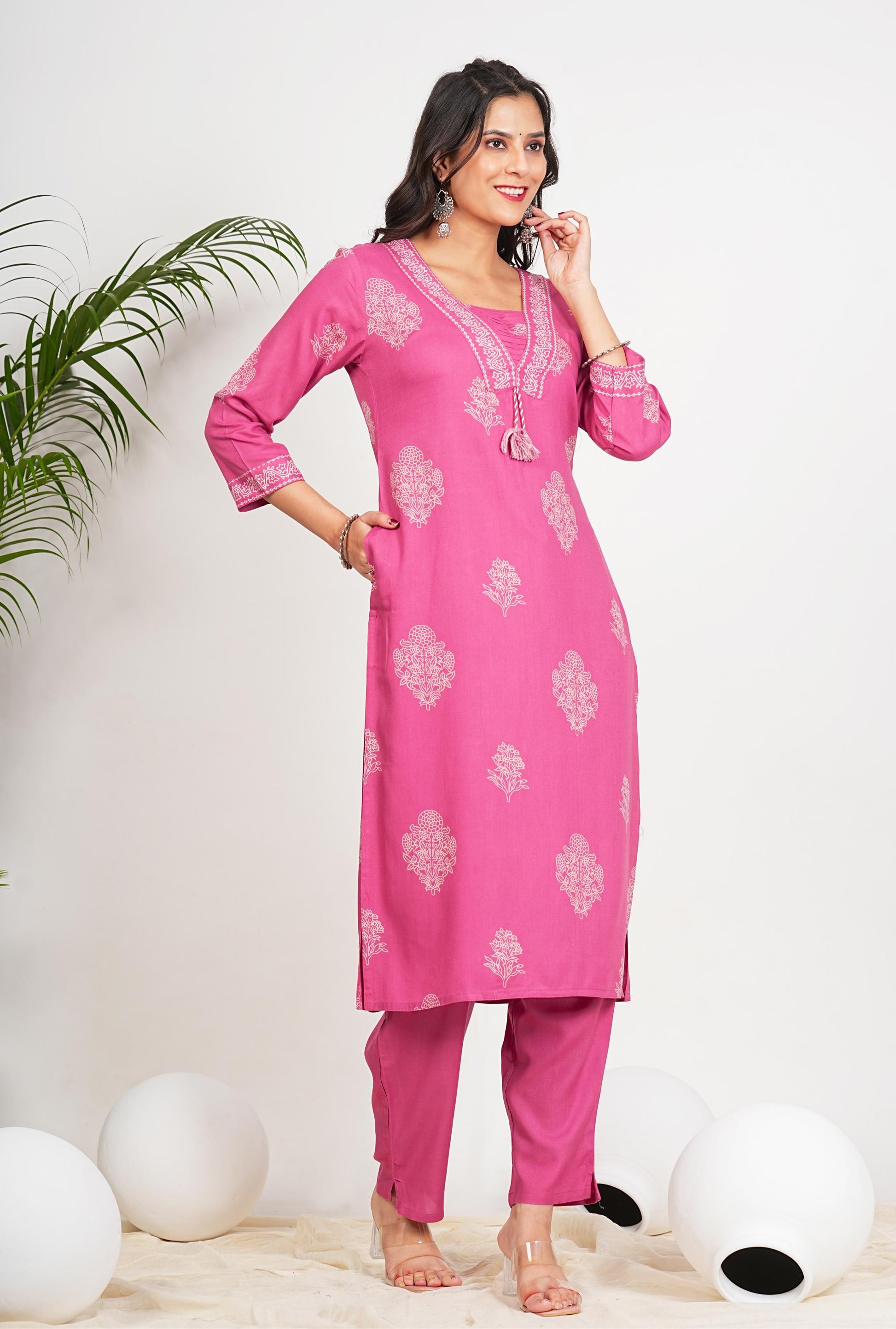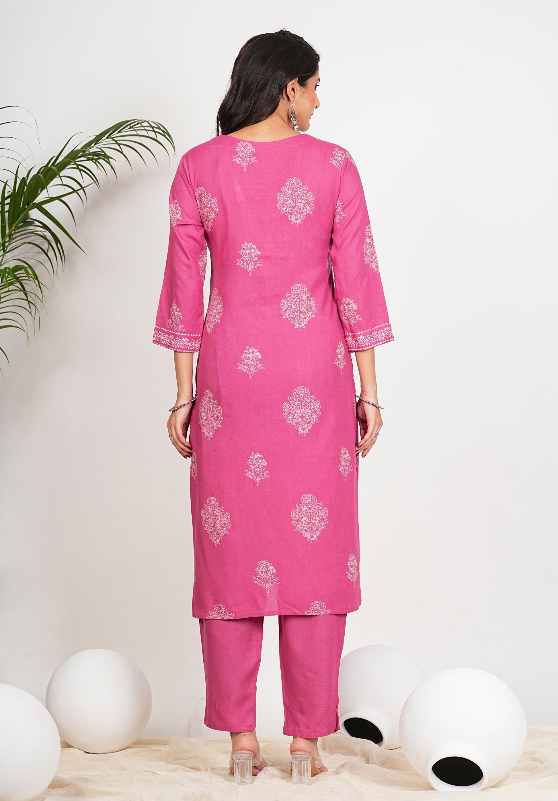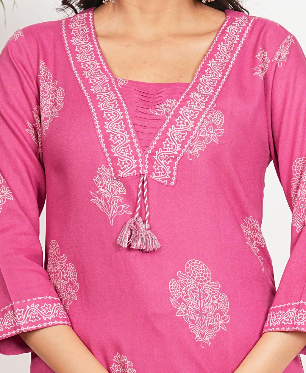 Add a pop of color to your wardrobe with this Pink Floral Print Kurta Set. Made of soft cotton, this set is comfortable for all-day wear. The straight cut and stitched design provide a flattering fit. Perfect for a casual outing or a special occasion, this kurta set is both versatile and stylish.