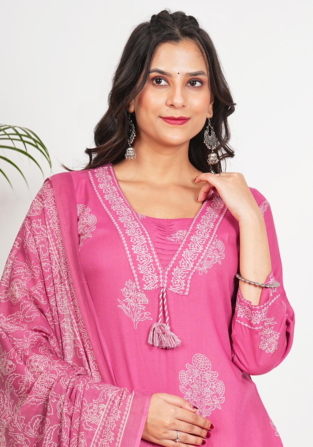 Pink Floral Print Straight Cotton Stitched Kurta Set