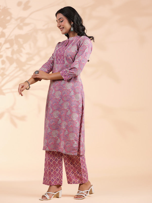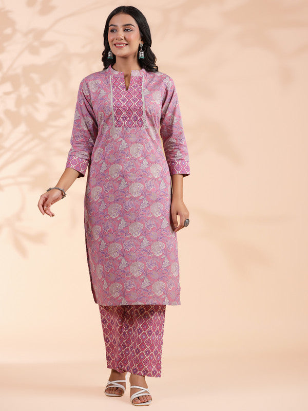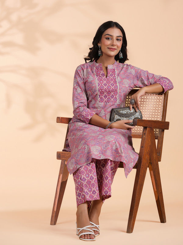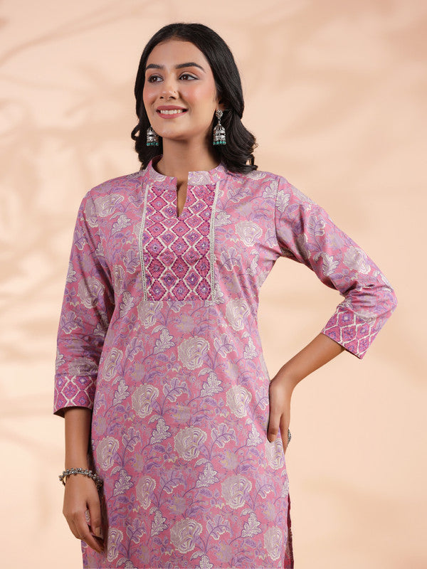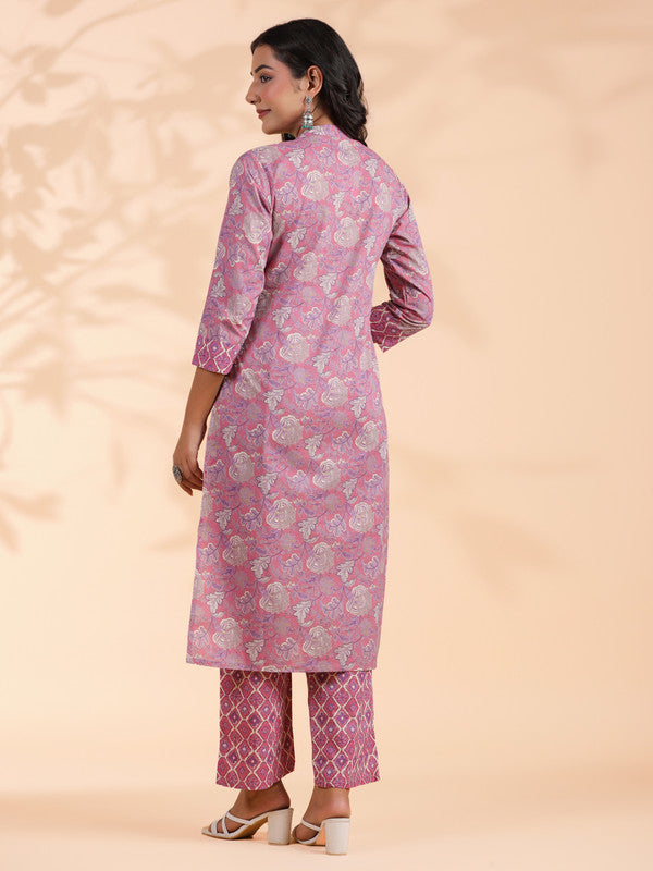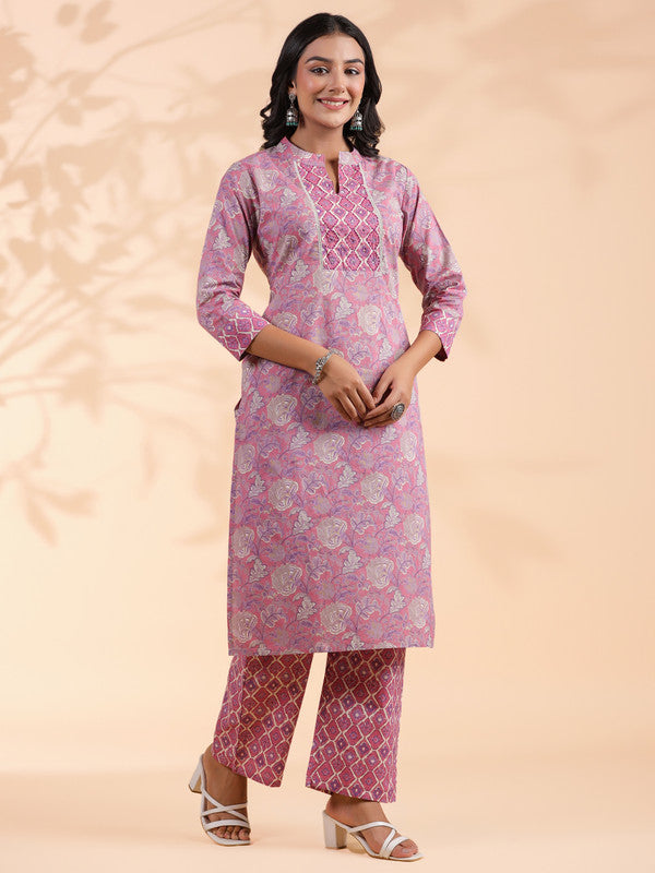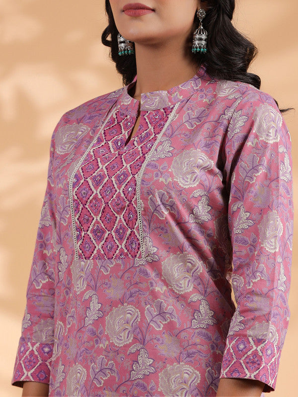 Pink Floral Print Straight Cotton Stitched Kurta With Palazzo