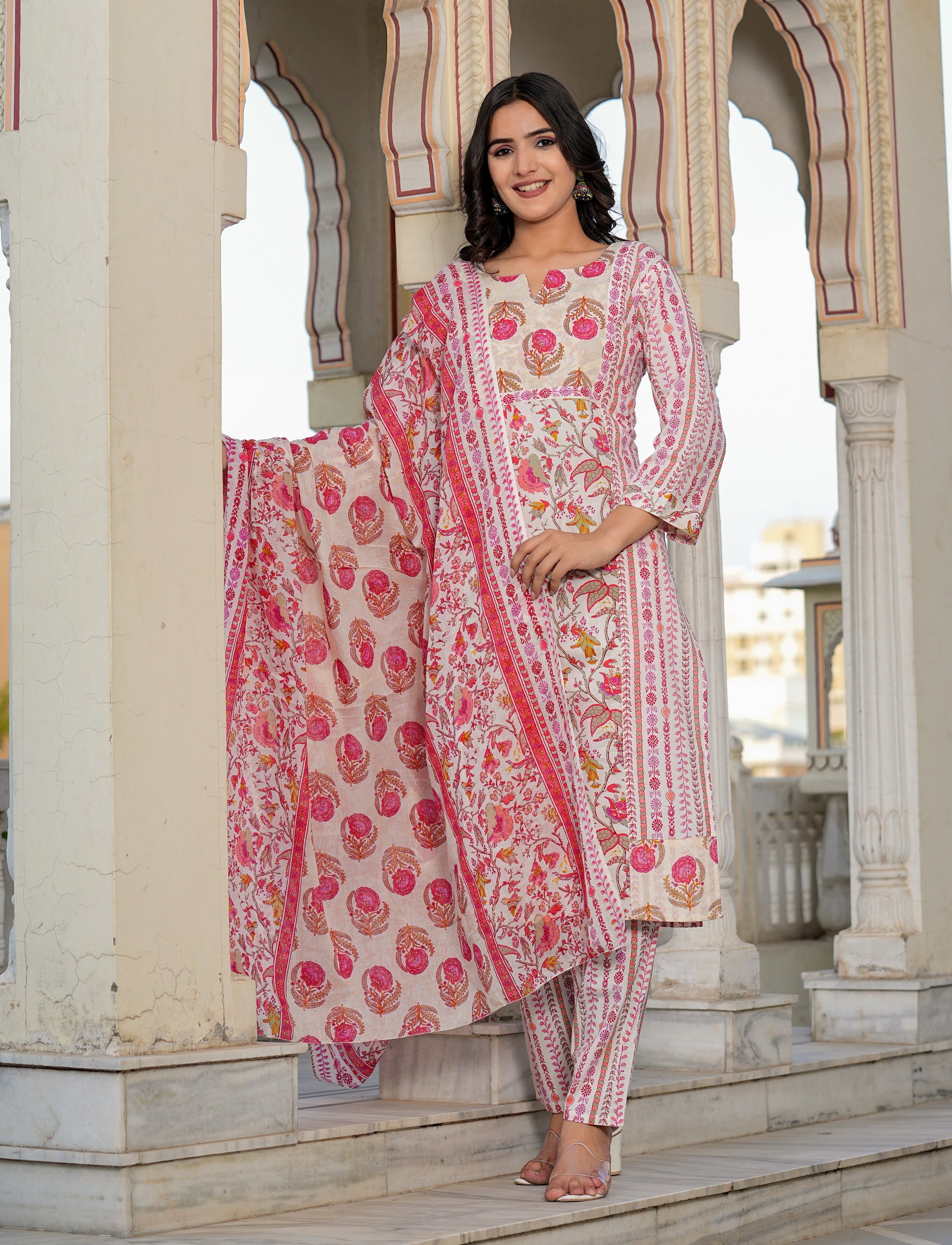 This Pink Floral Printed Straight Cotton Kurta Set features a vibrant floral print that adds a fun and playful touch to your wardrobe. Made from soft and breathable cotton, this kurta set offers both style and comfort. Perfect for any casual occasion, this set is sure to turn heads and make a statement.