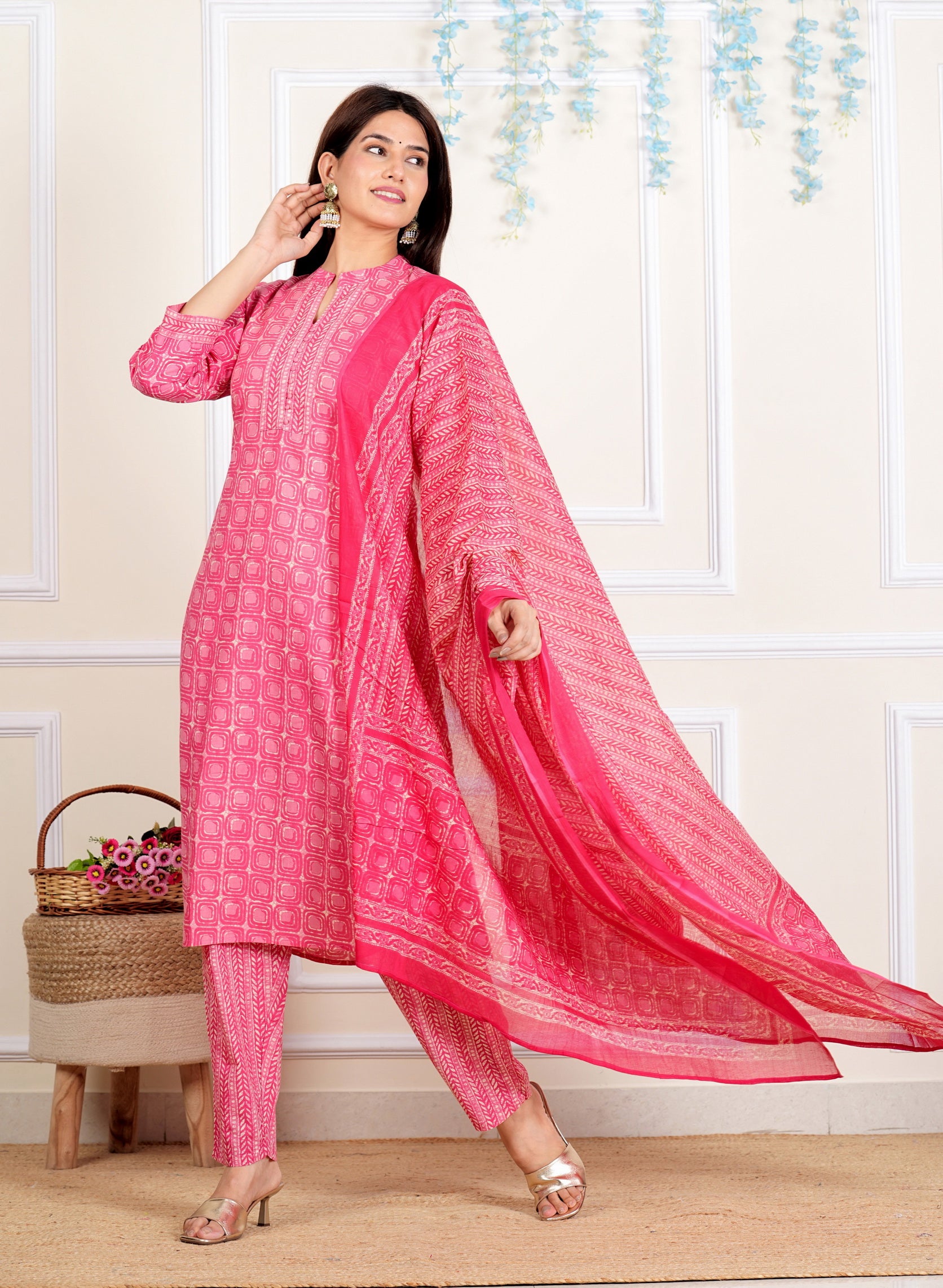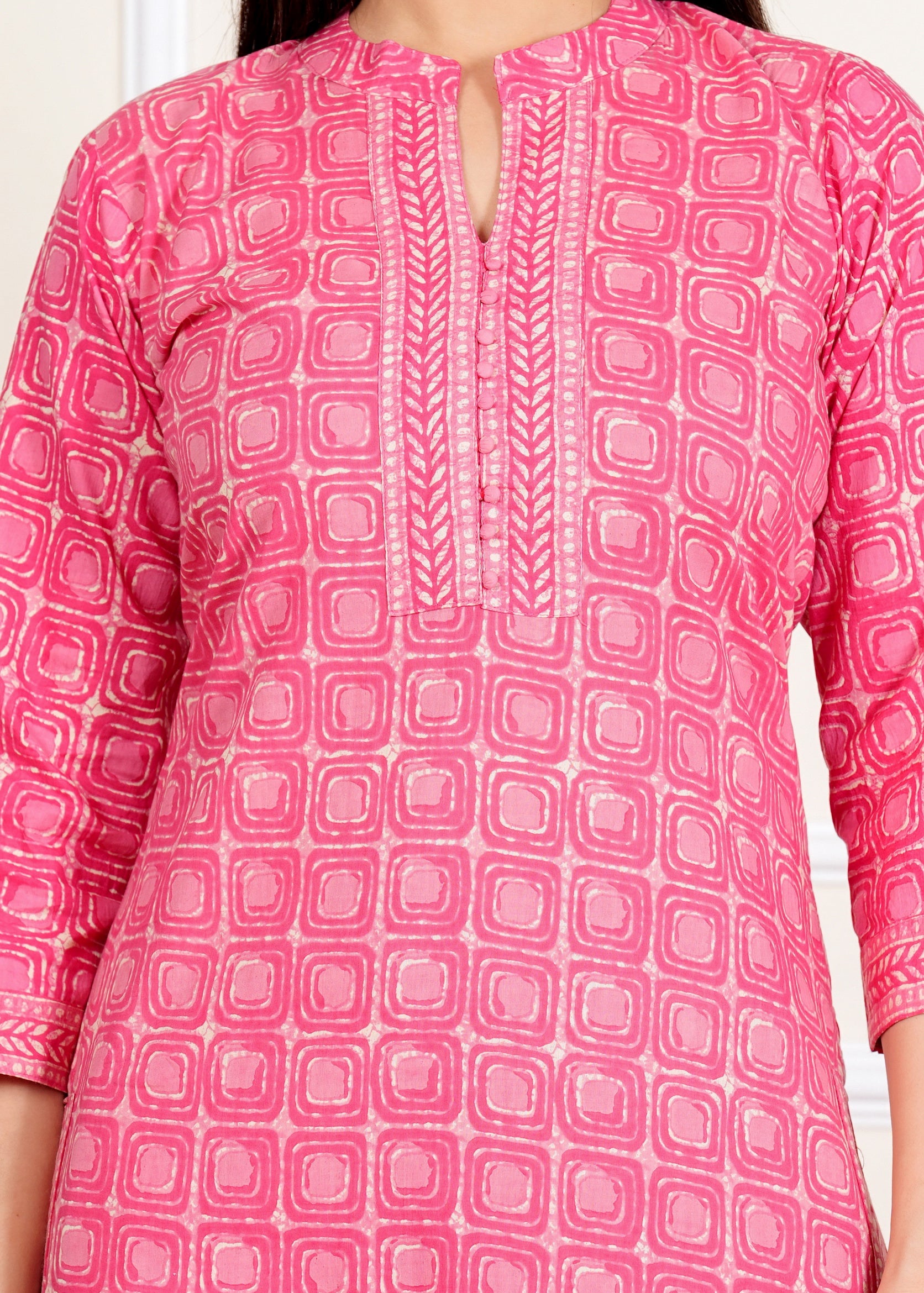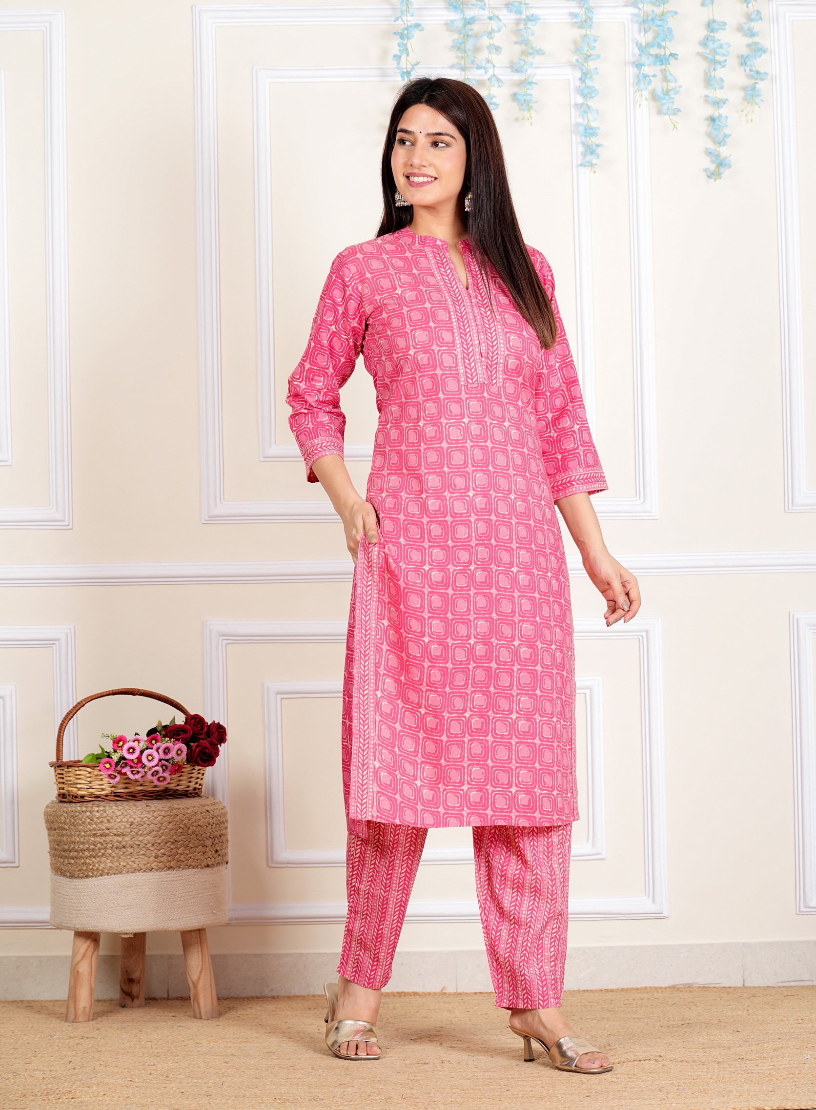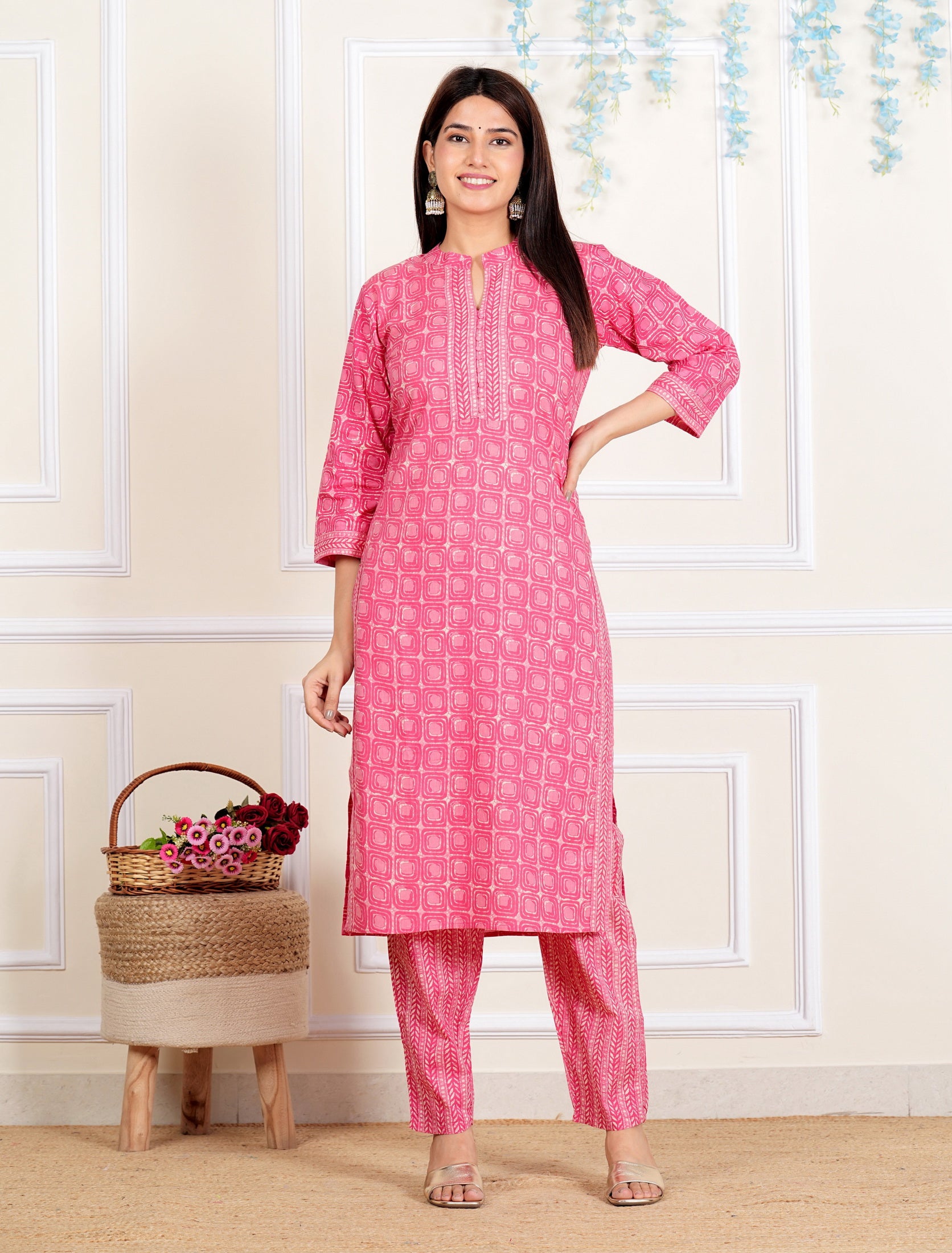 Get ready to add some fun and style to your wardrobe with our Pink Printed Straight Cotton Kurta Set! Made from soft and breathable cotton, this set features a playful pink print that will surely make a statement. Perfect for casual outings or dress it up for a quirky and unique look.