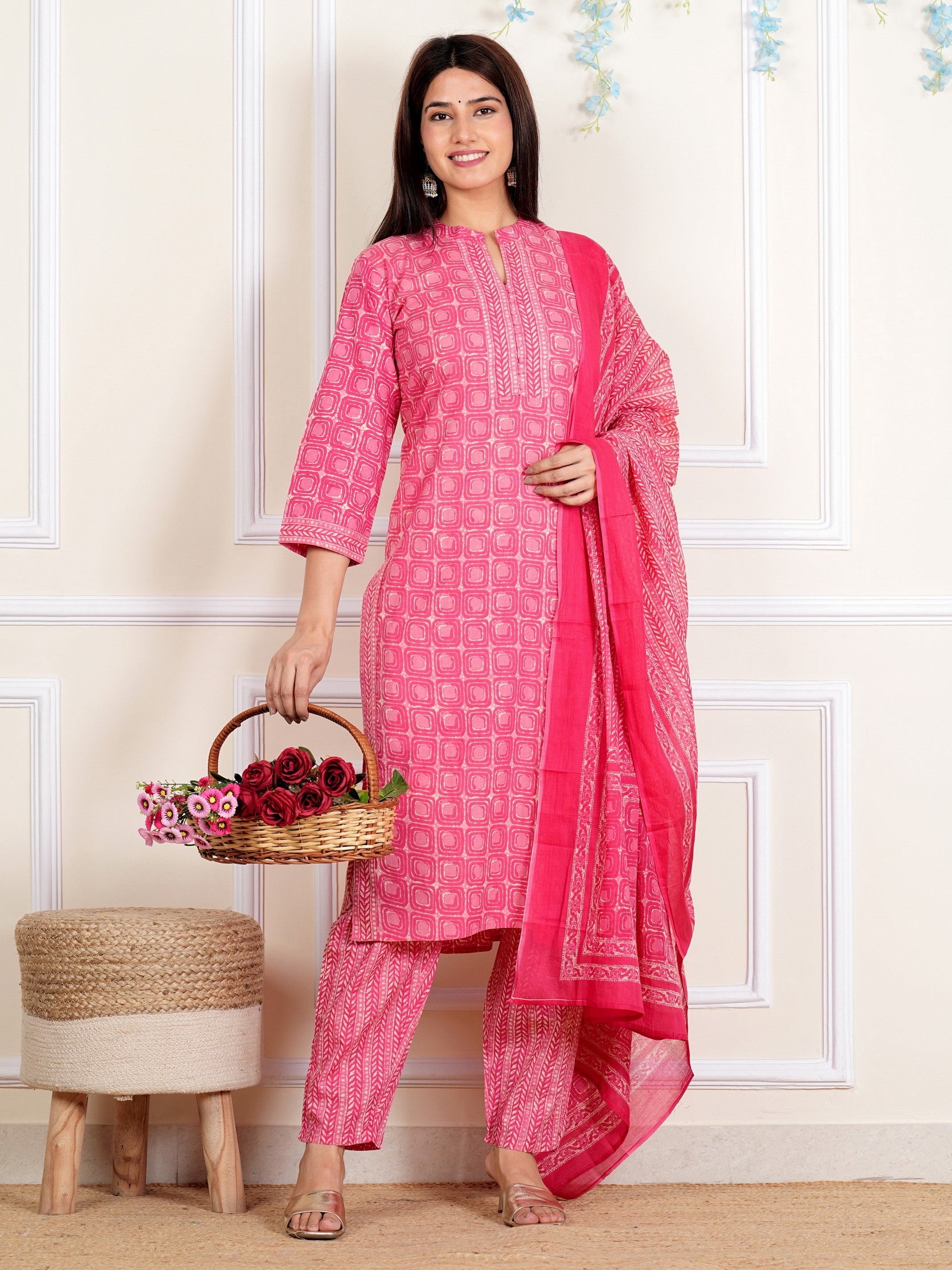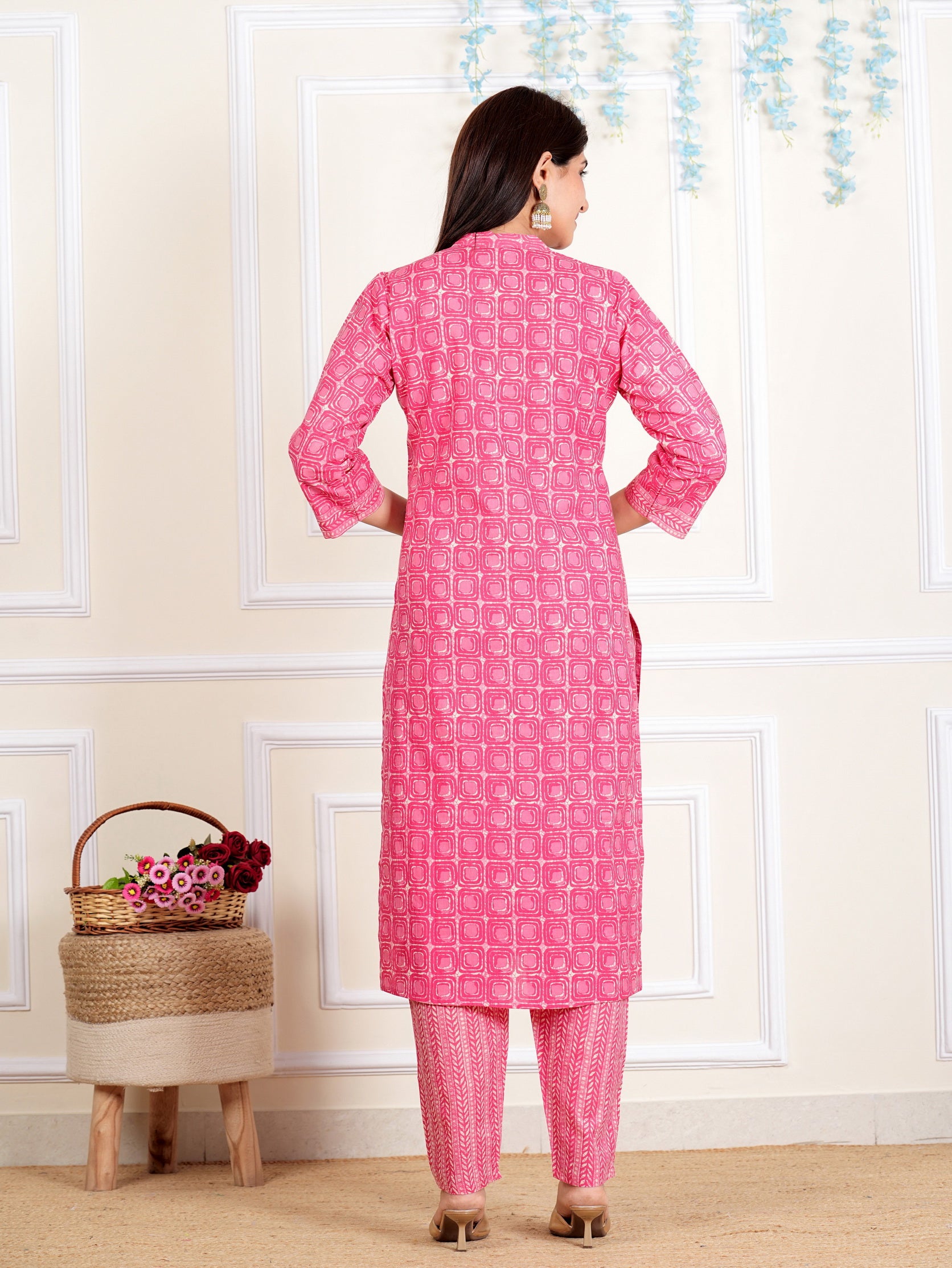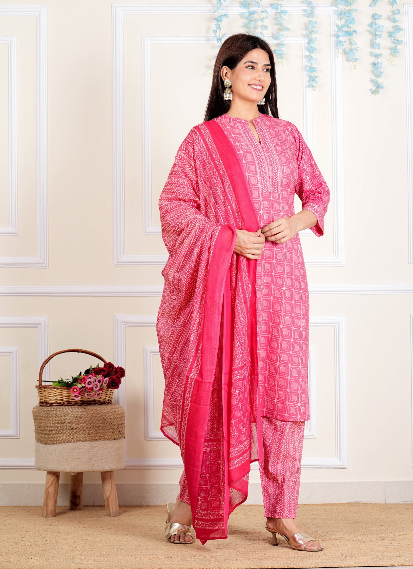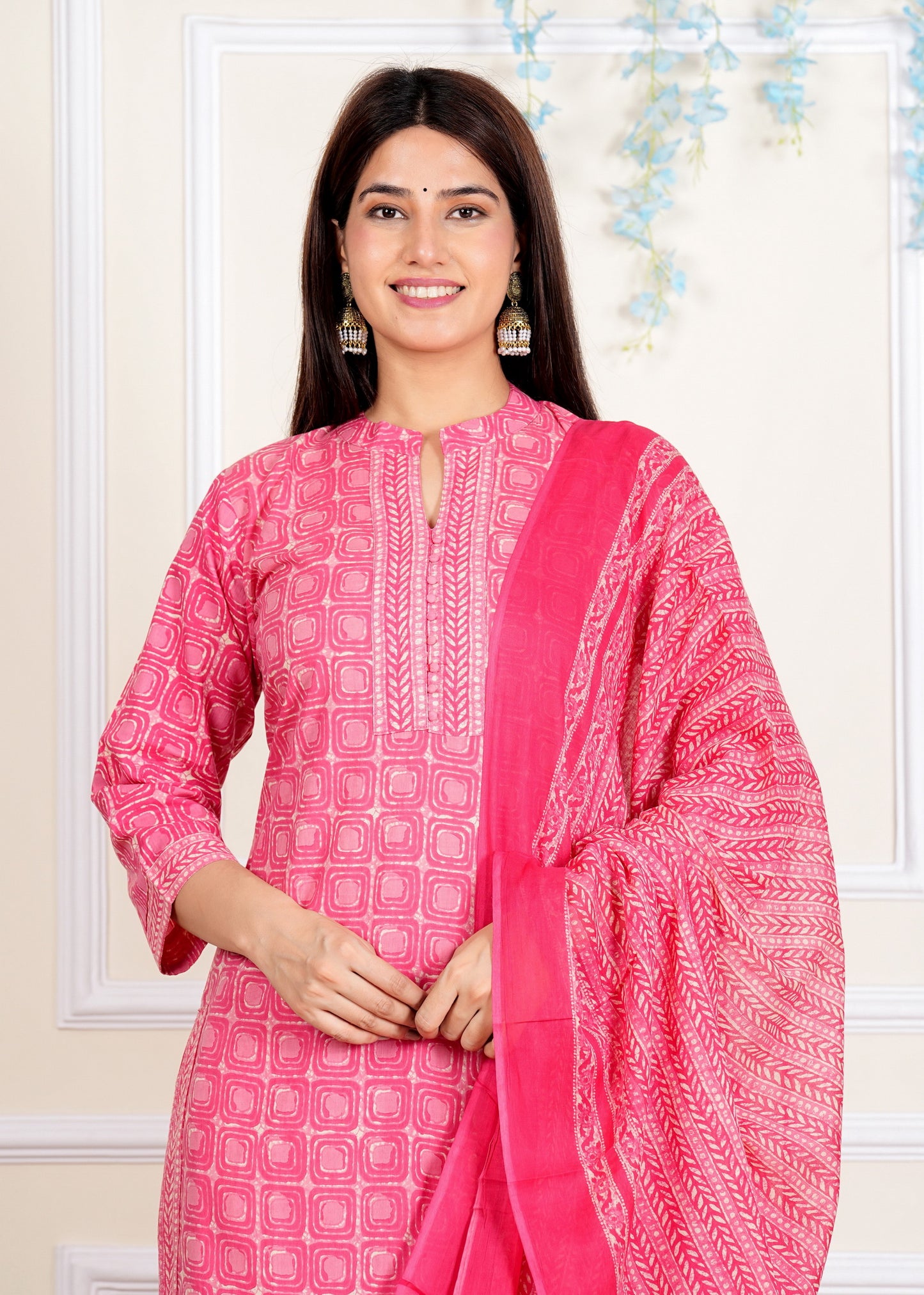Get ready to add some fun and style to your wardrobe with our Pink Printed Straight Cotton Kurta Set! Made from soft and breathable cotton, this set features a playful pink print that will surely make a statement. Perfect for casual outings or dress it up for a quirky and unique look.
