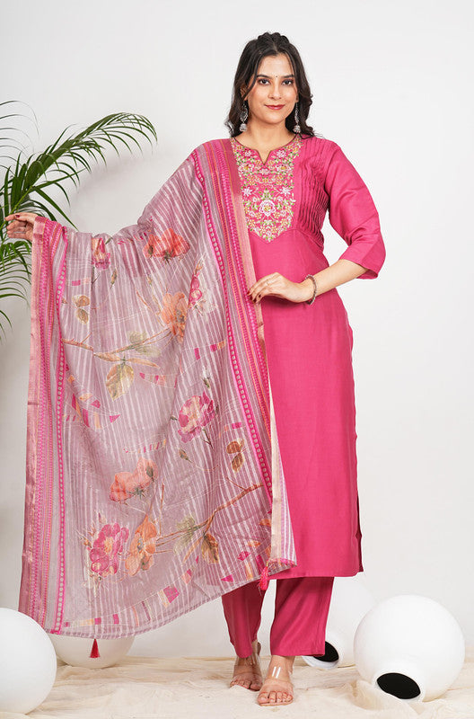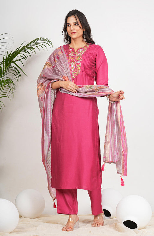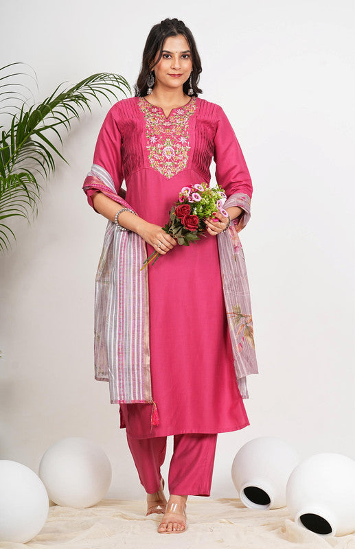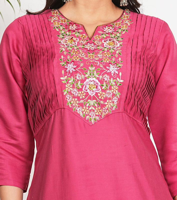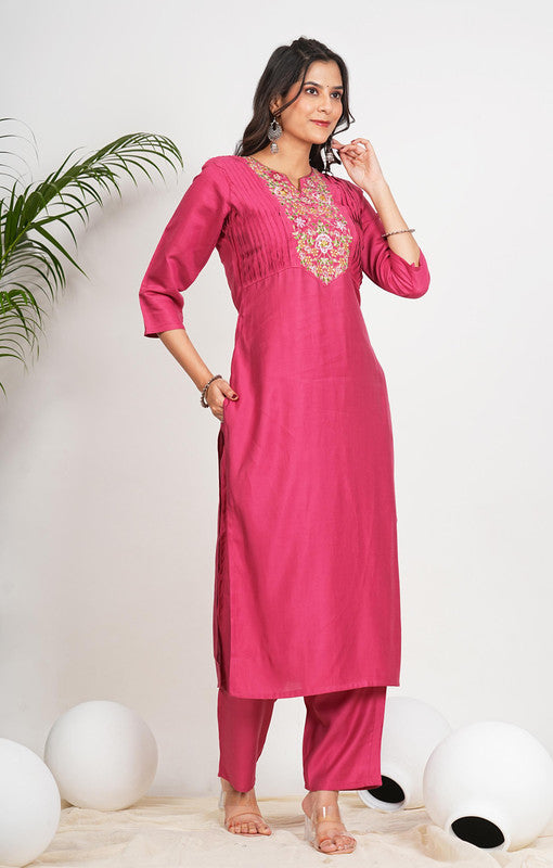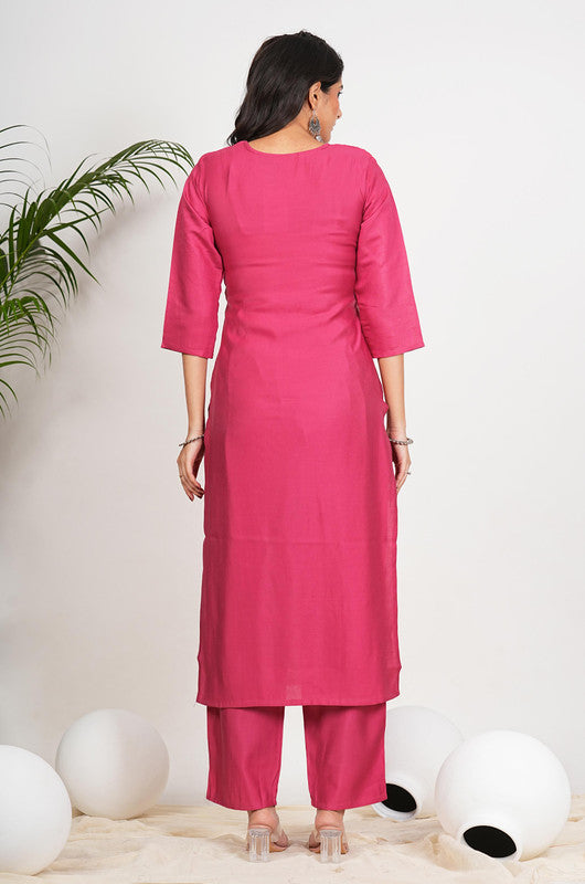 Get ready to be the talk of the town with our Pink Solid With Embroidered Straight Vertican Kurta Set! This stunning set combines unique embroidery with a classic straight fit for a bold and stylish look. Perfect for any occasion, this set is the ultimate combination of comfort and fashion. Don't miss out!