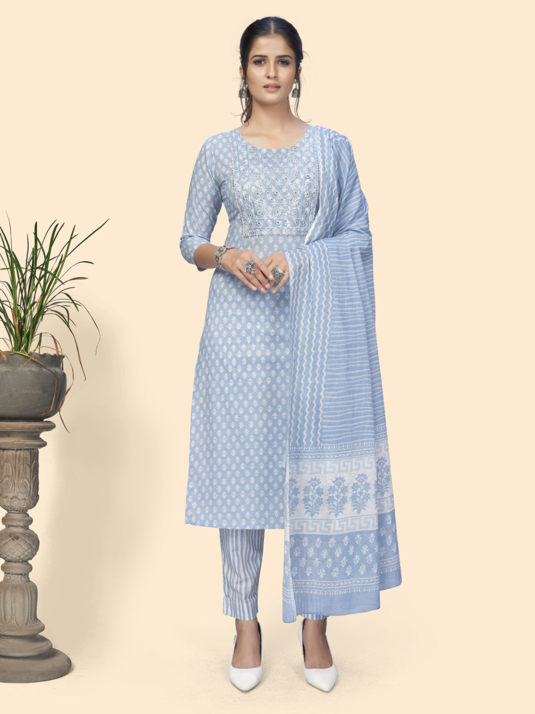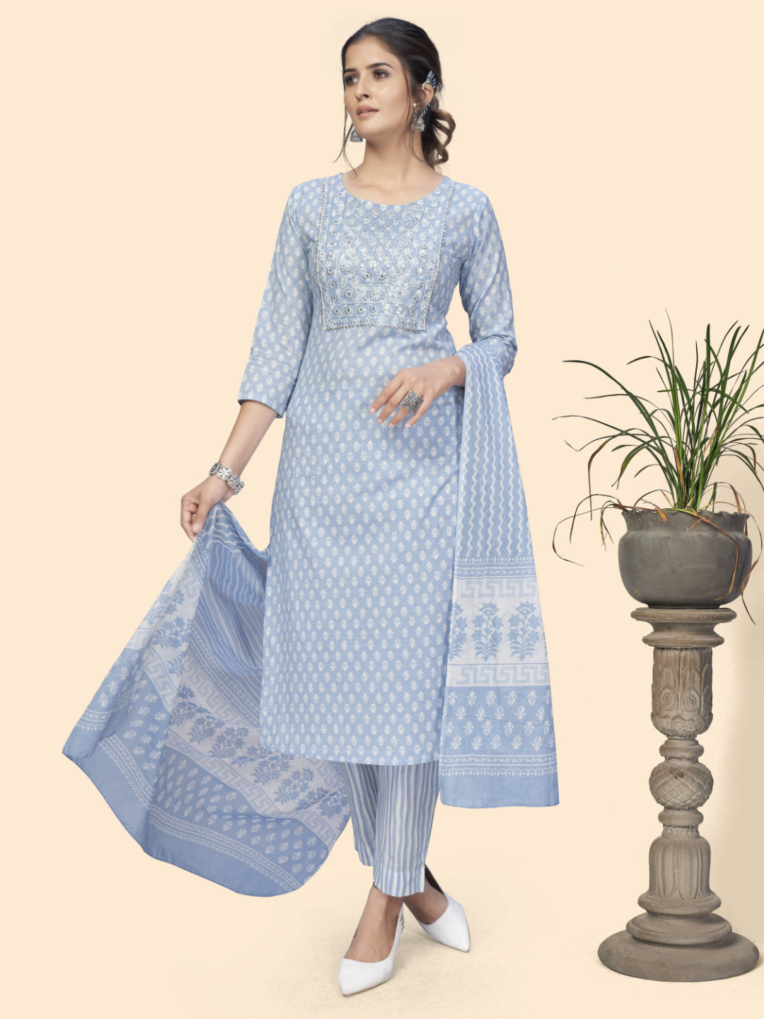 This Print & Embroidered Straight Cotton Sky Blue Kurta Pant With Dupatta from Vbuyz is a stylish and attractive addition to any wardrobe. The kurta pant is made from soft cotton and features intricate embroidery and print designs. The dupatta adds a touch of elegance to the ensemble.