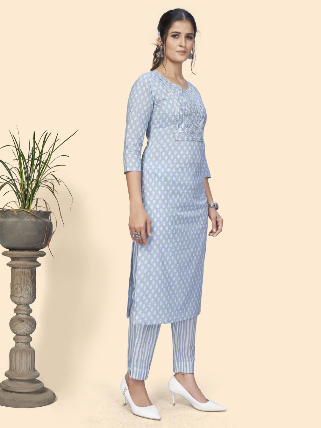 Sky Blue Embroidered Straight Cotton Kurta Set