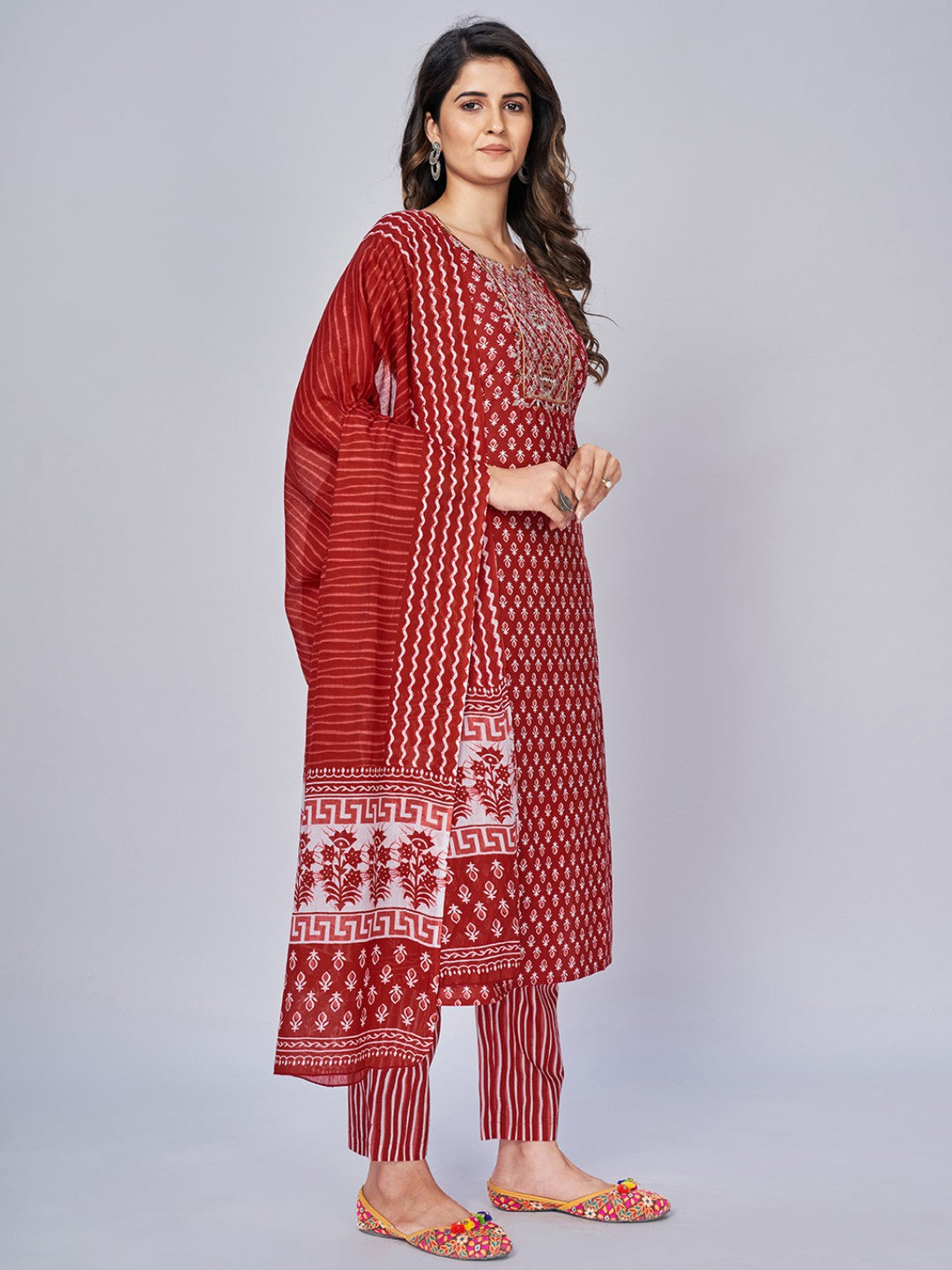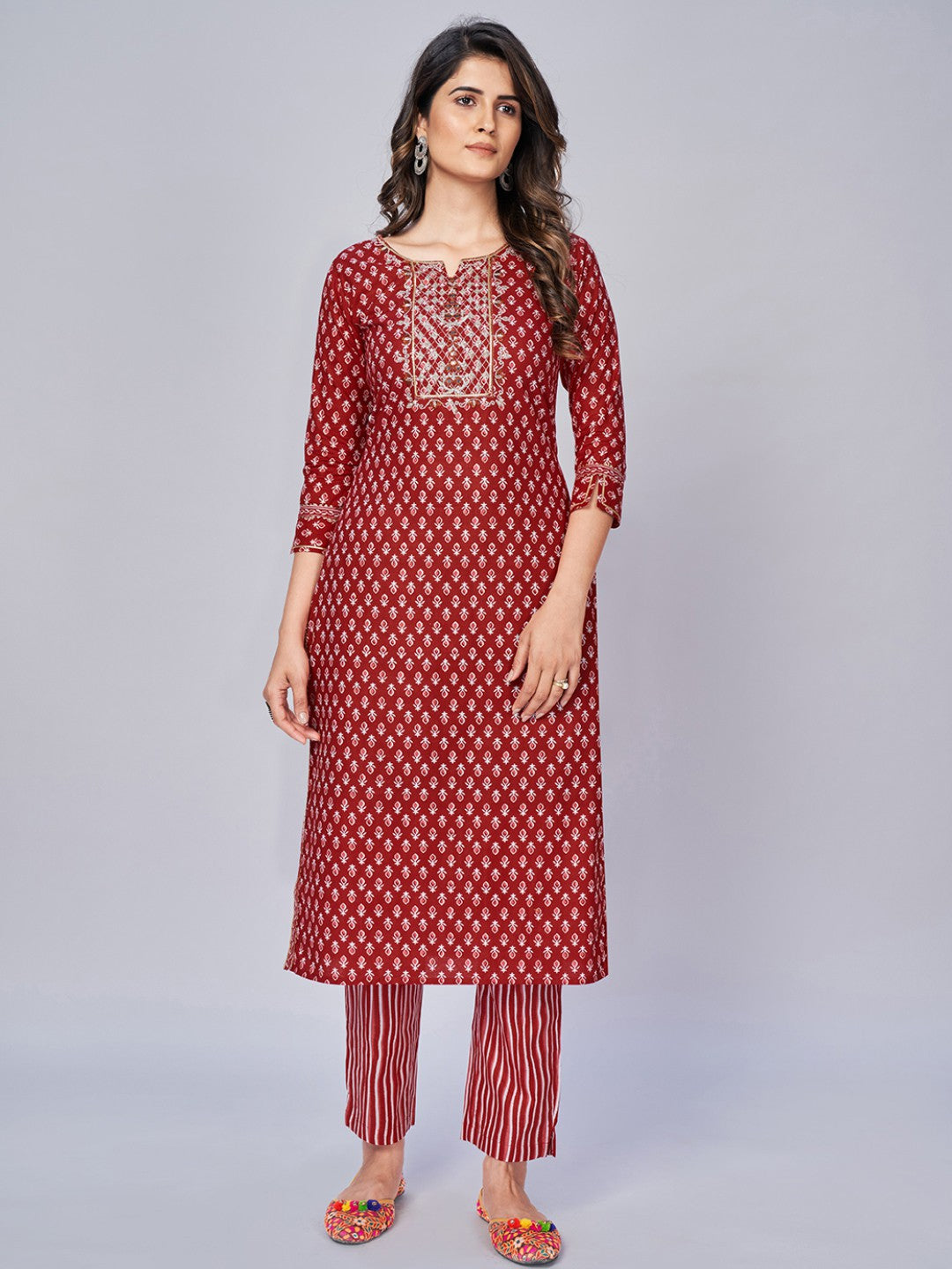 Red Embroidered Straight Cotton Kurta Set