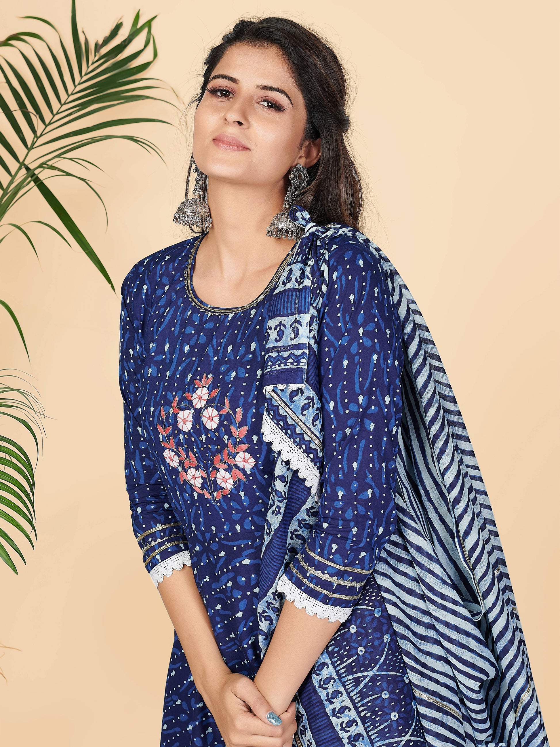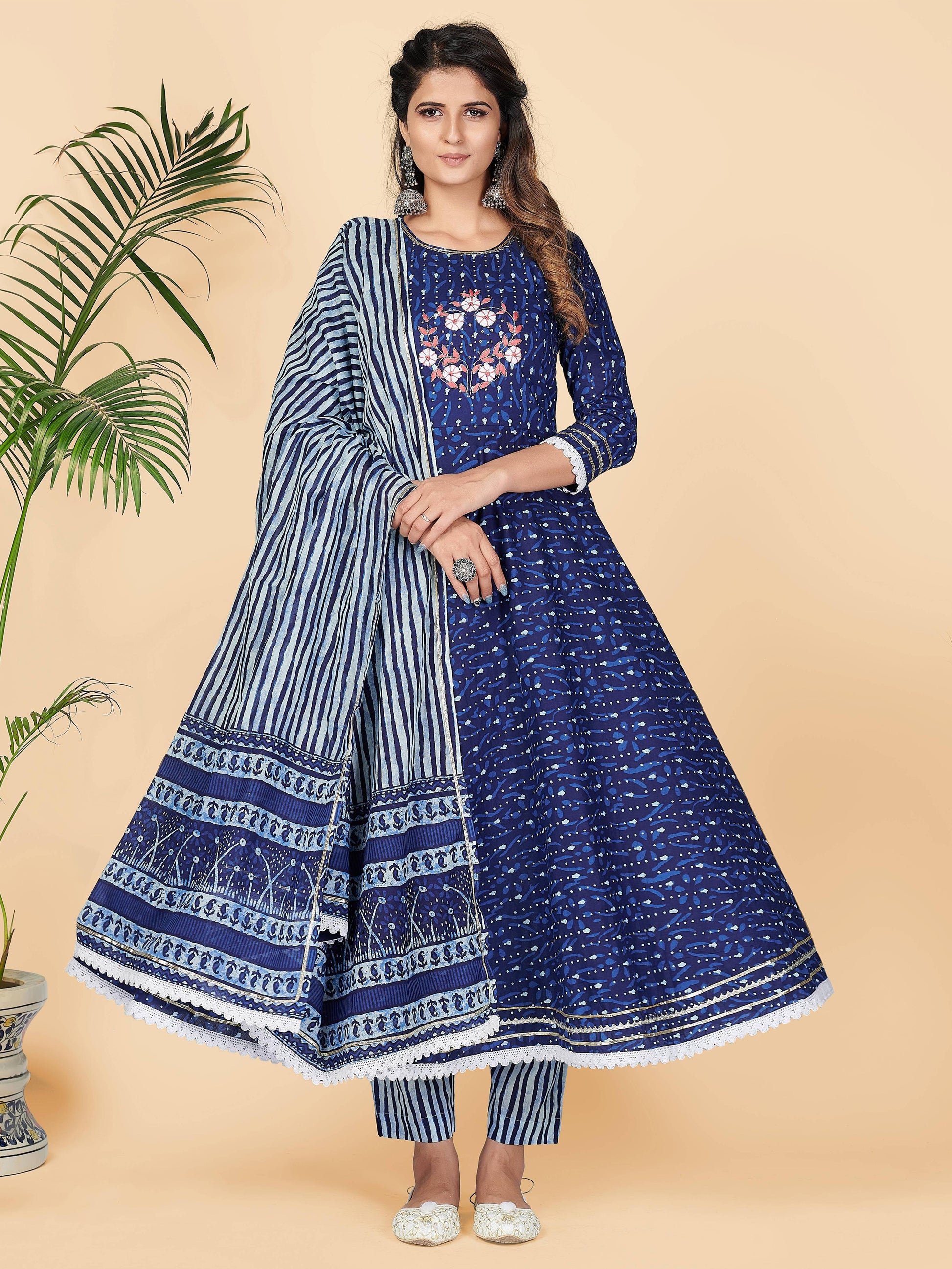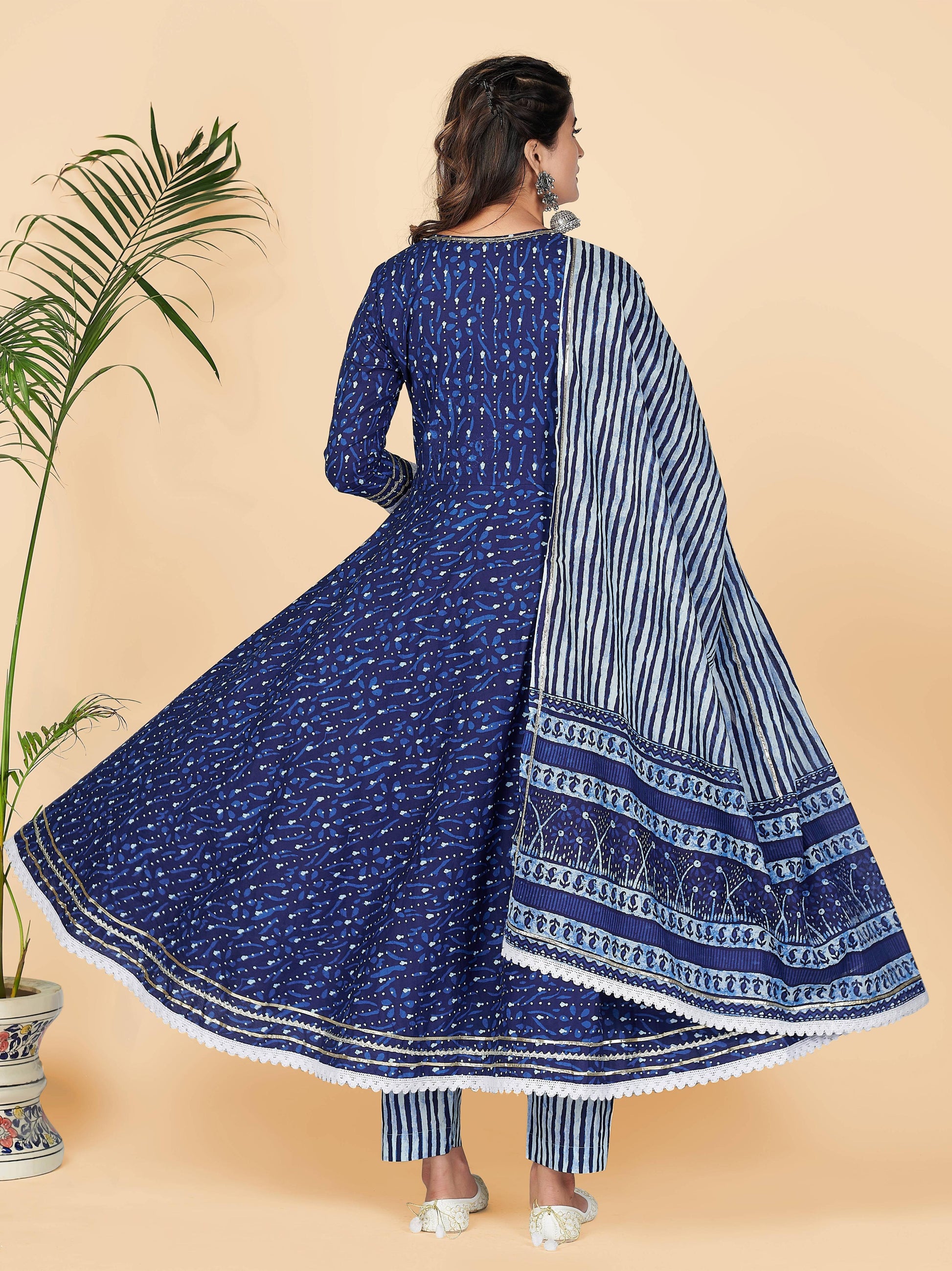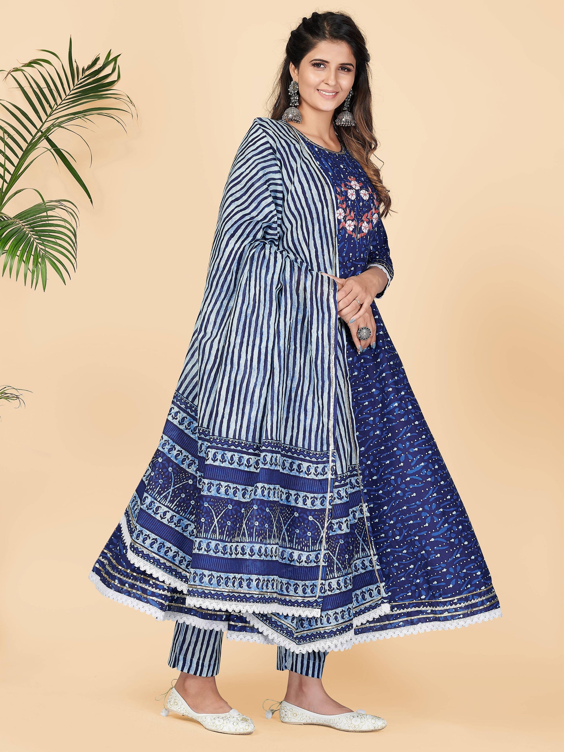 Blue Printed Anarkali Cotton Kurta Set