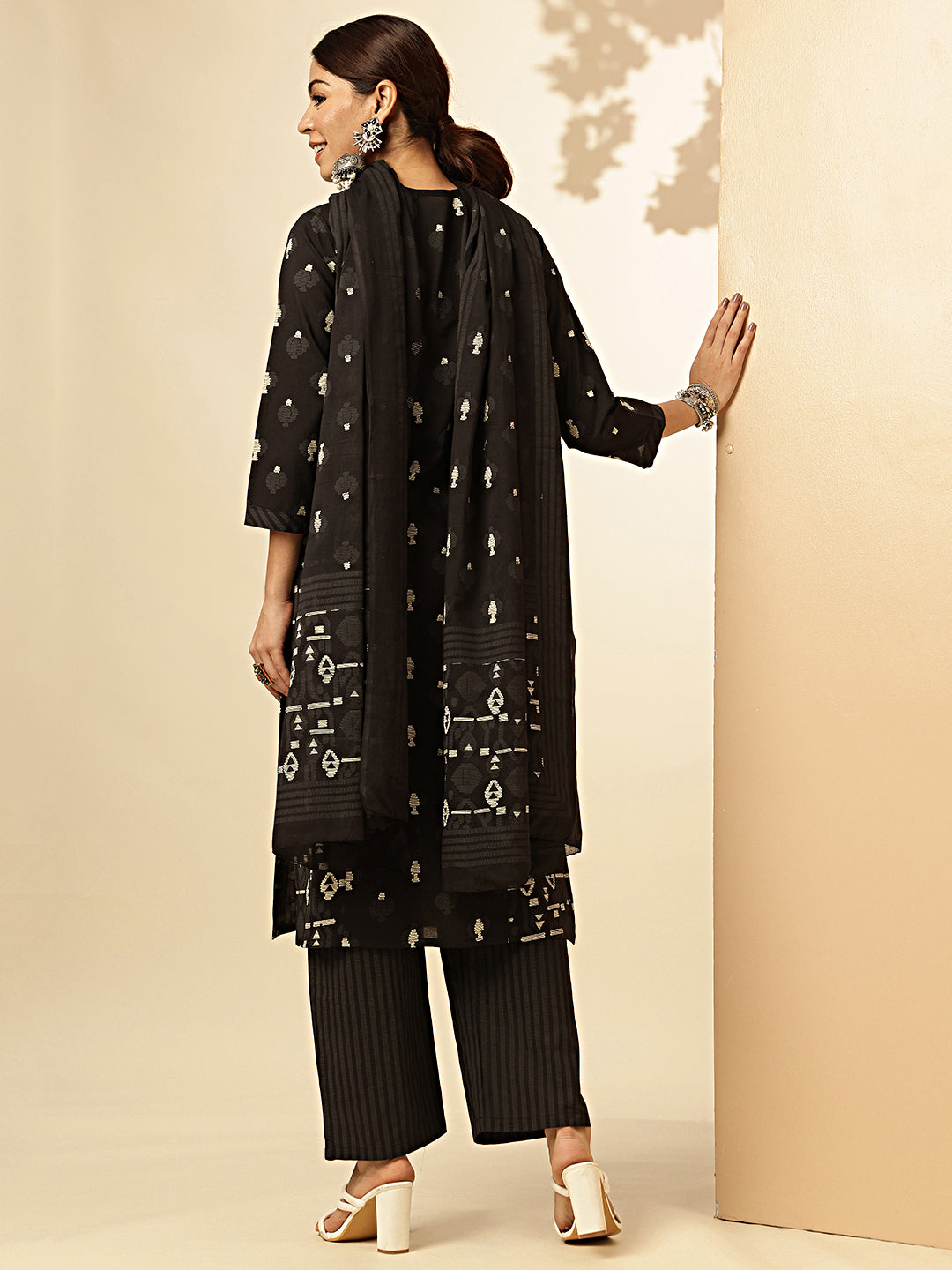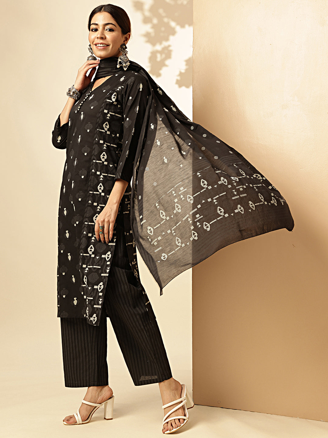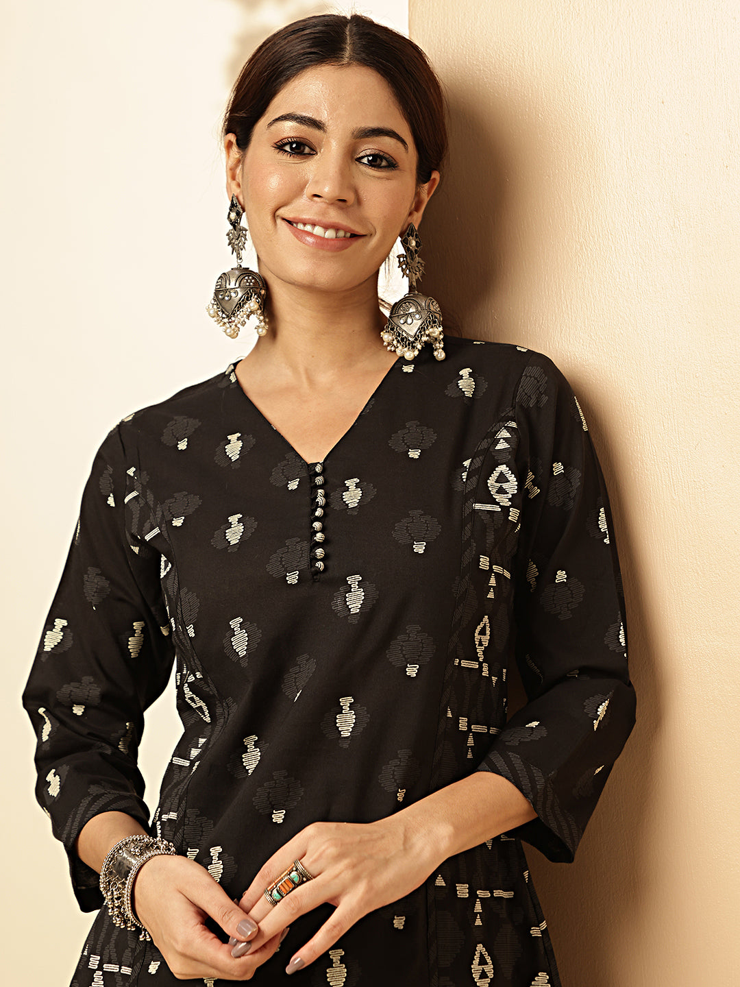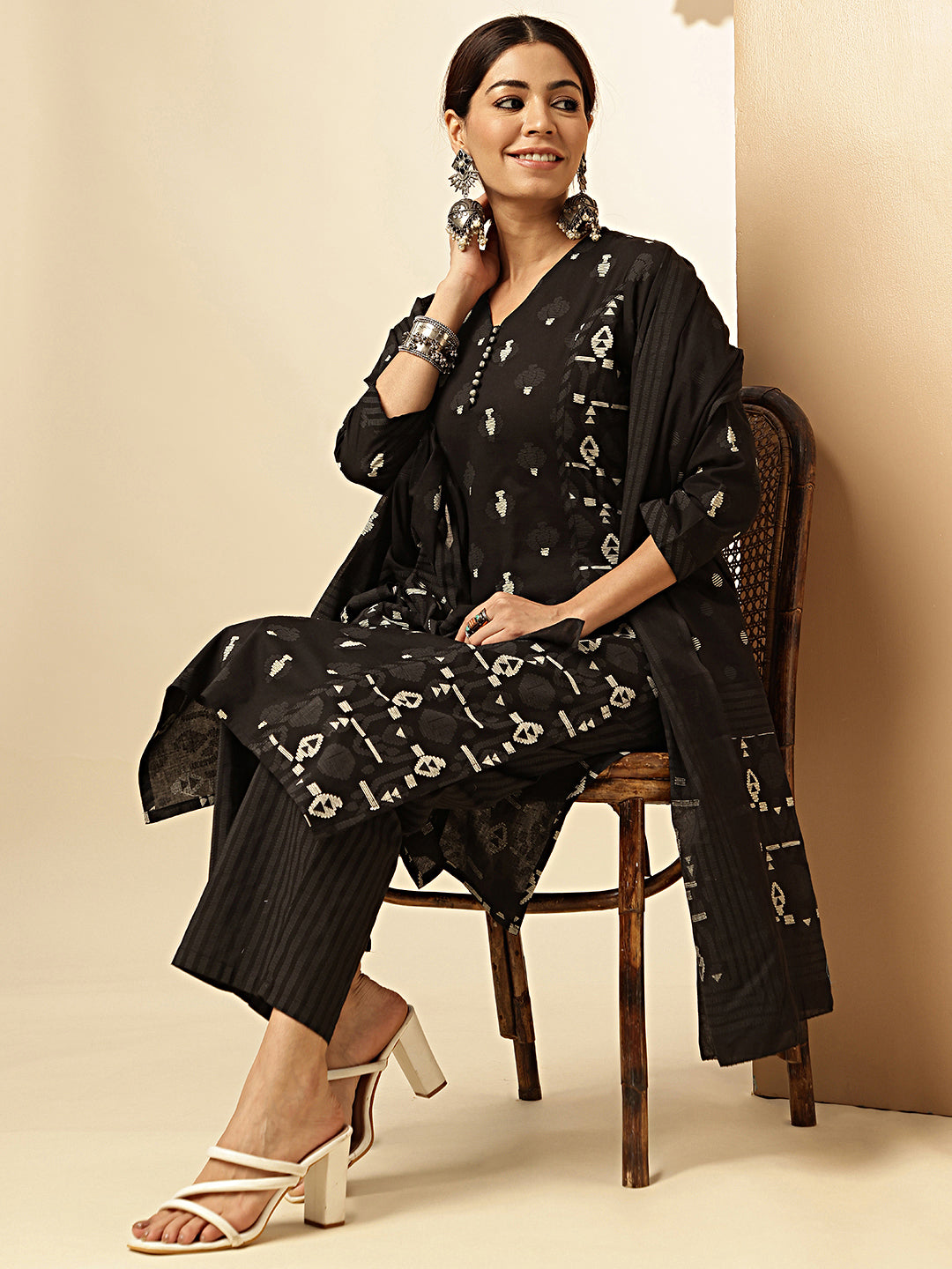 Step up your style game with this funky and playful Black Printed Straight Cotton Stitched Kurta Set. Made with high-quality cotton, this set features a unique black print design, giving it a trendy and eye-catching look. Perfect for any occasion, this kurta set is sure to make you stand out in the most fun and quirky way possible!