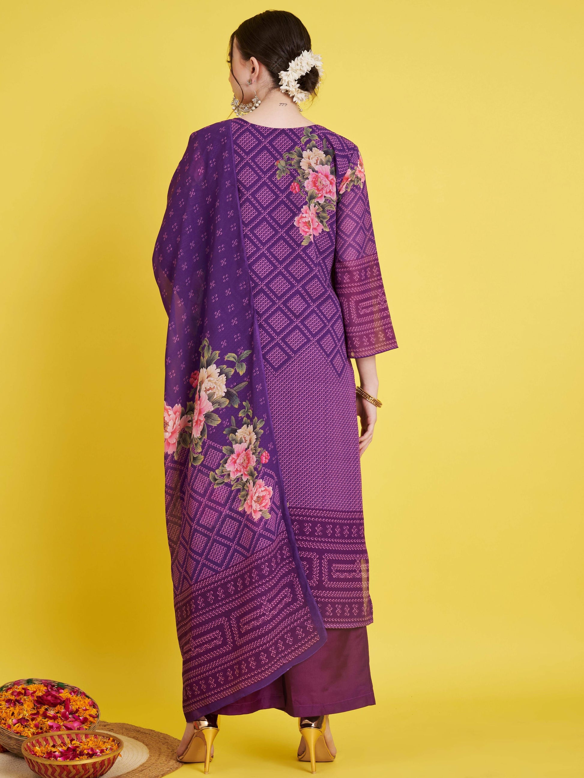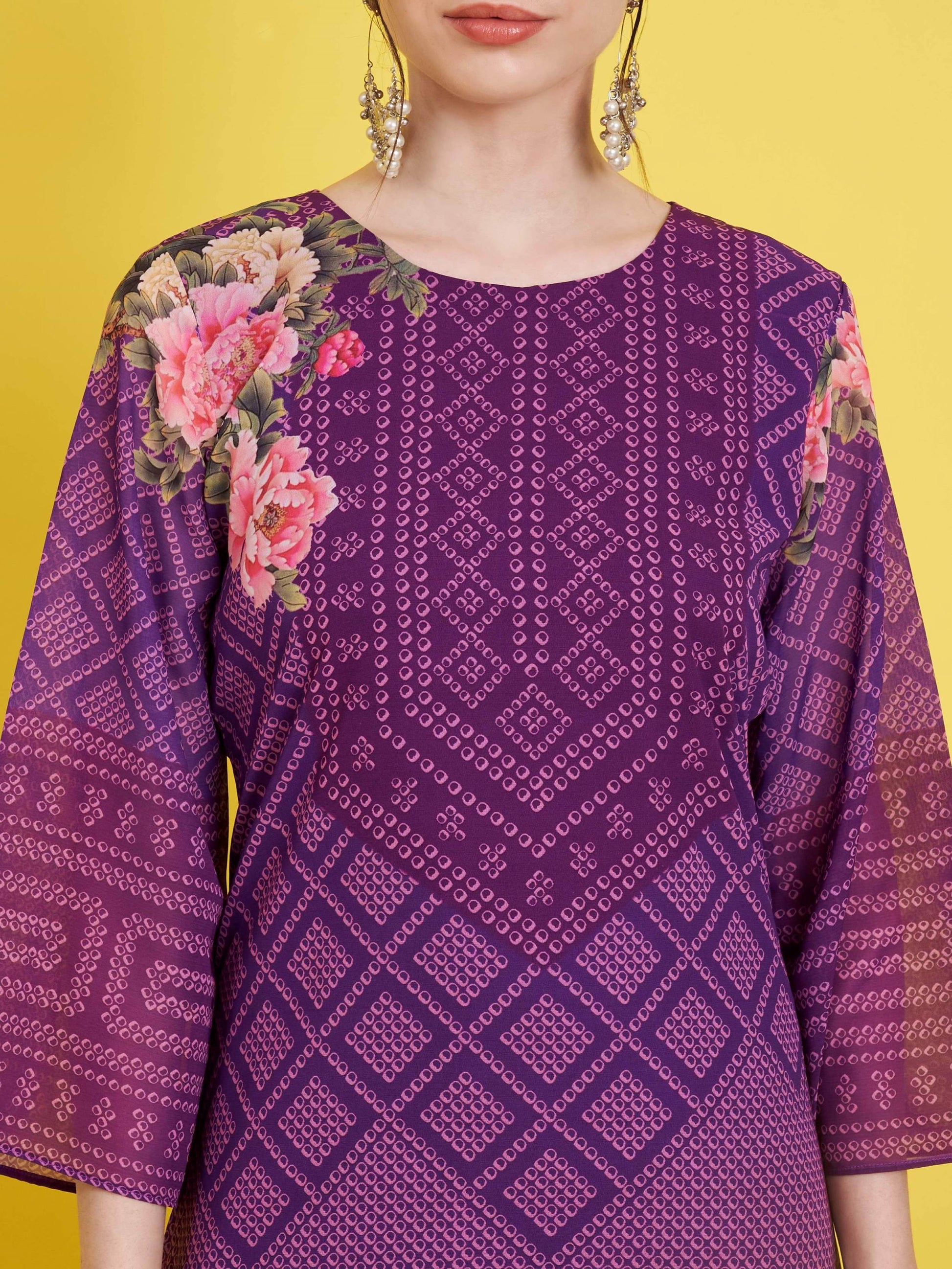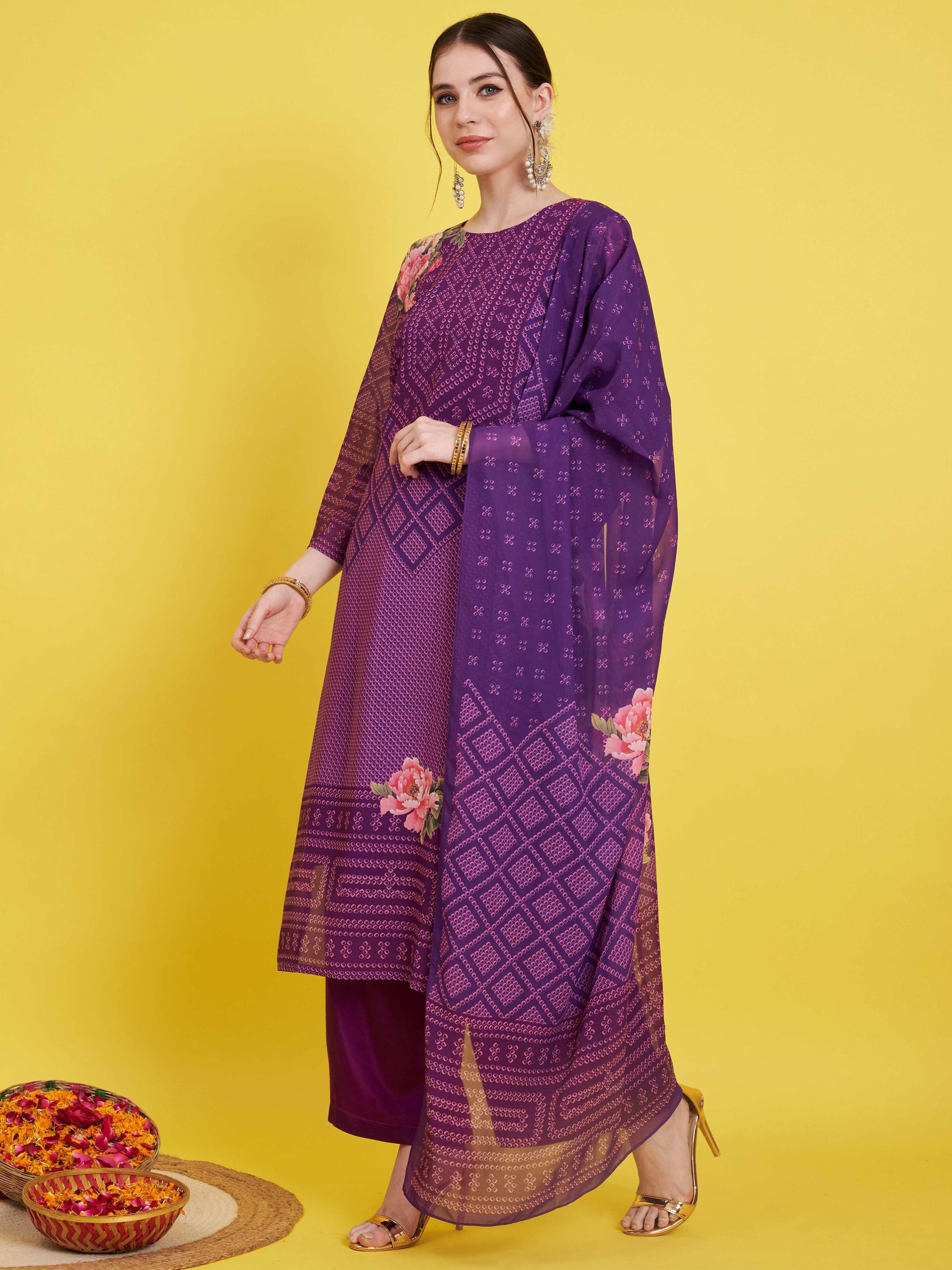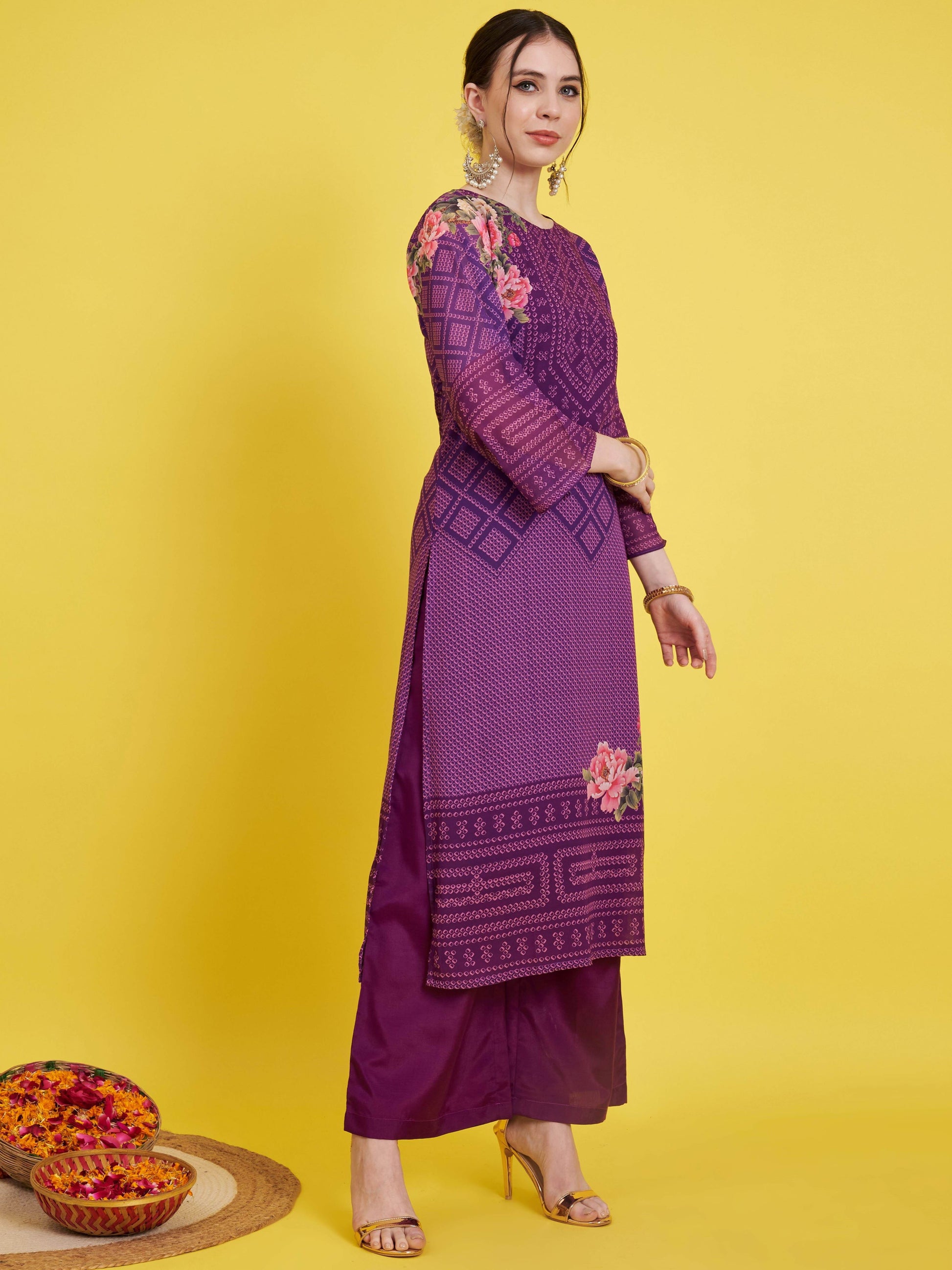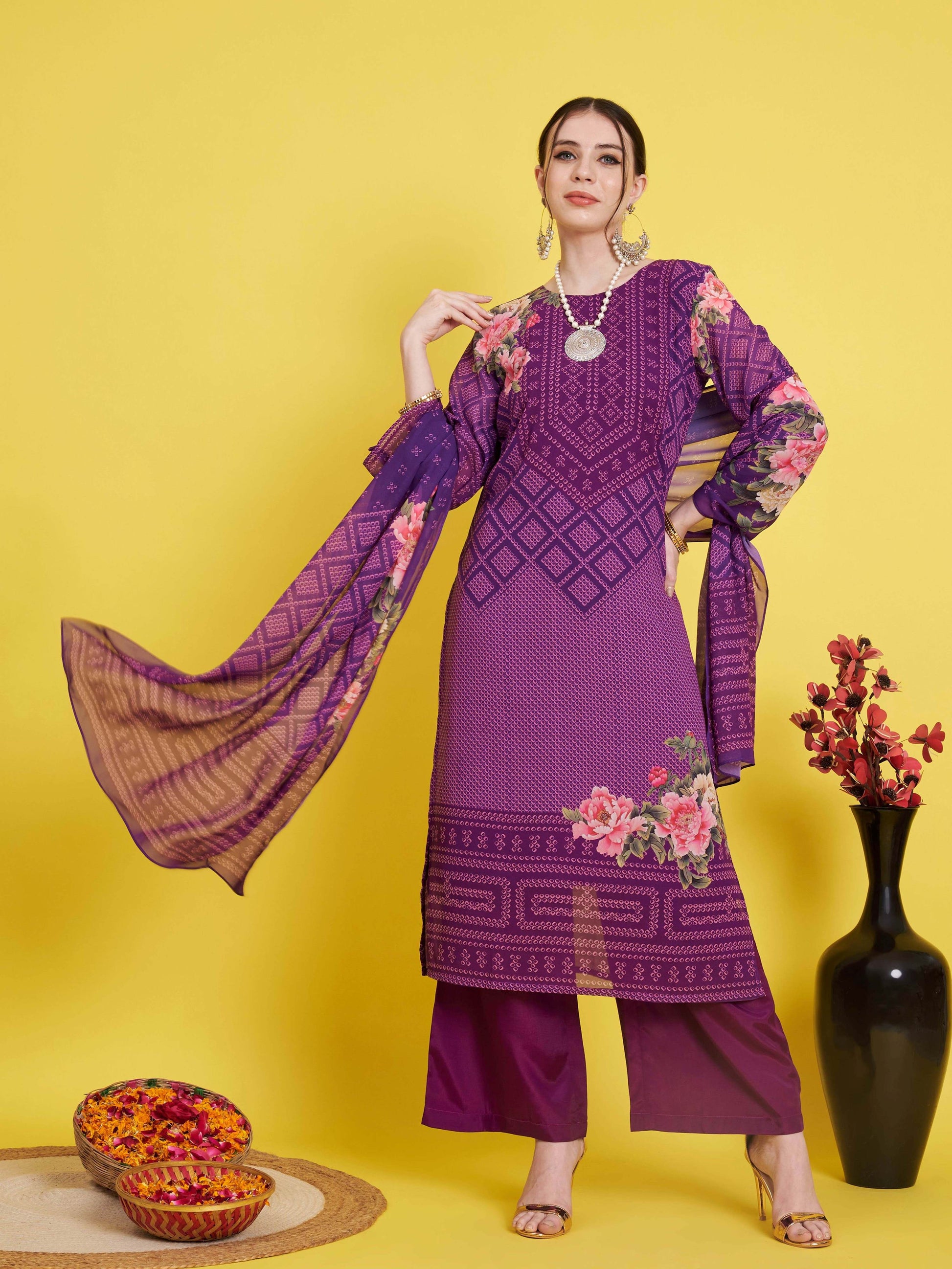 "Get ready to make a statement in our Purple Bandhani Straight Georgette Stitched Kurta Set. The intricate bandhani design adds a playful touch while the stitched kurta provides a comfortable fit. Perfect for any occasion, this set is both stylish and quirky."