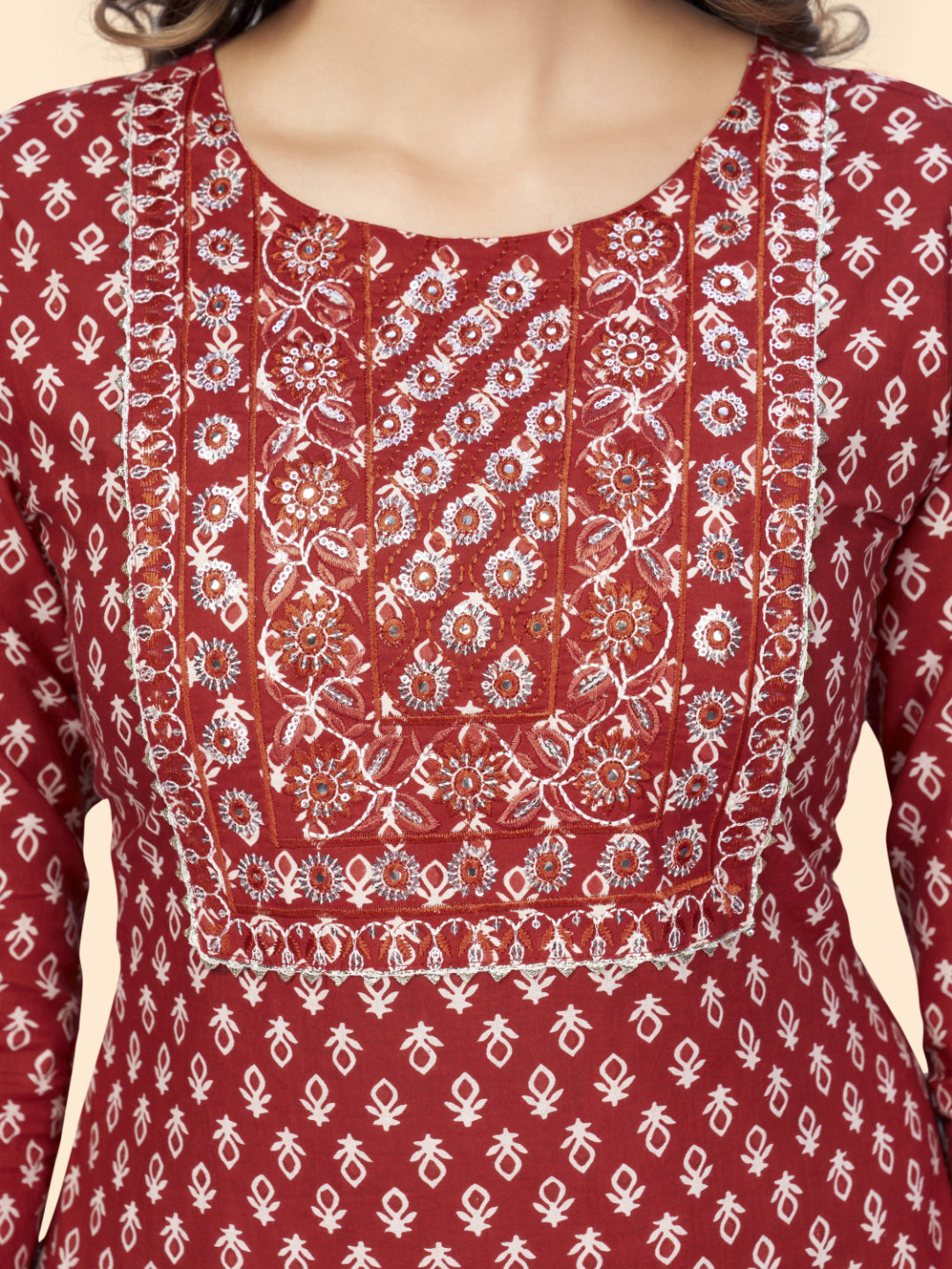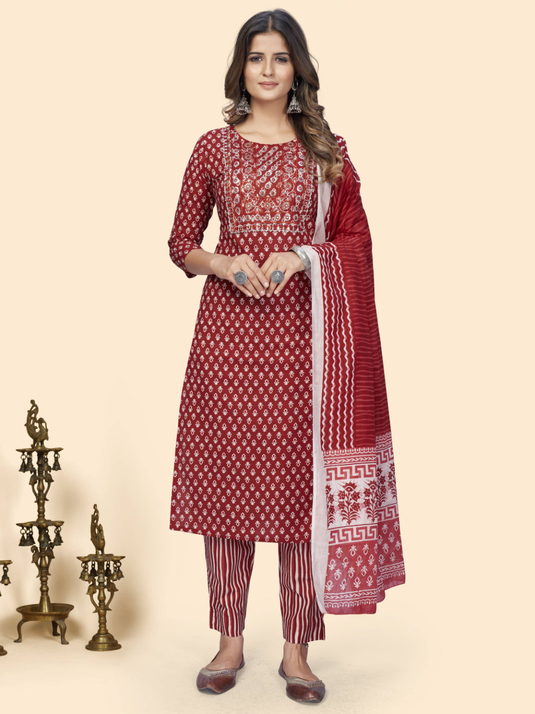 Be the show-stopper with this beautiful Red Embroidered Straight Cotton Kurta Set. The festive-wear set makes a statement with its stunning red color and elegant embroidery detail. Crafted with the finest cotton, it is sure to be a treasured wardrobe favorite this season!