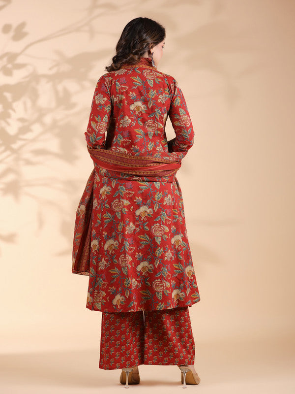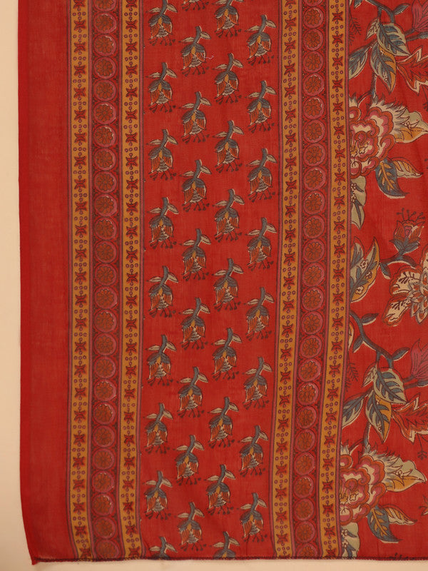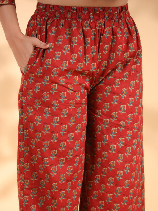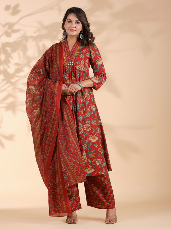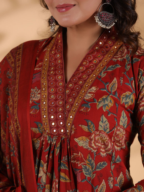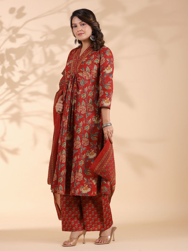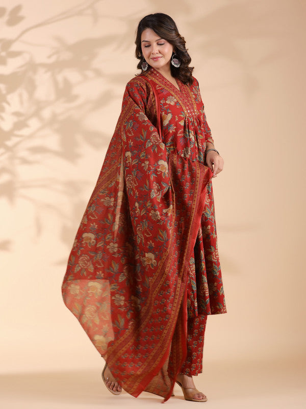 Red Floral Print Alia Cut Cotton Stitched Kurta Set