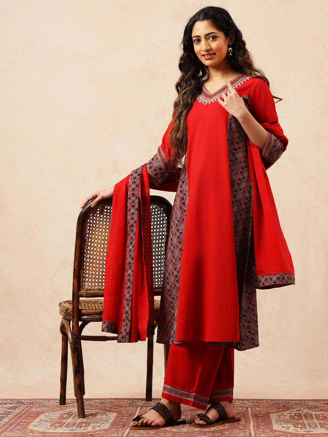 Red Solid A-Line Cotton Stitched Kurta, Palazzo With Dupatta