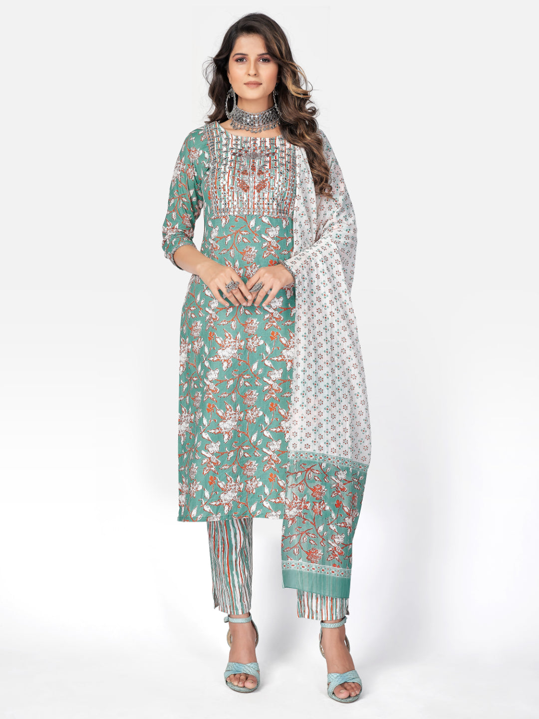 Take a plunge into the sea of style with this Sea Green Embroidered Straight Cotton Kurta Set. Perfect for casual dressing or festive wear, this set allows you to make a splash with your wardrobe. Make a bold statement in a sea of mundane outfits with this timeless ensemble.