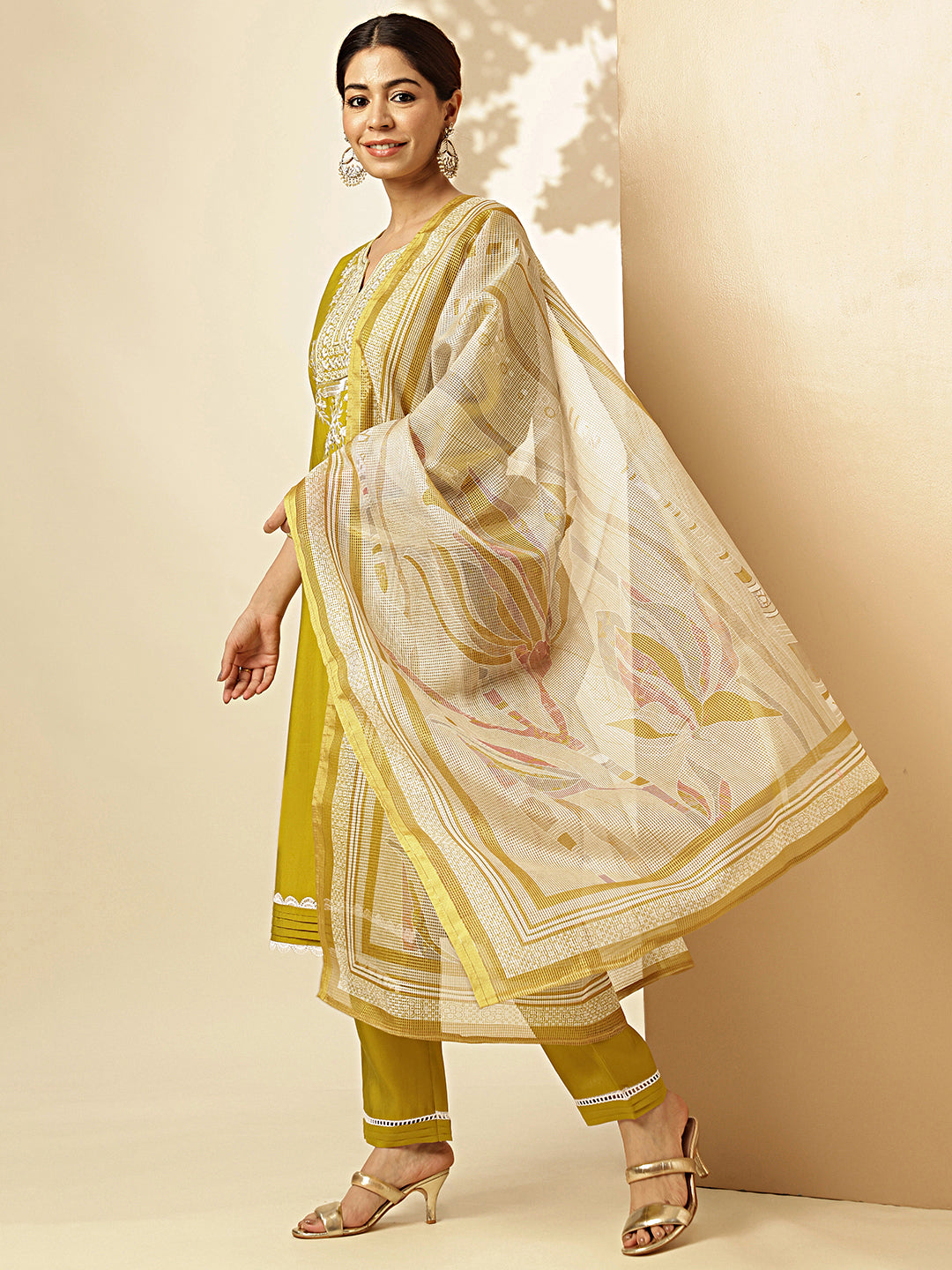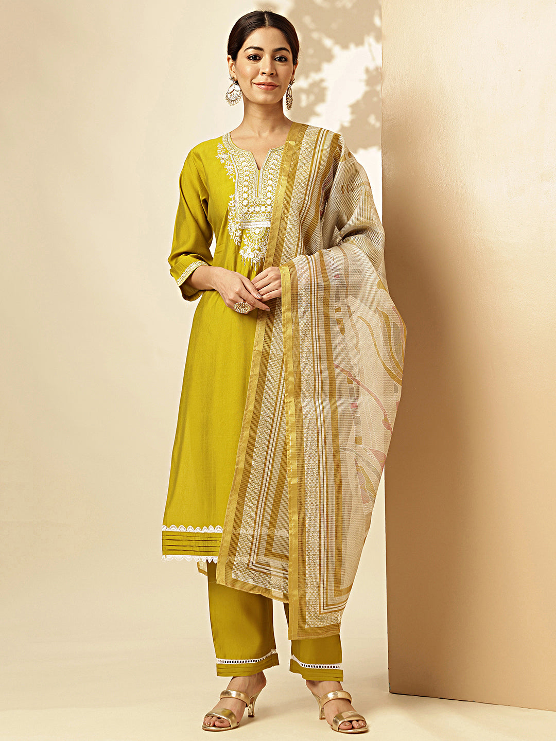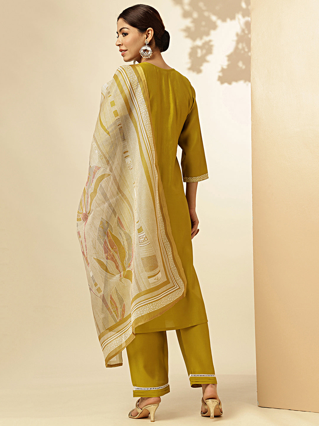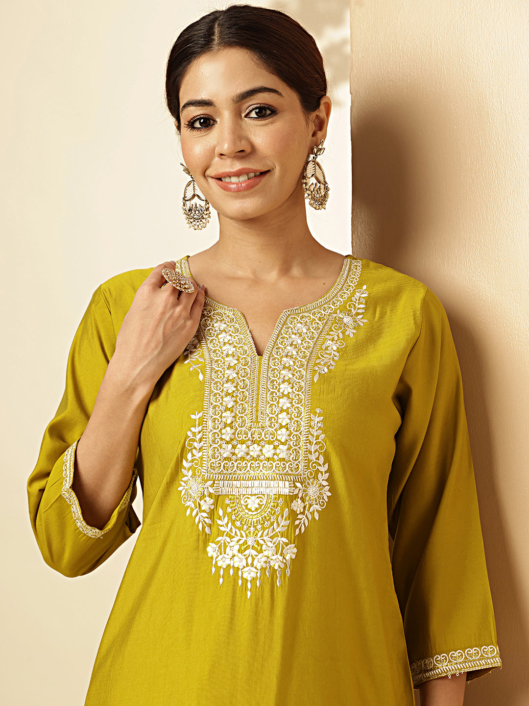 Mustard Solid With Embroidered Straight Roman Silk Stitched Kurta Set