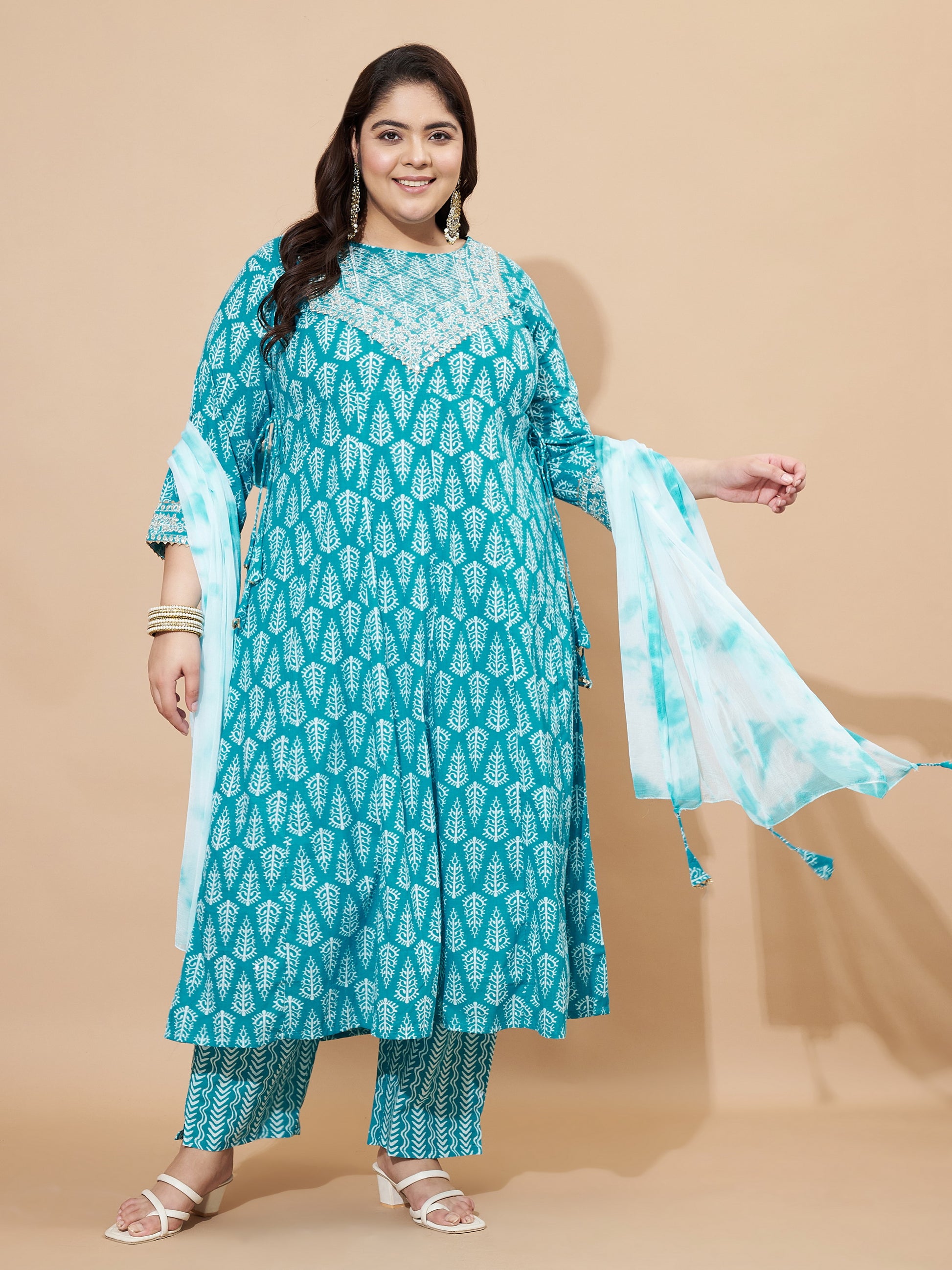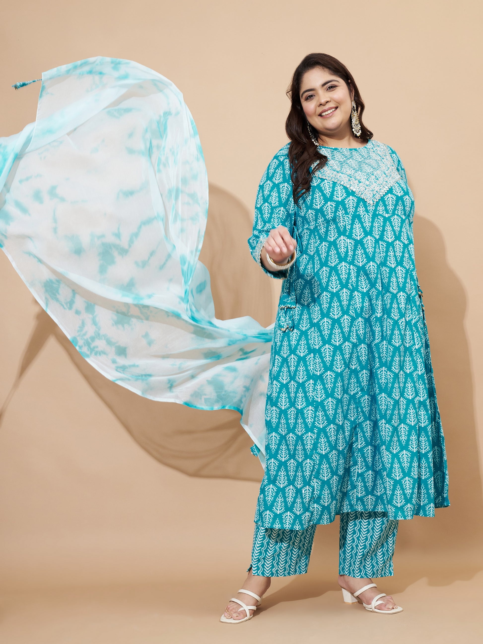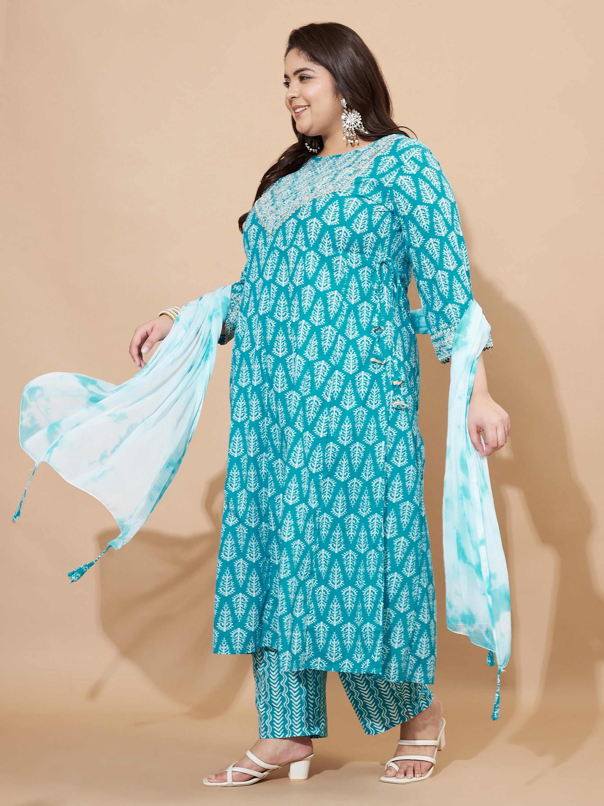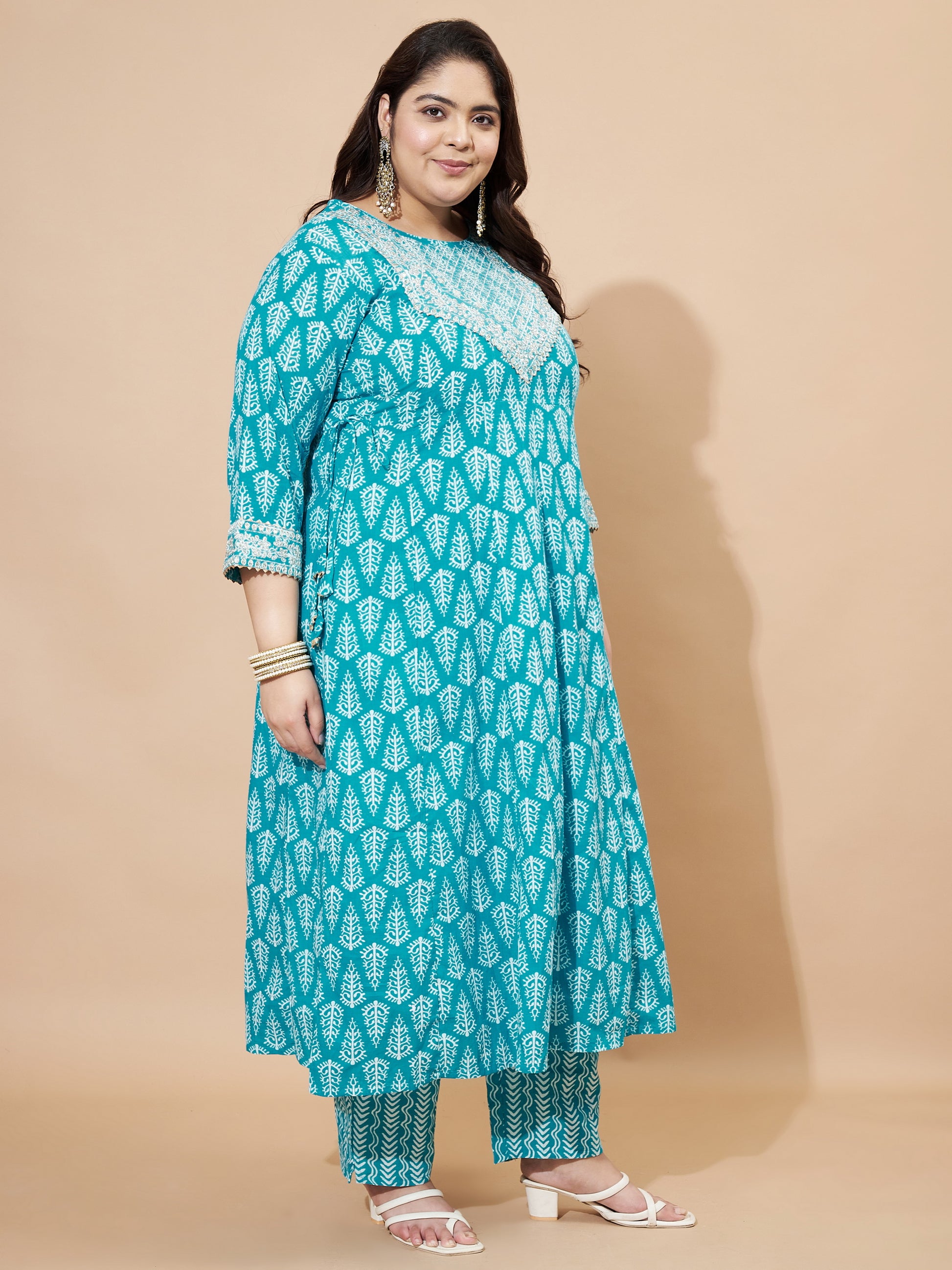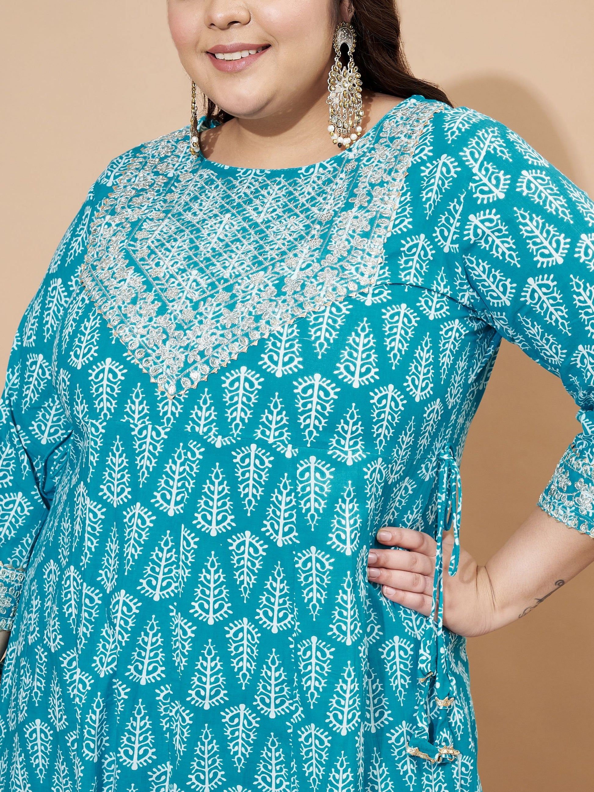 Sky Blue Embellished & Gotta Patti Lace A-Line Cotton Kurta Set