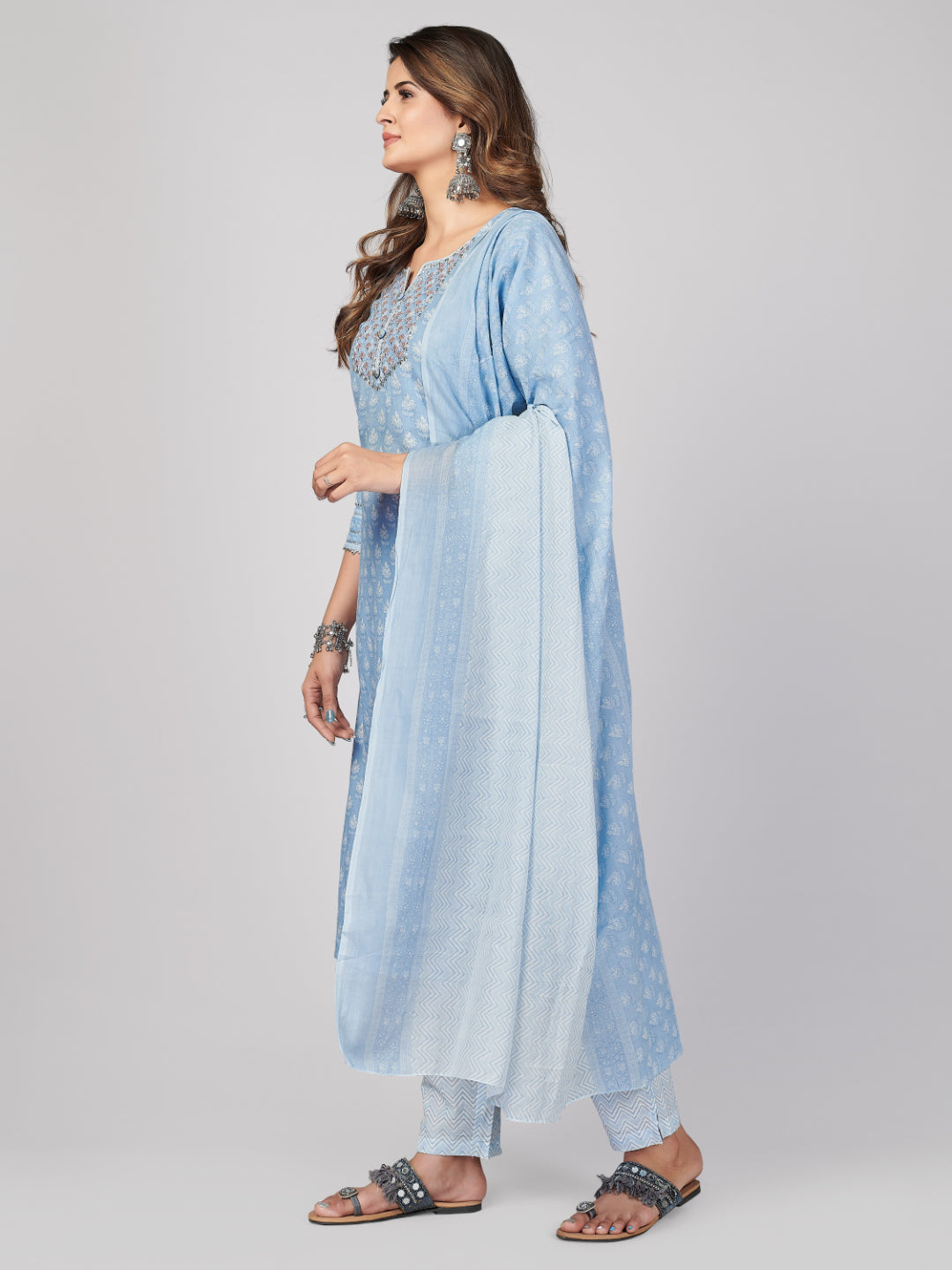 Sky Blue Embroidered Straight Cotton Kurta Set