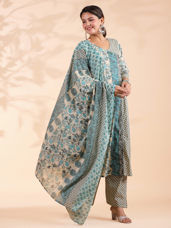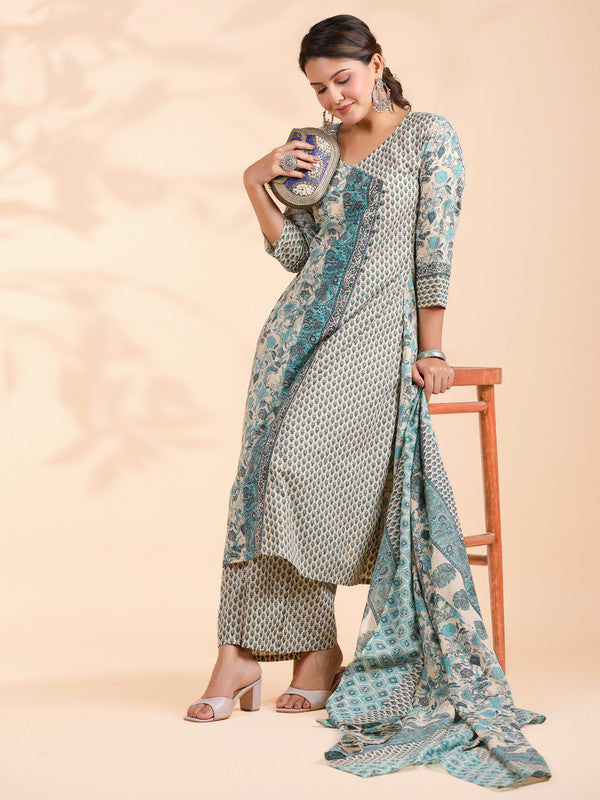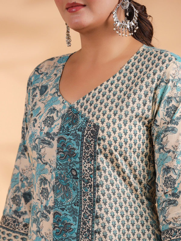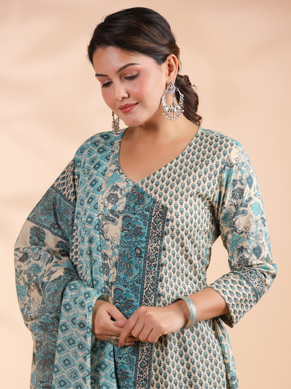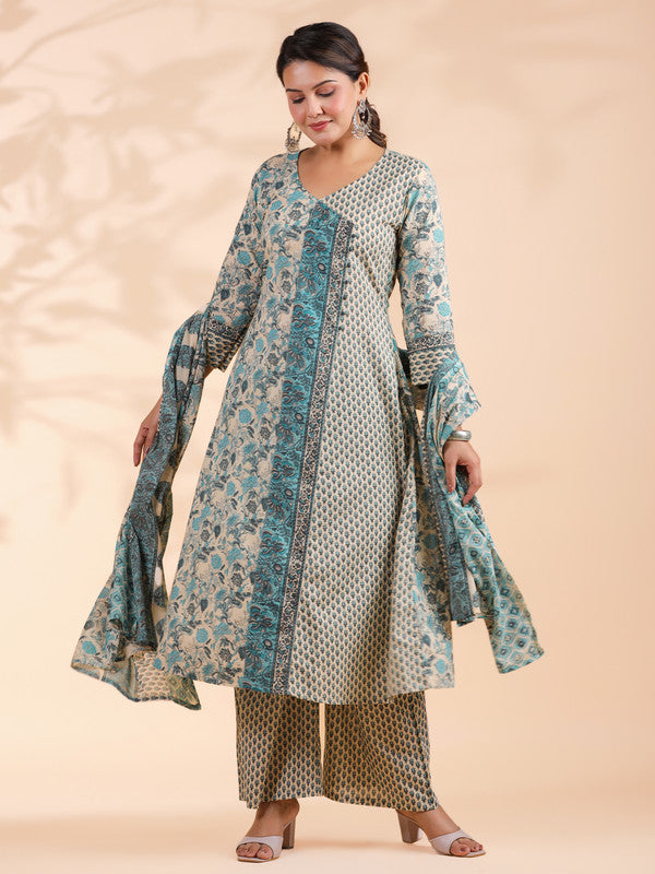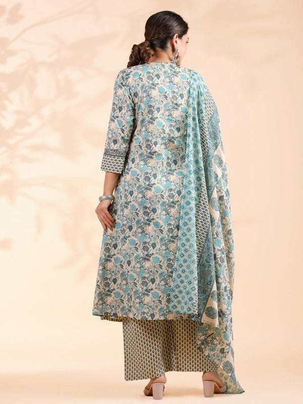 Sky Blue Floral Print A-Line Cotton Stitched Kurta Set
