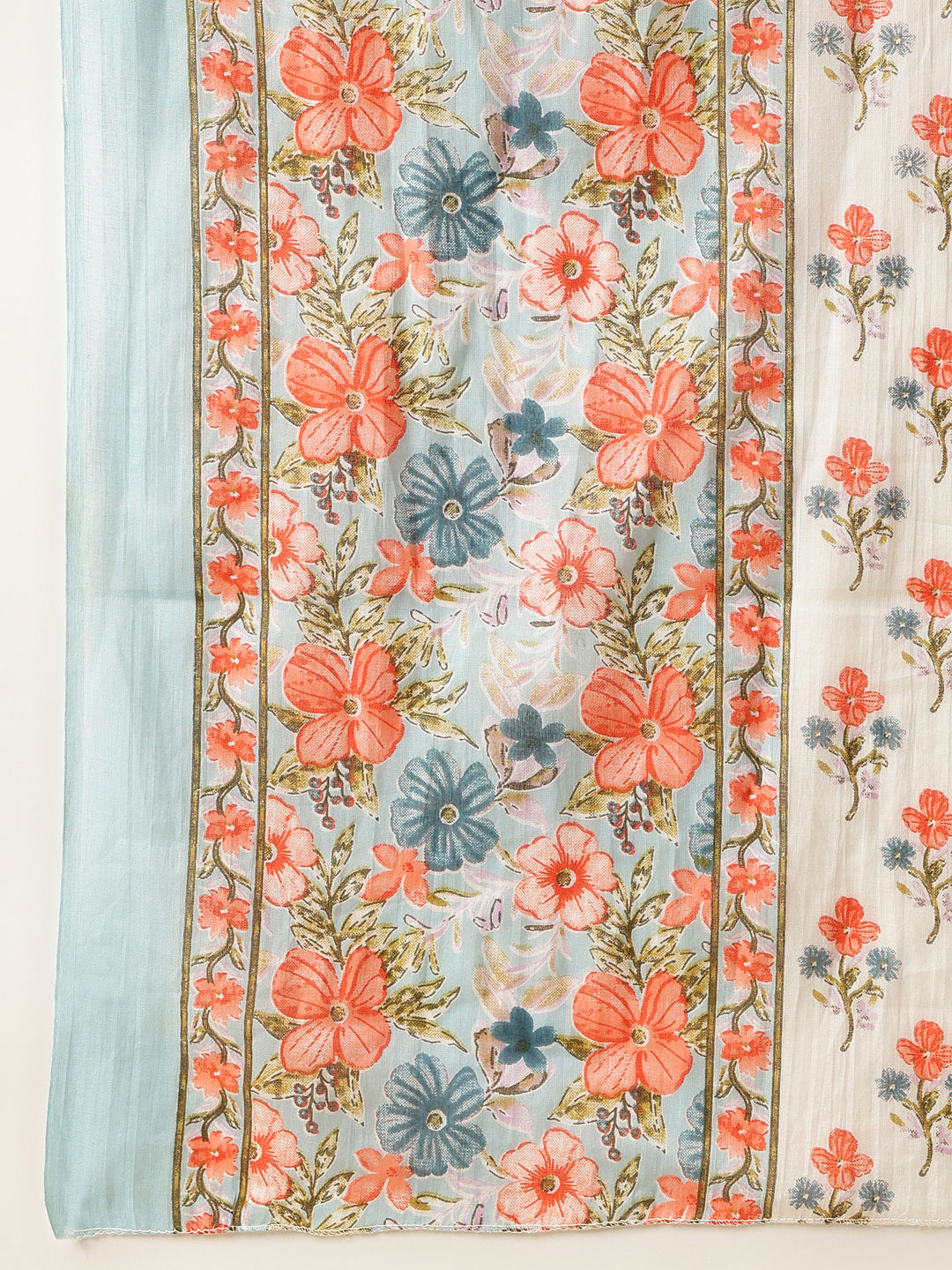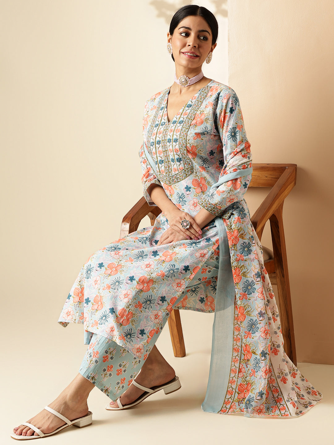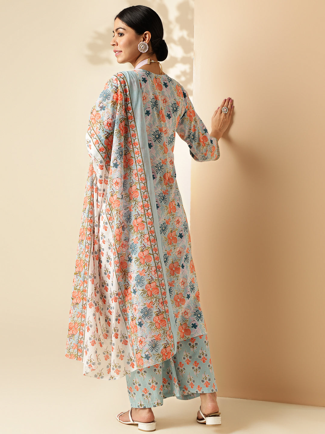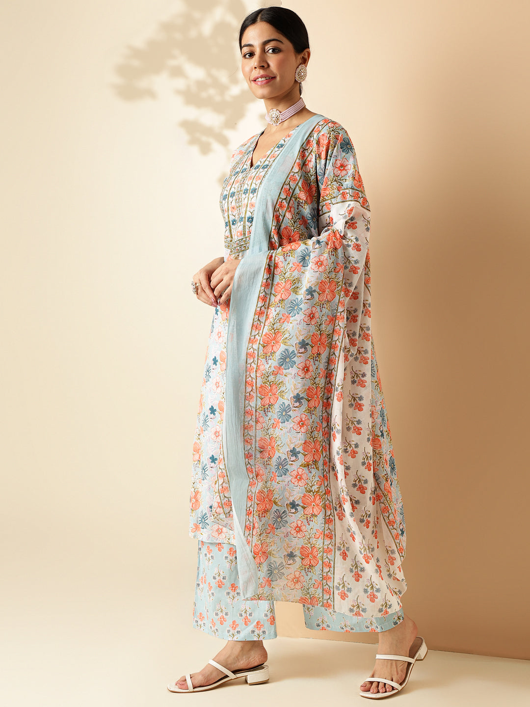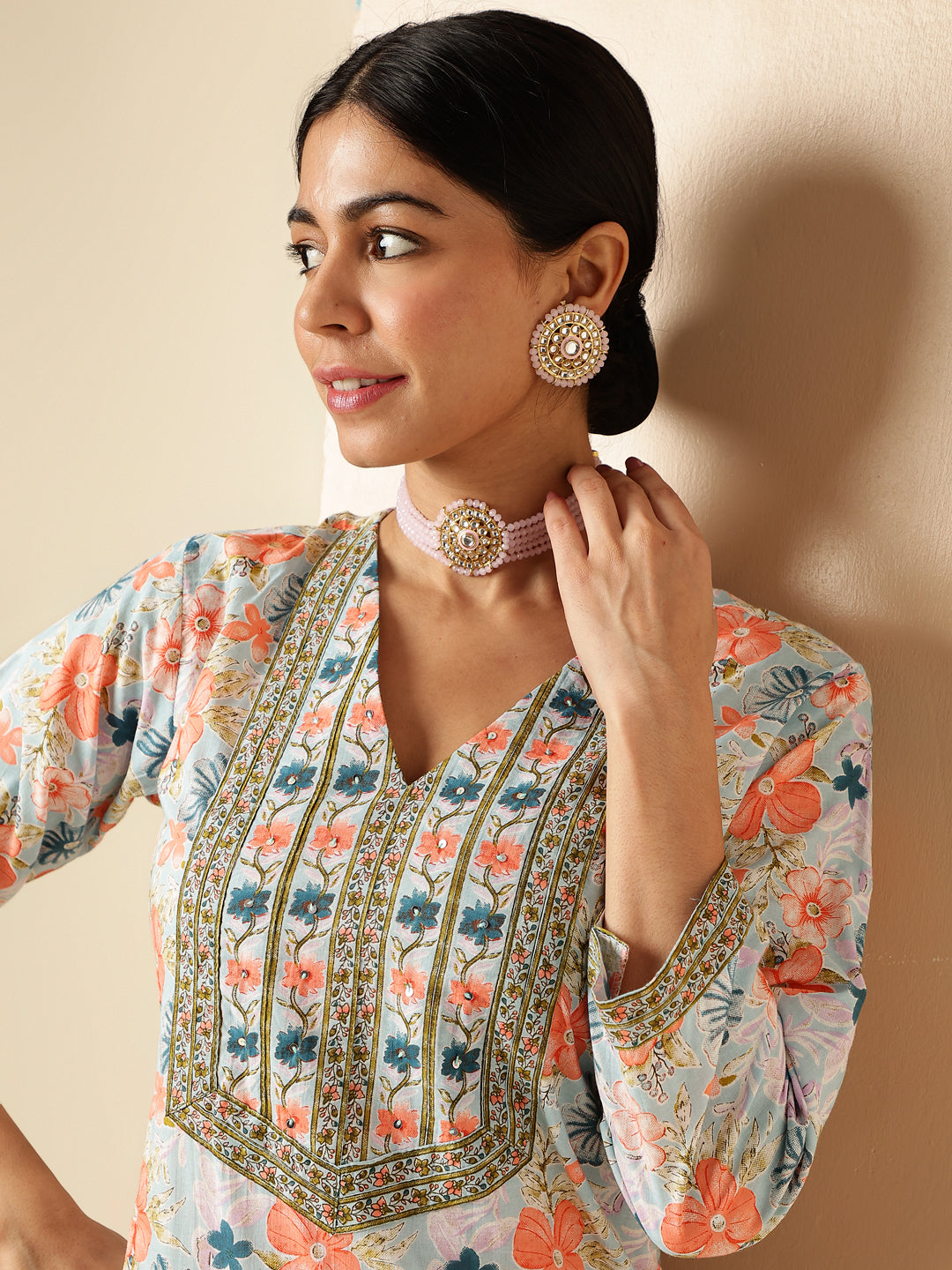 Sky Blue Floral Print Straight Cotton Kurta Set