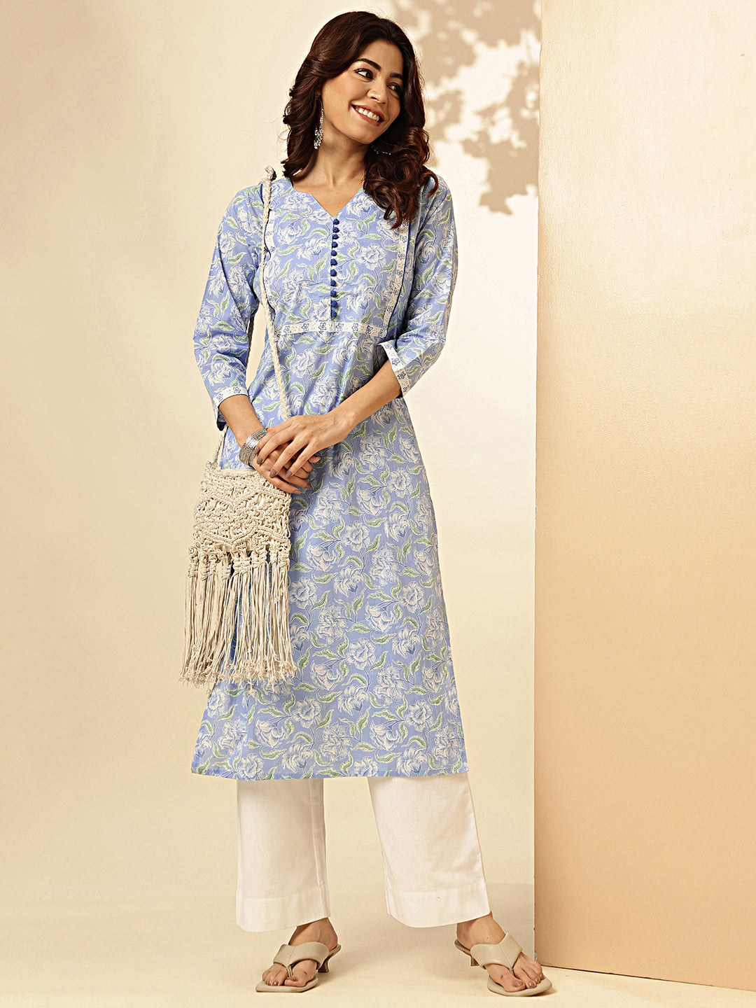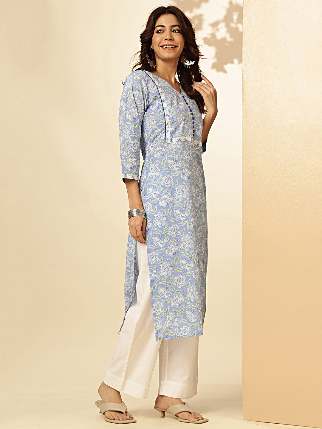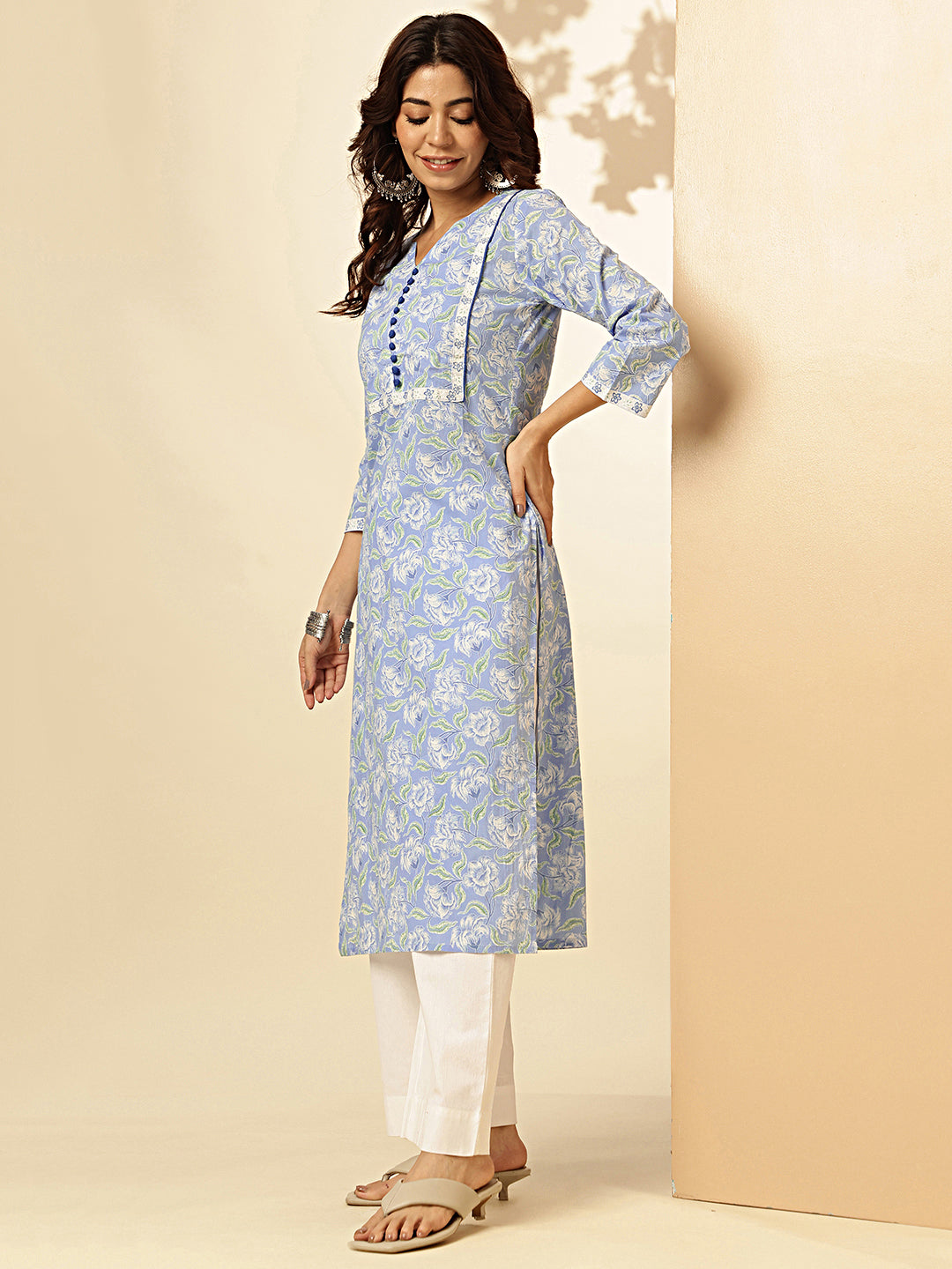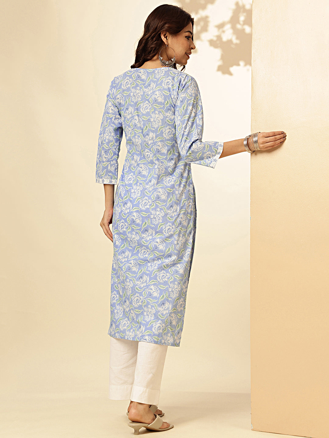 Sky Blue Floral Print Straight Cotton Stitched Kurta