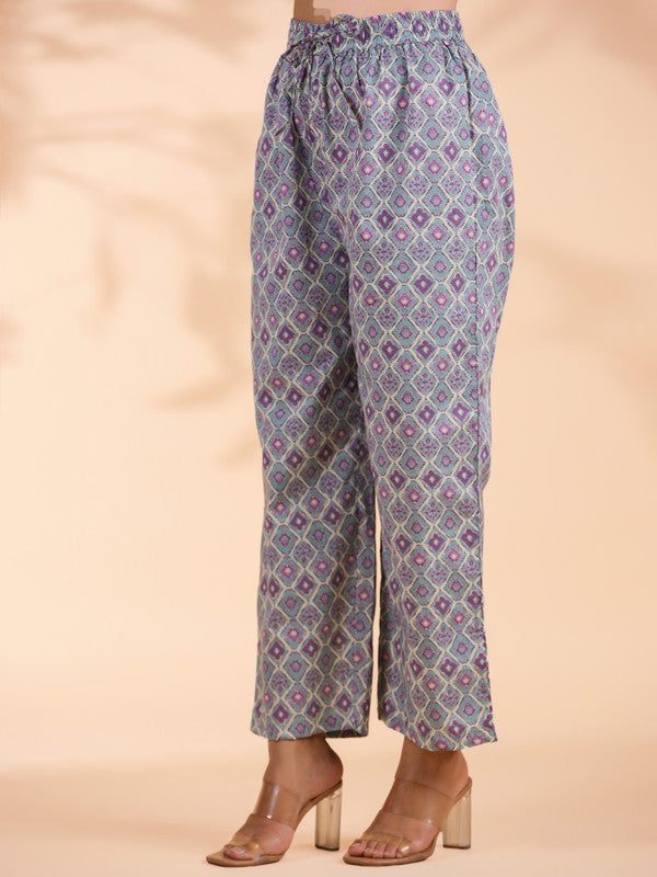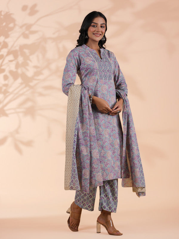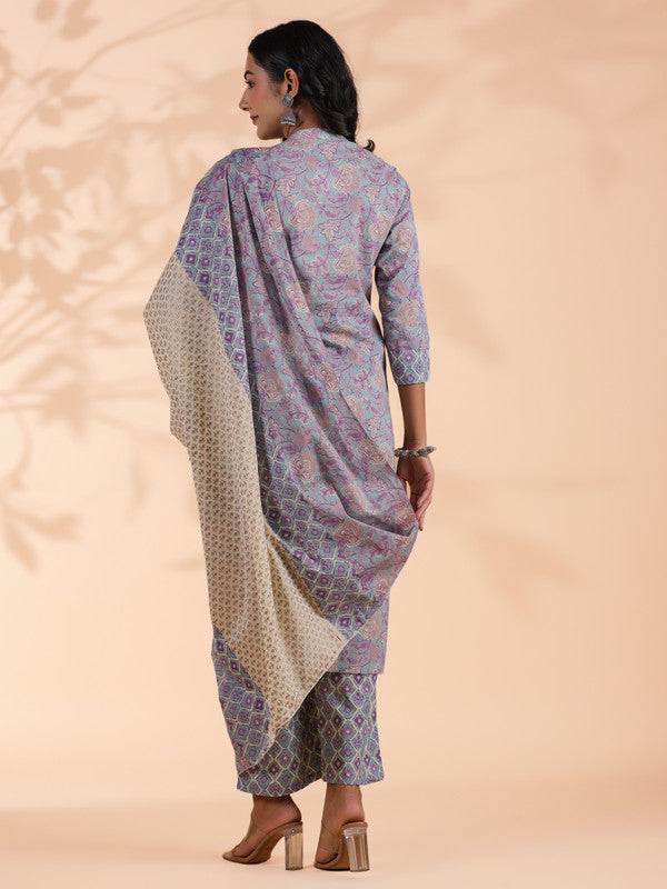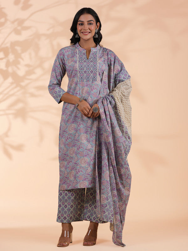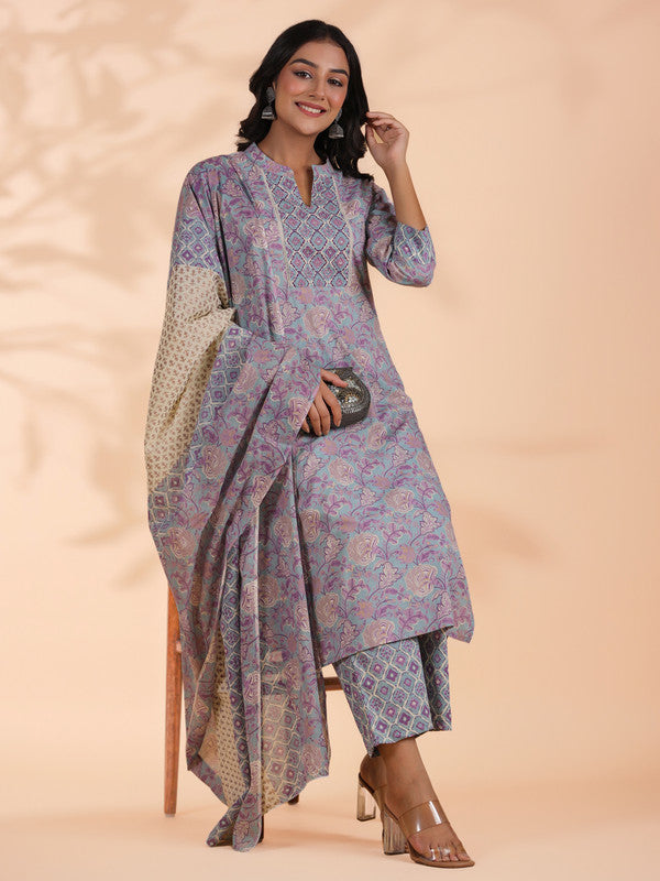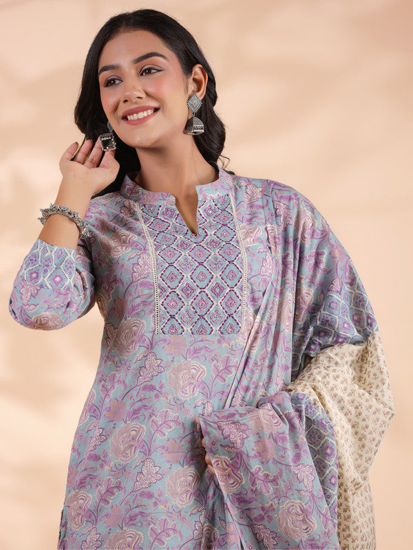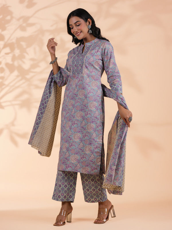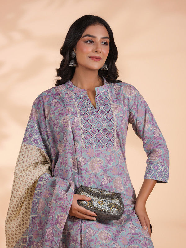 Sky Blue Floral Print Straight Cotton Stitched Kurta Set