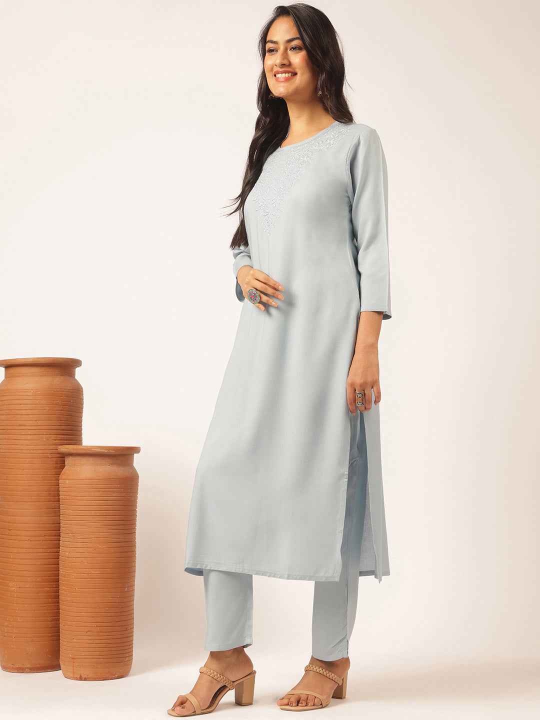 Step out in style with our Sky blue Rayon Solid Straight Kurta Set. Crafted from high-quality fabric, this set is perfect for a casual day out or a special occasion. Its solid color and straight cut give it a timeless look, while the soft Rayon material ensures comfort all day long. Elevate your wardrobe with this must-have piece!
