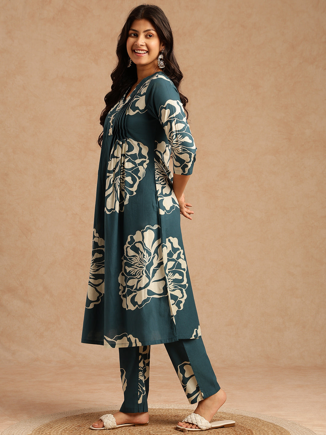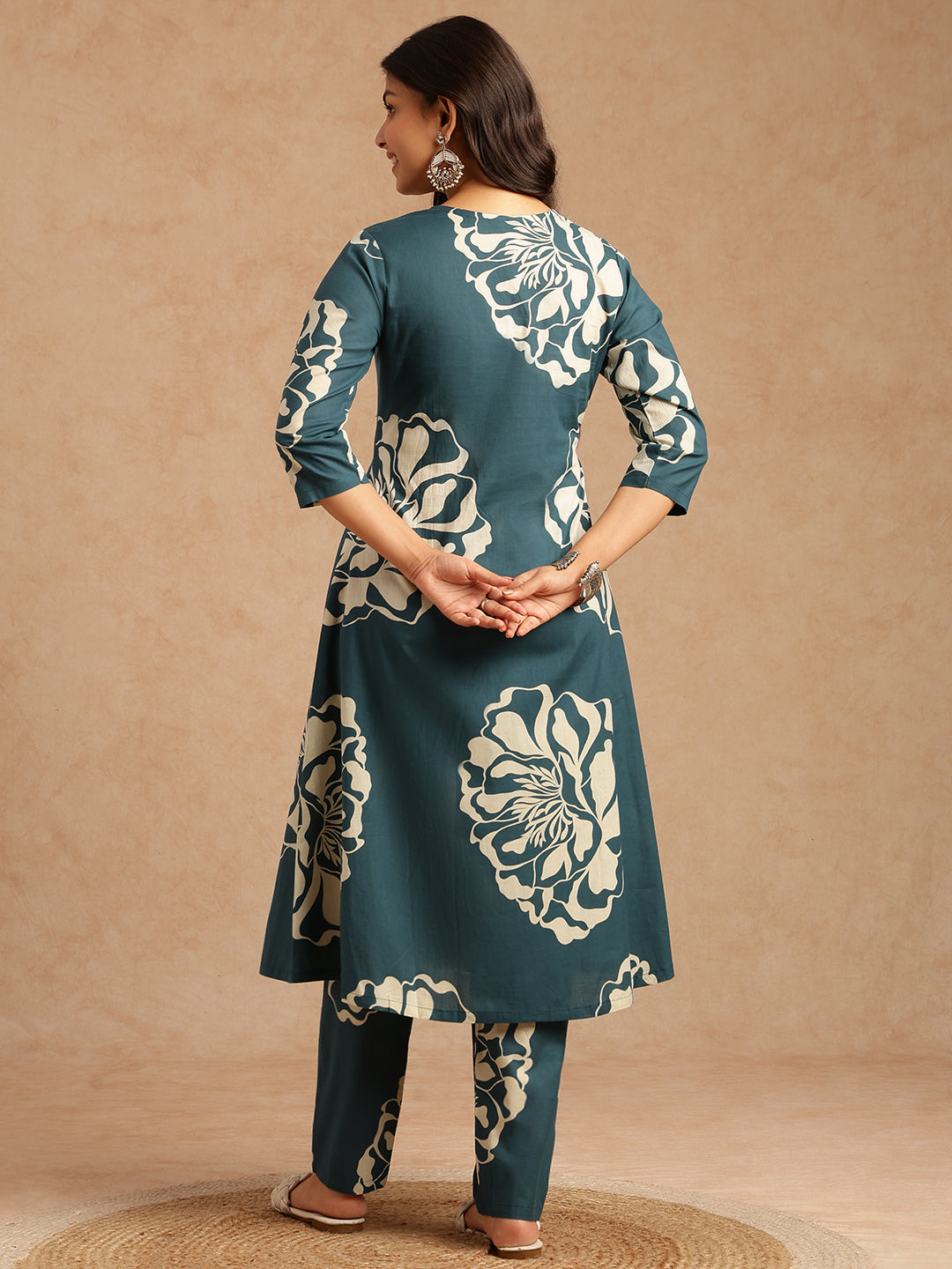 Teal Floral Print A-Line Cotton Stitched Kurta Set
