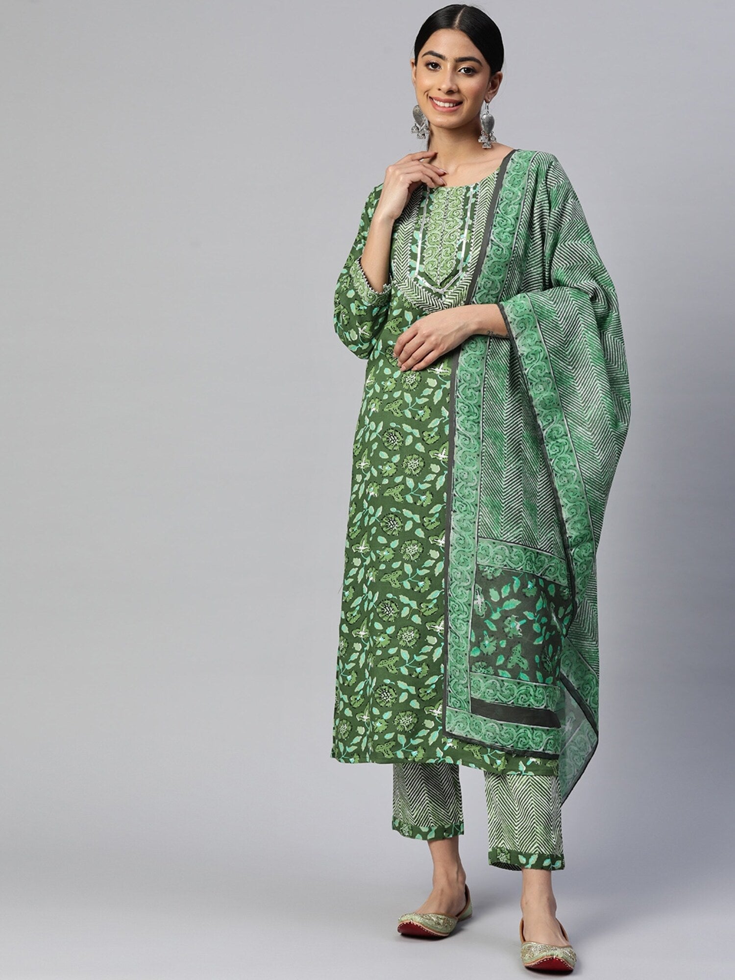 Vbuyz Women's Gota Patti Work Straight Cotton Green Stitched Kurta Pant With Dupatta is a stylish and comfortable outfit. It is made from high-quality cotton fabric and features intricate Gota Patti work. The kurta has a straight cut and is stitched to perfection. The pant is tailored to fit perfectly and the dupatta adds a touch of elegance to the ensemble. This outfit is perfect for any occasion and is sure to make you look your best.