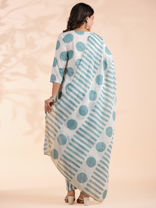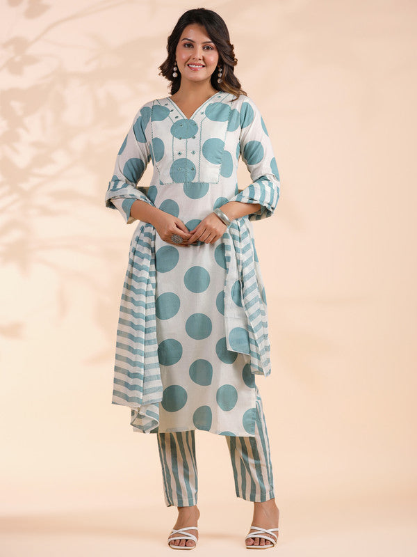 White And Aqua Polka Print & Mirror Work Straight Cotton Stitched Kurta Set