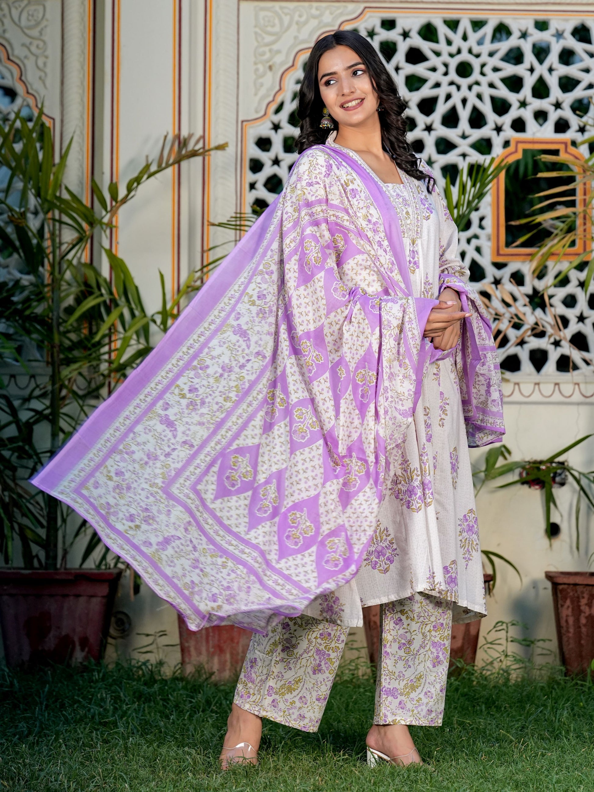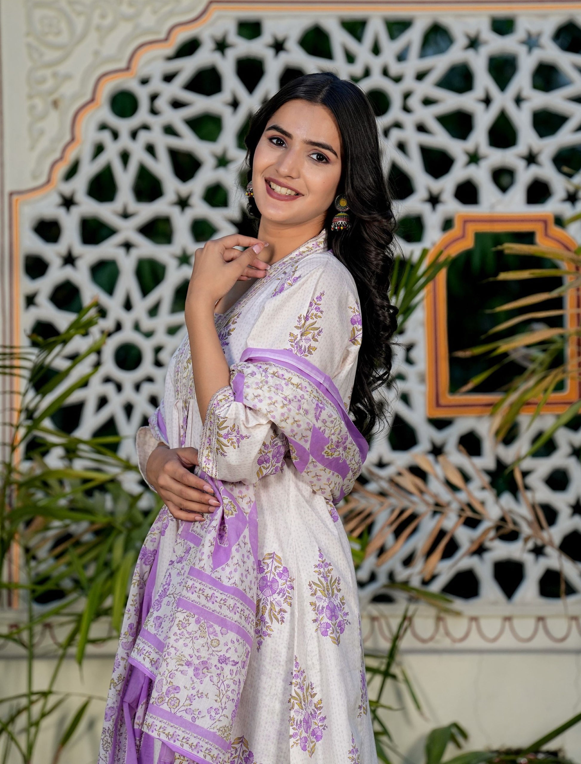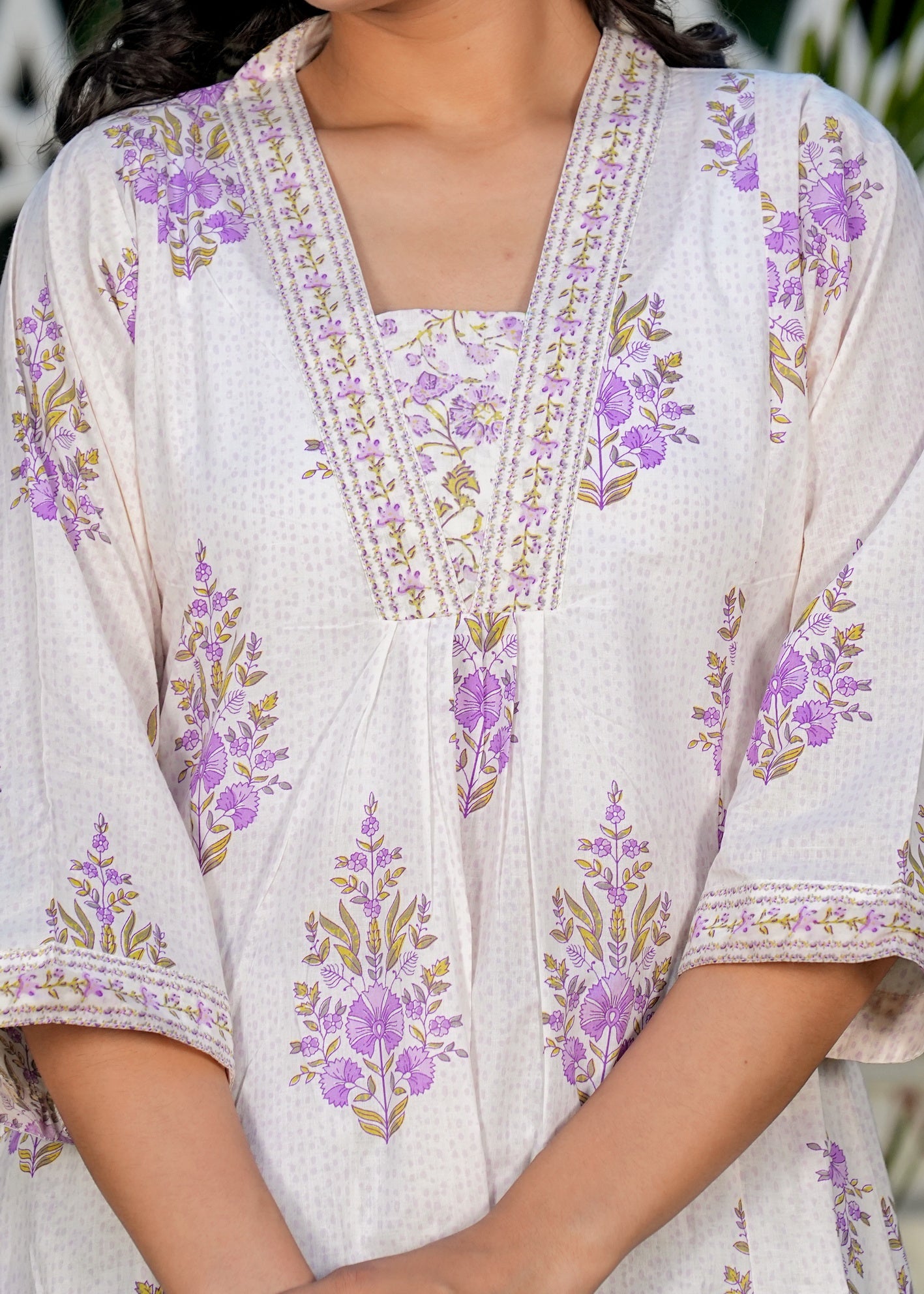 White And Purple Floral Printed A-Line Cotton Kurta Set