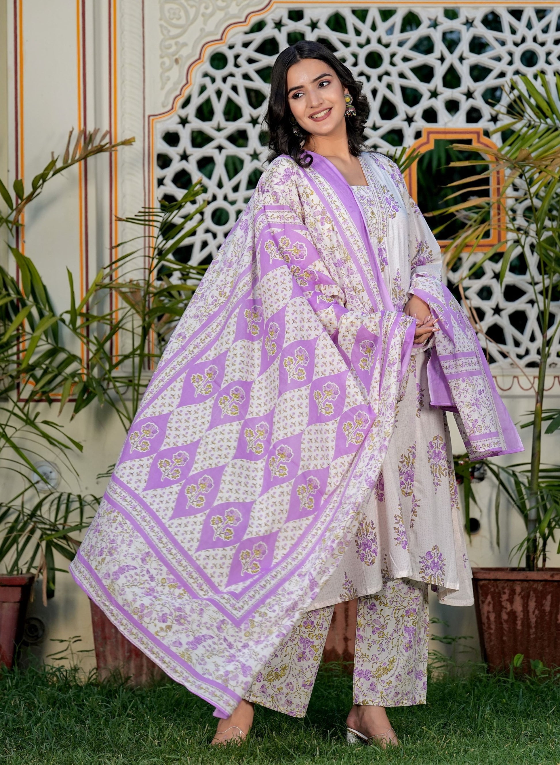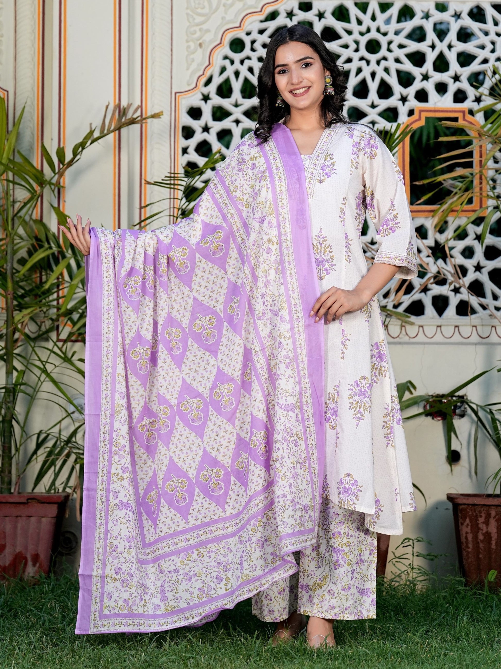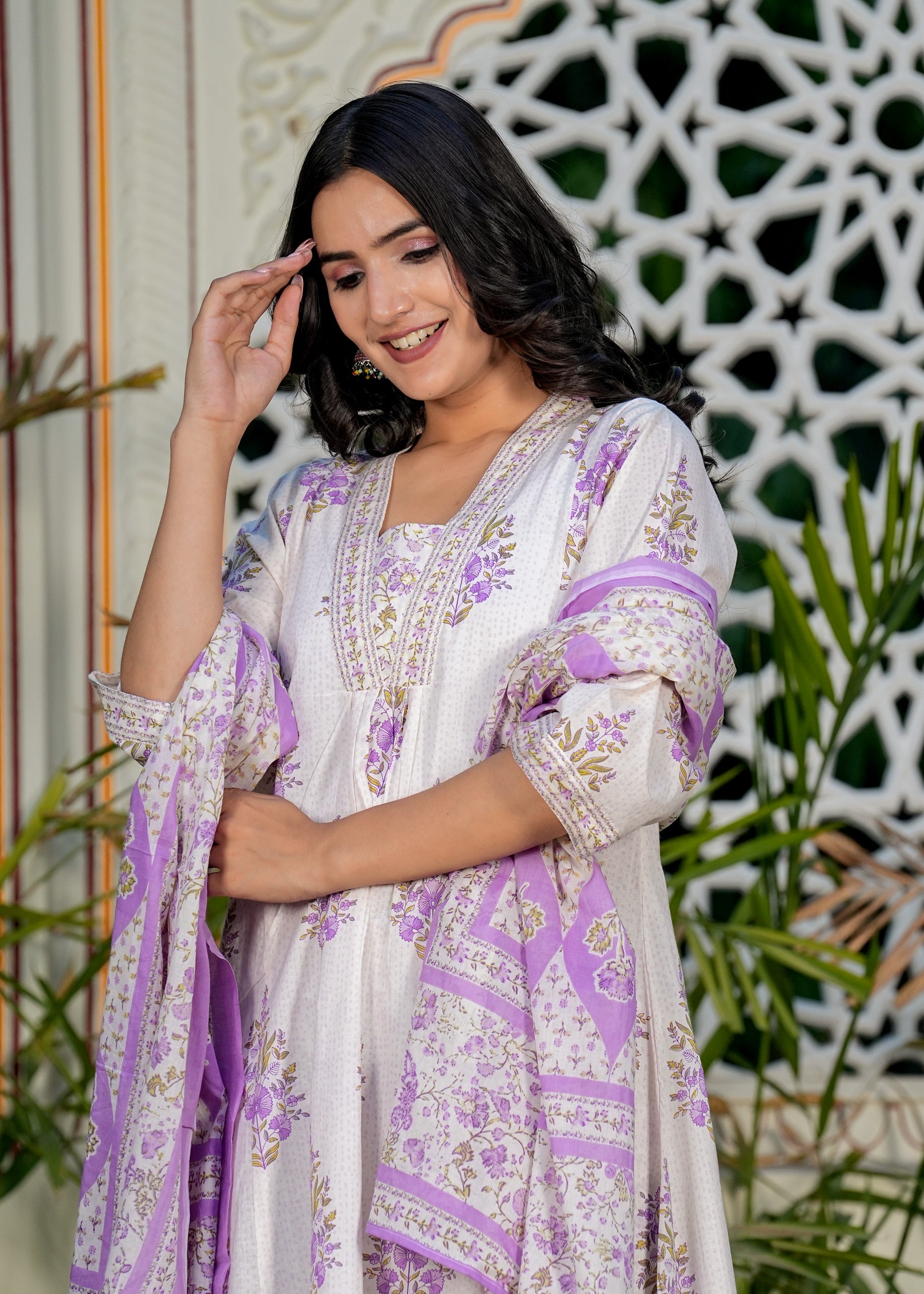 White And Purple Floral Printed A-Line Cotton Kurta Set